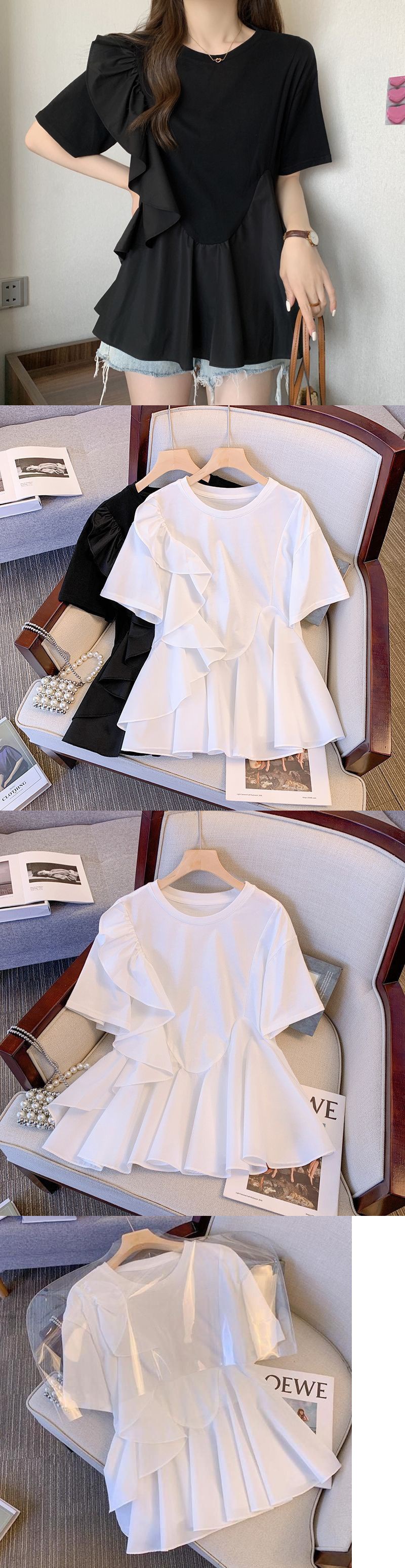 플러스 사이즈 여성의 새로운 중국 스타일 러플 반팔 티셔츠 여성의 2024 년 여름 새로운 슬림 배꼽 커버 크루 넥 탑스토어 가기