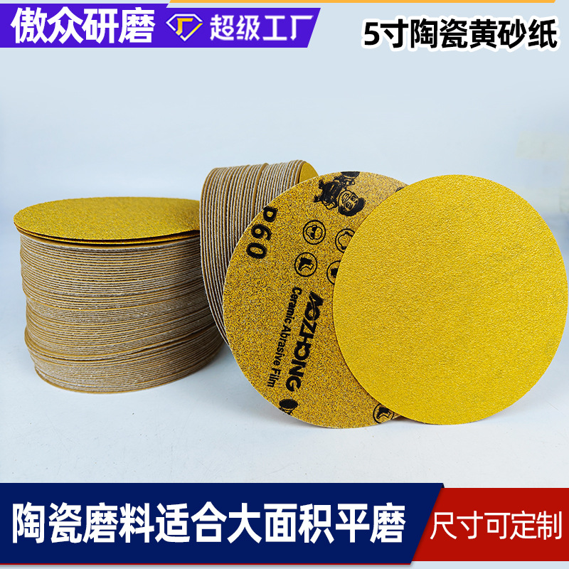 공장 도매 폴리 에스테르 필름 사포 5 인치 노란색 모래 세라믹 연마 모래 flocking 폴리 에스테르 필름 사포