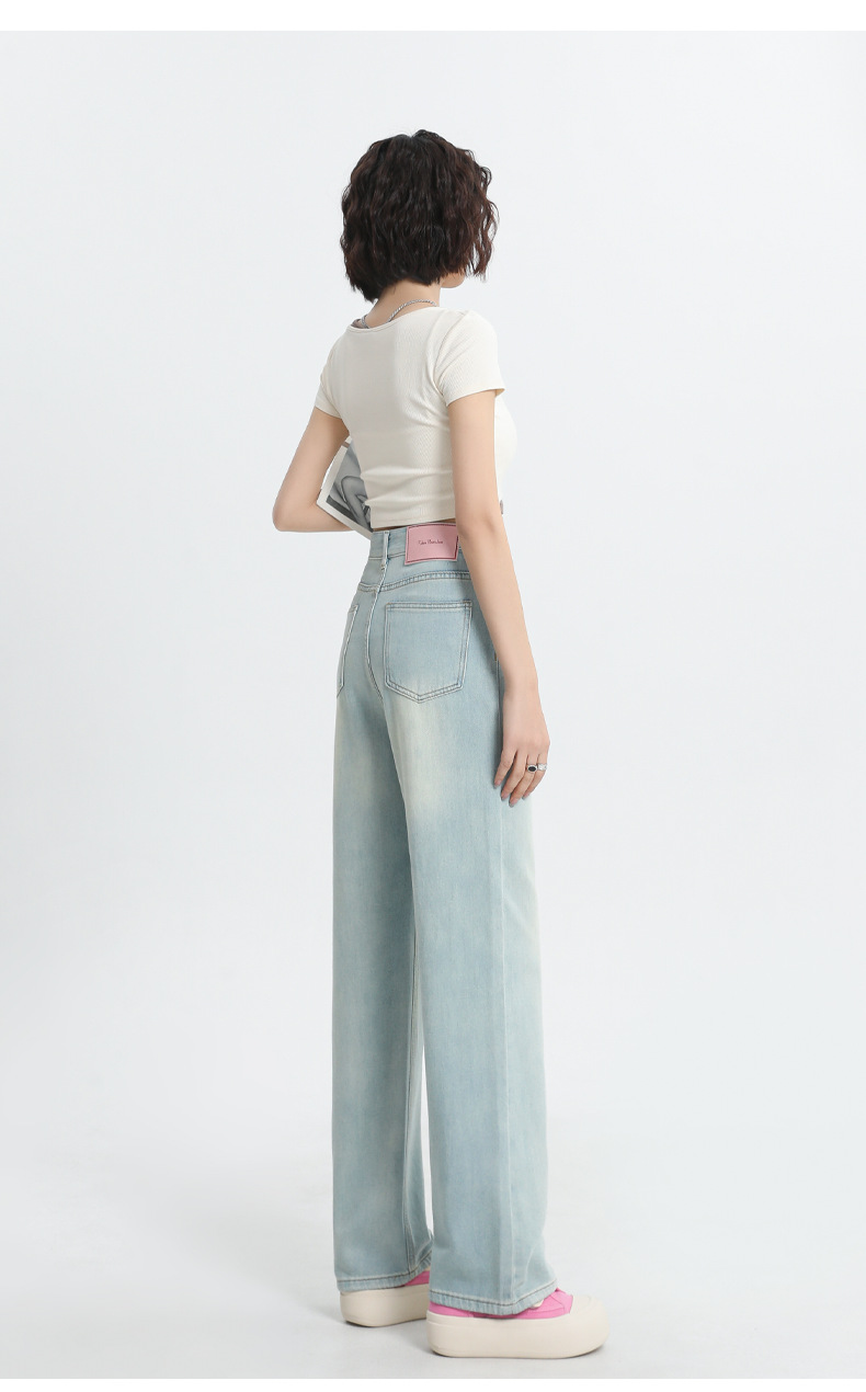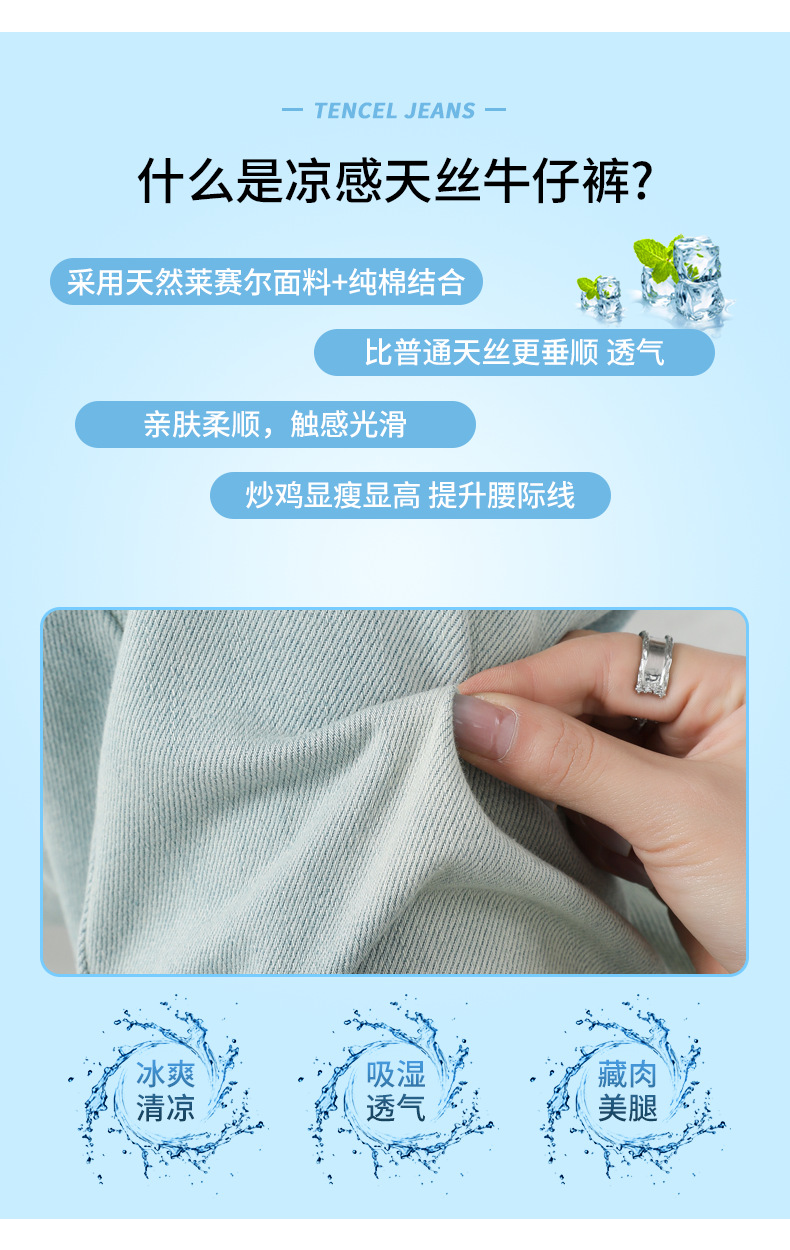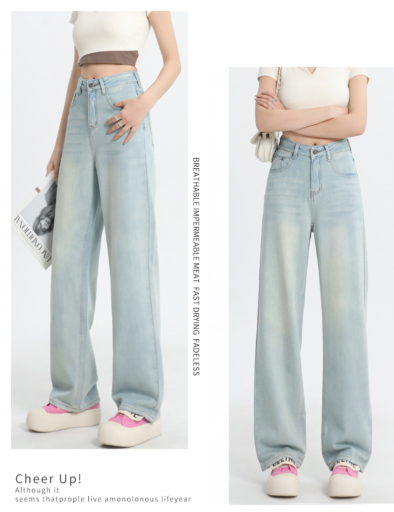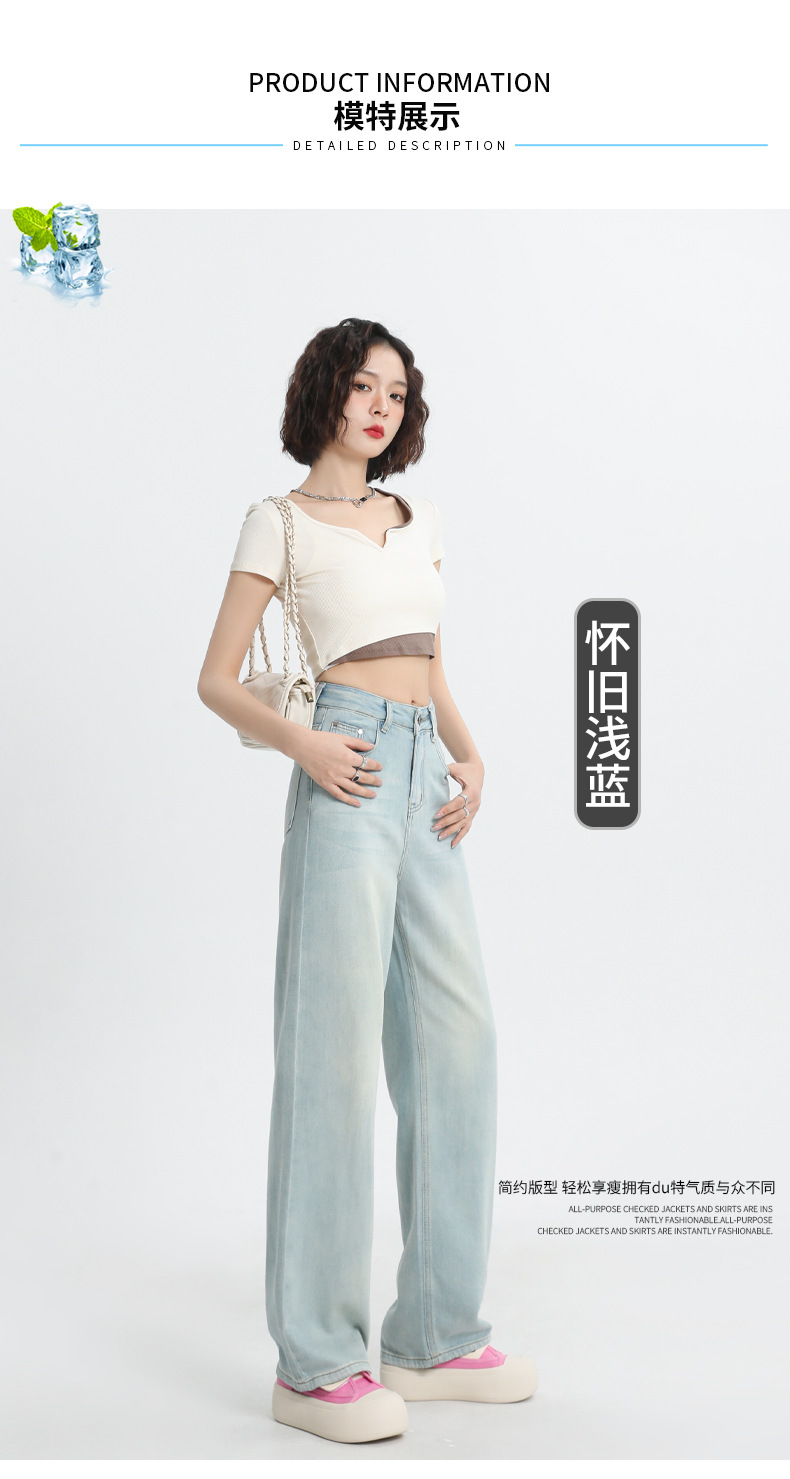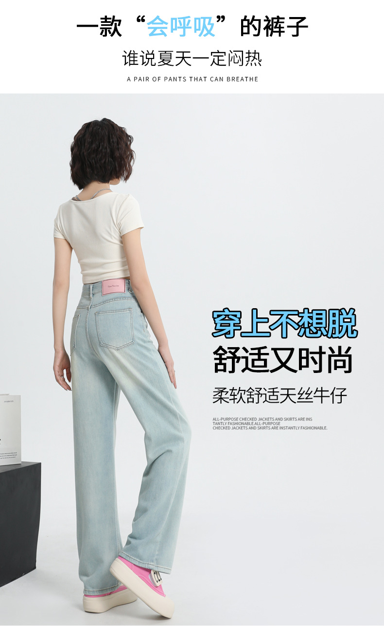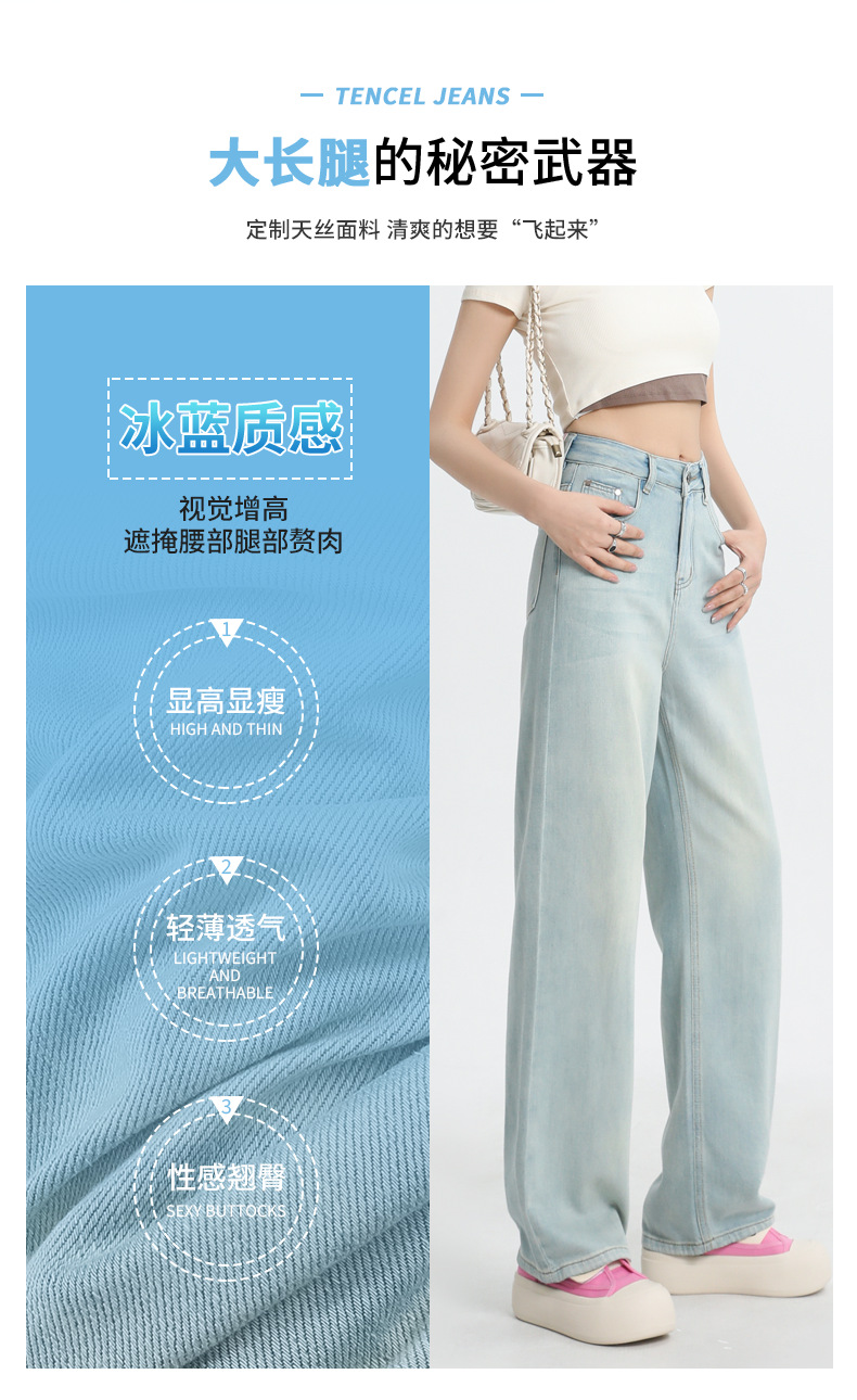 블루 텐셀 스트레이트 청바지 여성의 2024 년 여름 새로운 얇은 자수 높은 허리 느슨한 슬림 넓은 다리 바지