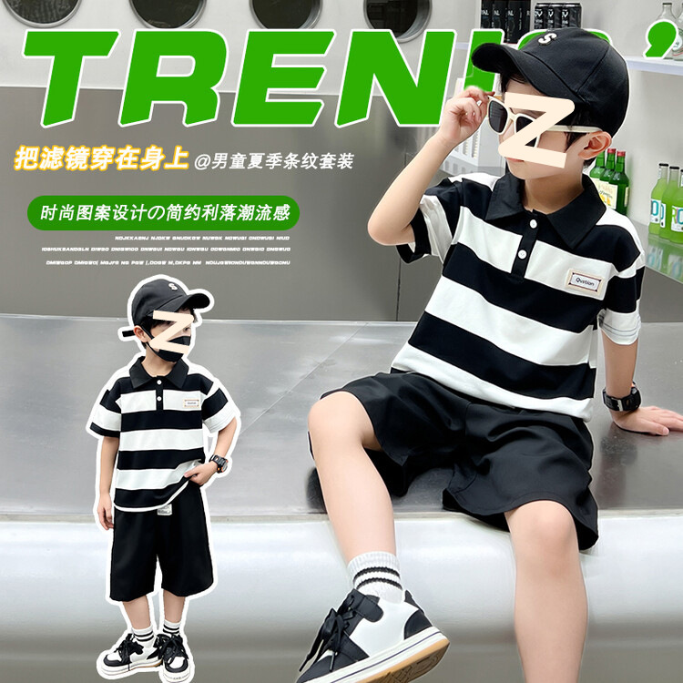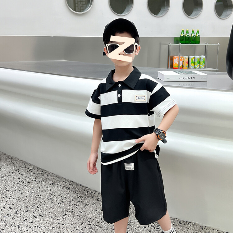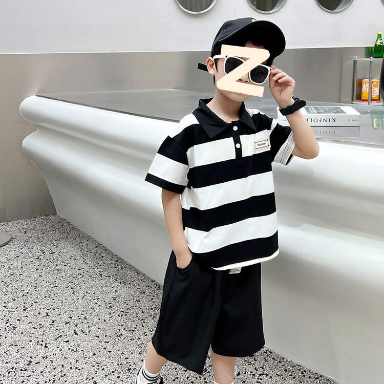 남학생 여름 줄무늬 POLO 셔츠 반바지 투피스 2024 새로운 중소 어린이 잘 생긴 소년 스포츠 세트 조수스토어 가기
