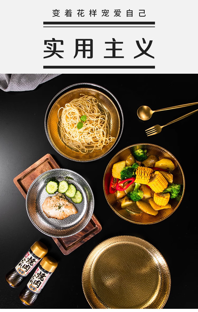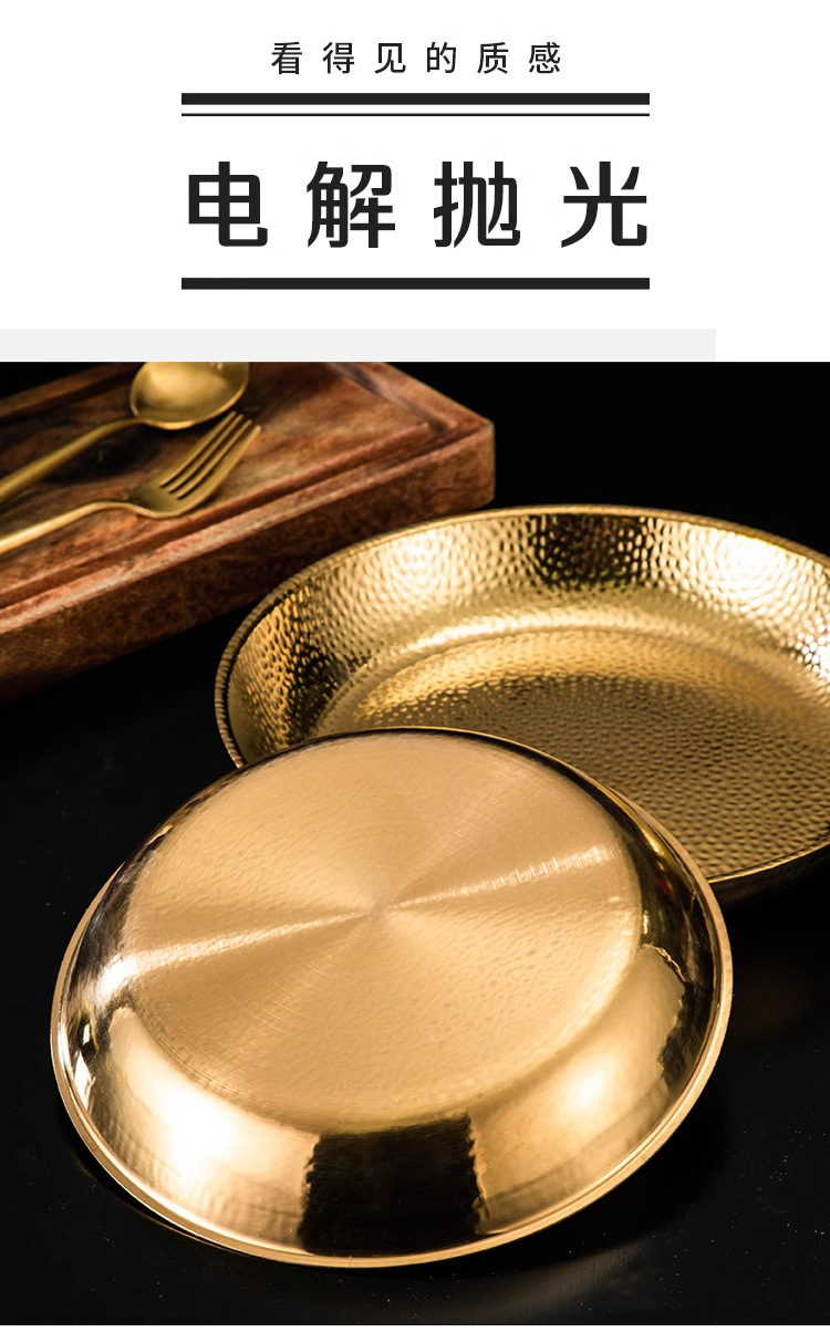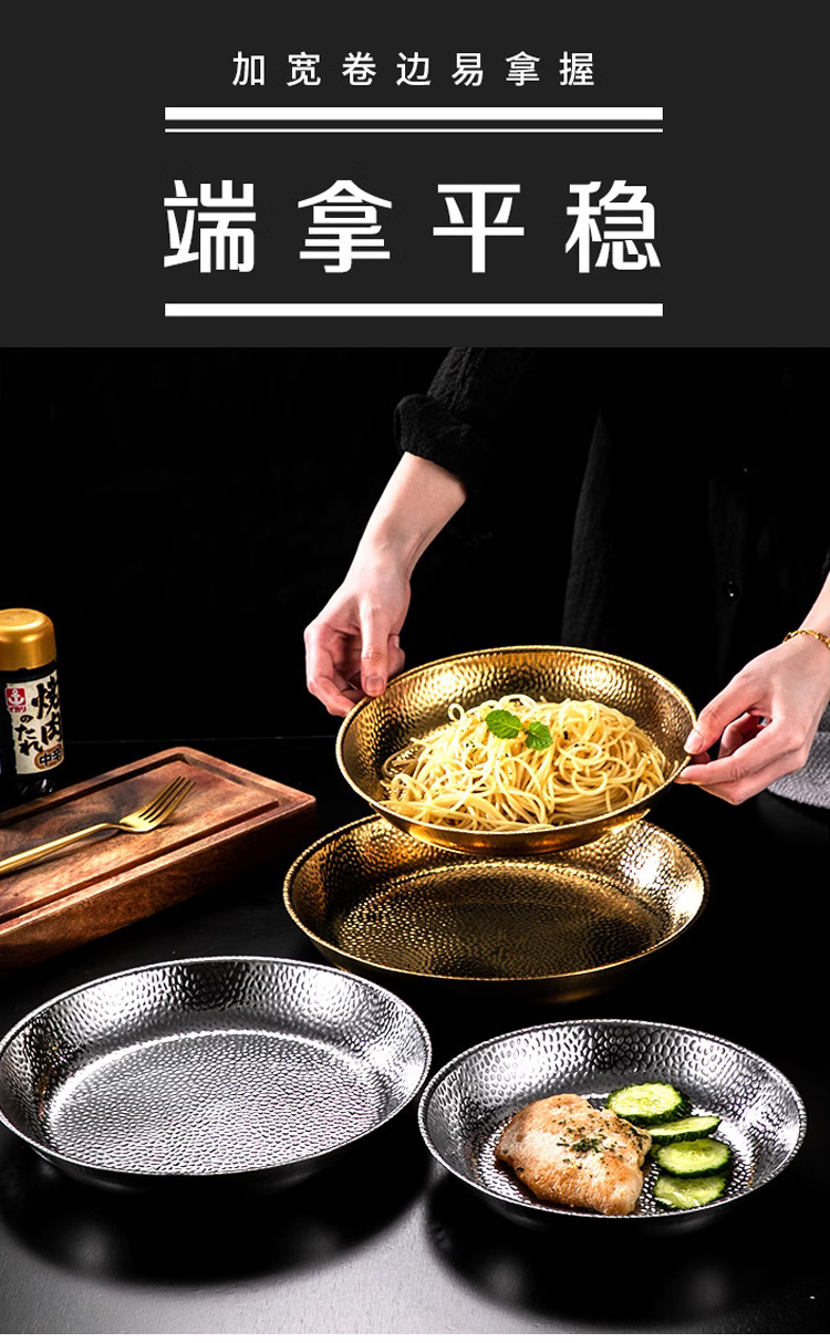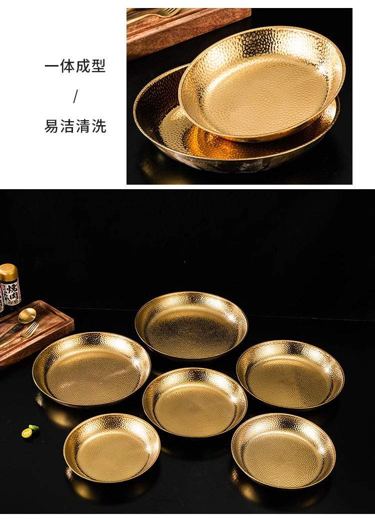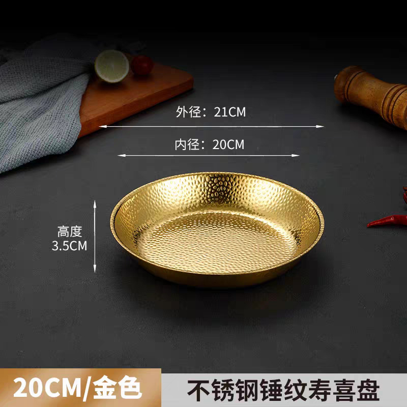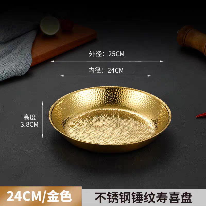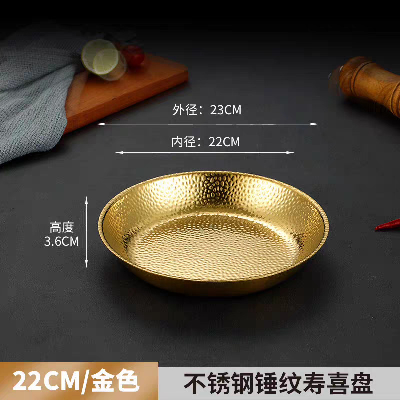 한국식 두꺼운 스테인레스 스틸 플레이트 해머 패턴 디스크 골든 플랫 하단 트레이 과일 플레이트 접시 바베큐 플레이트 웨스턴 푸드 플레이트스토어 가기