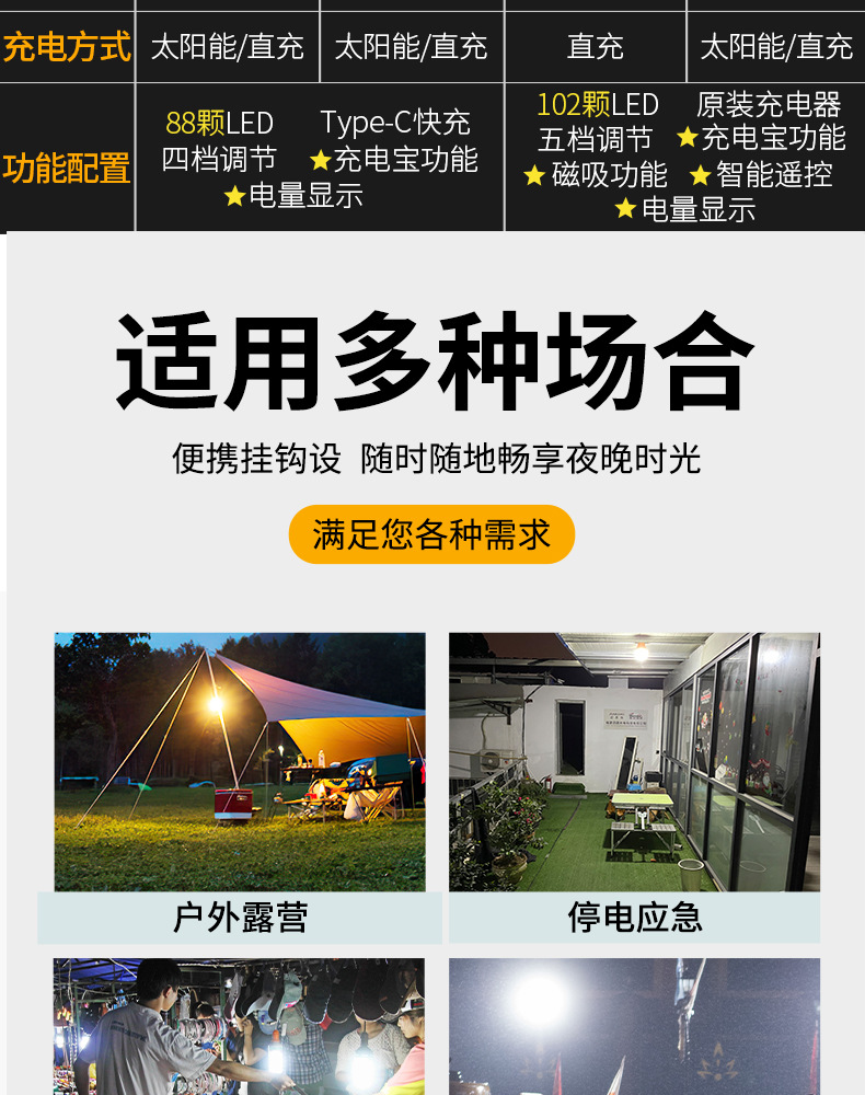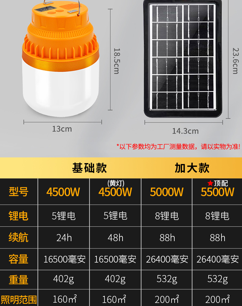 • 뛰어난 비용 성능, 매우 밝은 모델 2000W, 배터리 수명 48H, 100개 조명㎡USB가 포함된 전자 디스플레이