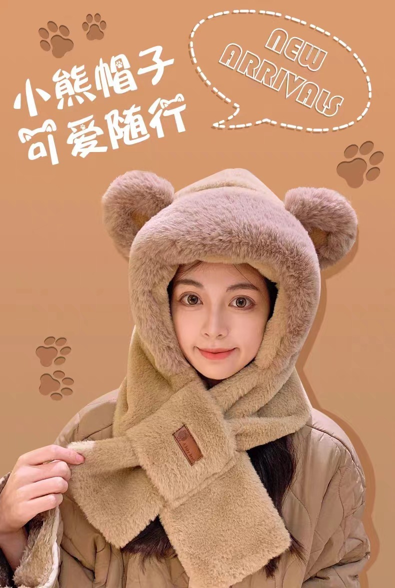 플러시 곰돌이 모자와 스카프 일체형 자전거용 방풍 귀마개 두꺼운 보온 다용도 니트 성인용스토어 가기