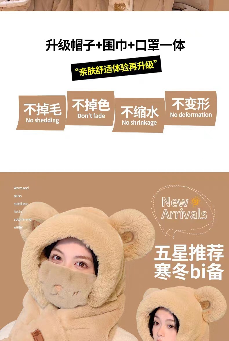 • 秋冬季帽子女加绒加厚户外骑行防风帽围脖口罩一体护耳保暖套头帽