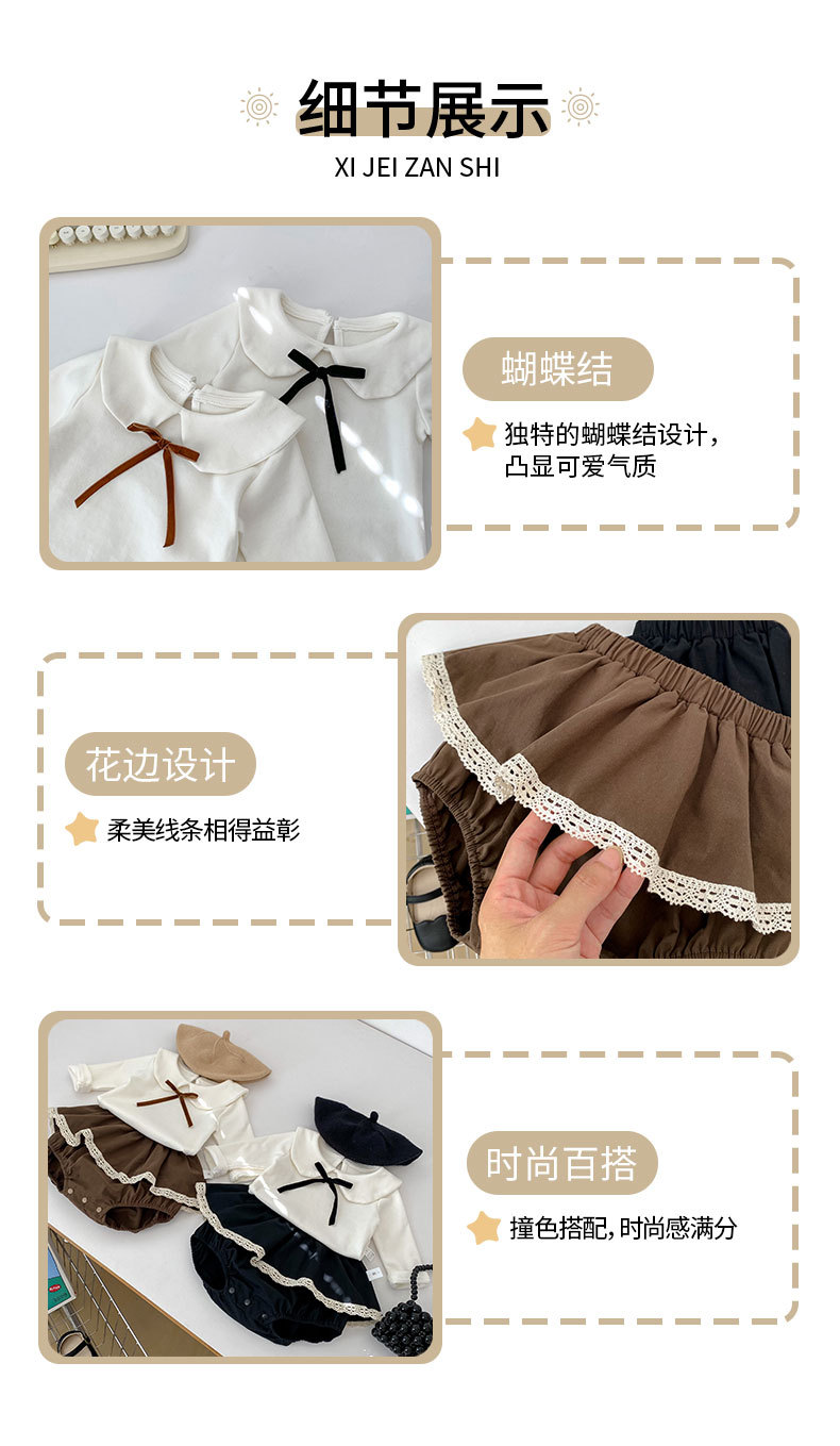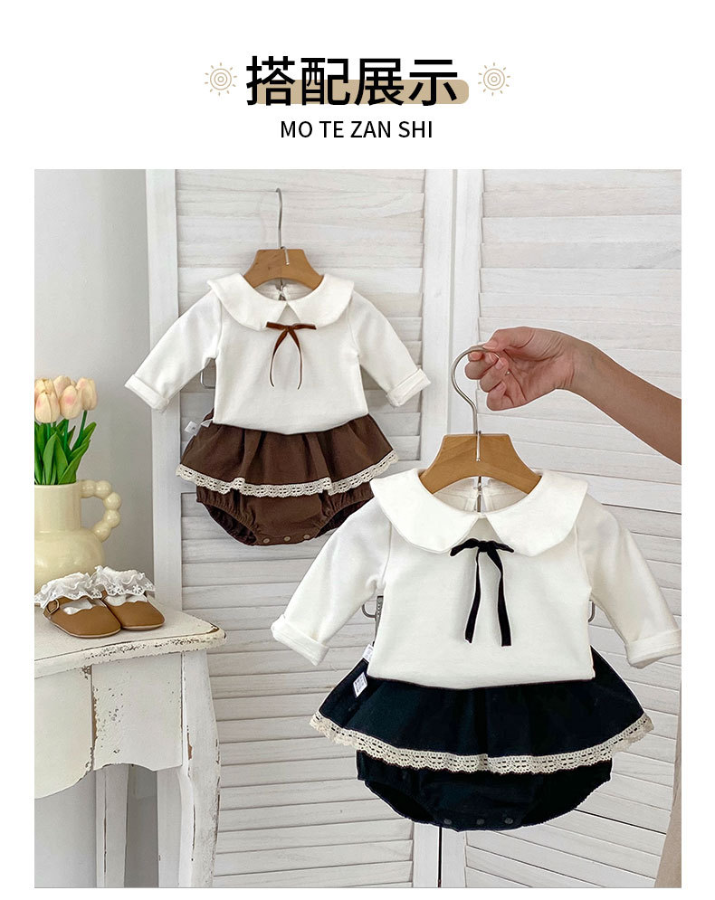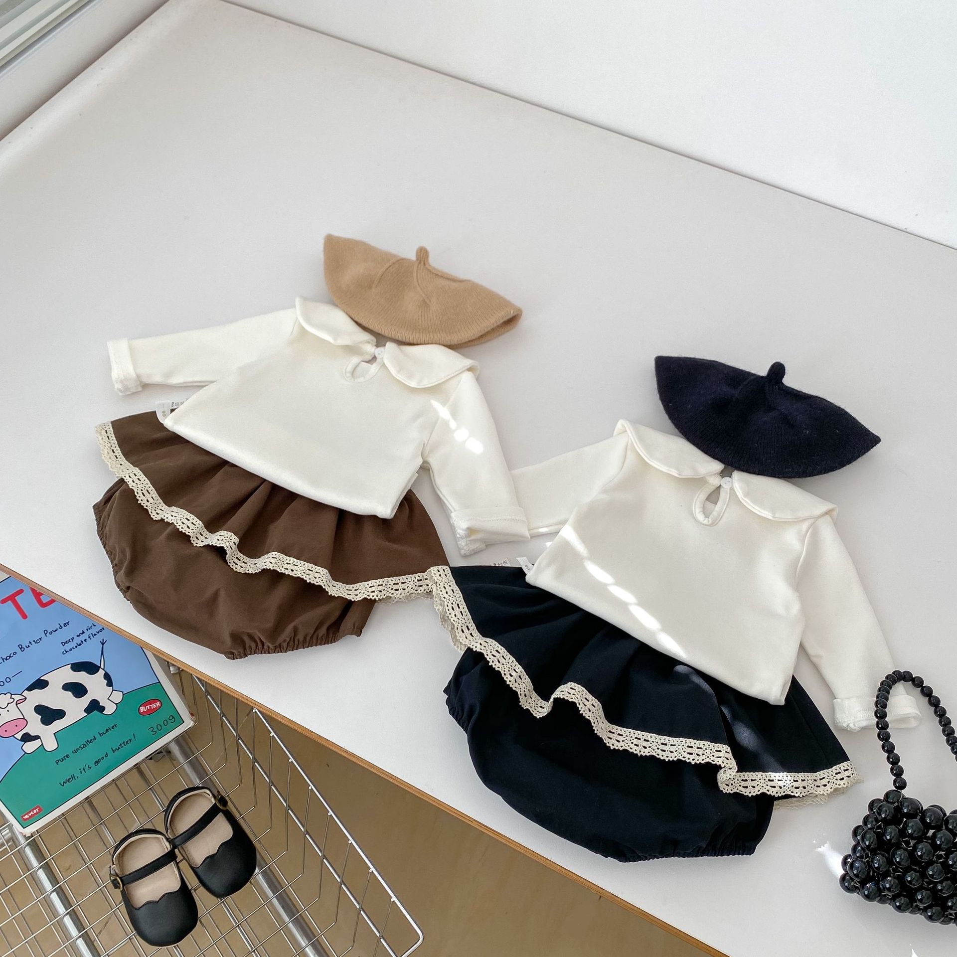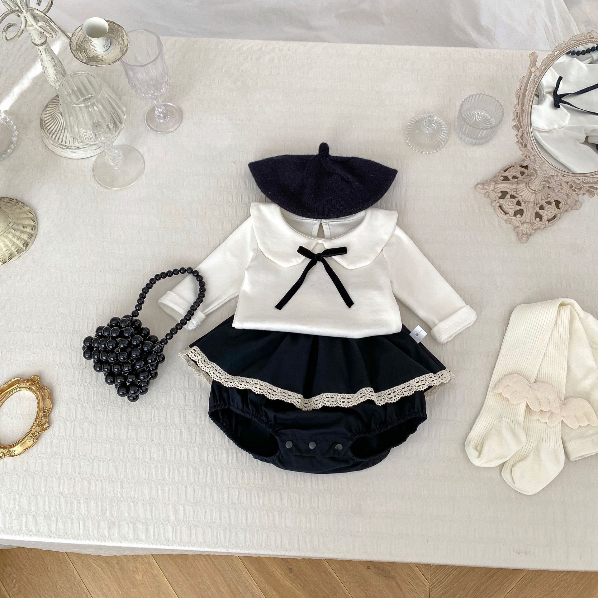 한국식 아기 옷 가을 아기 소녀 1-3 세 인형 목걸이 긴팔 탑 레이스 컬로 대조되는 투피스 세트
