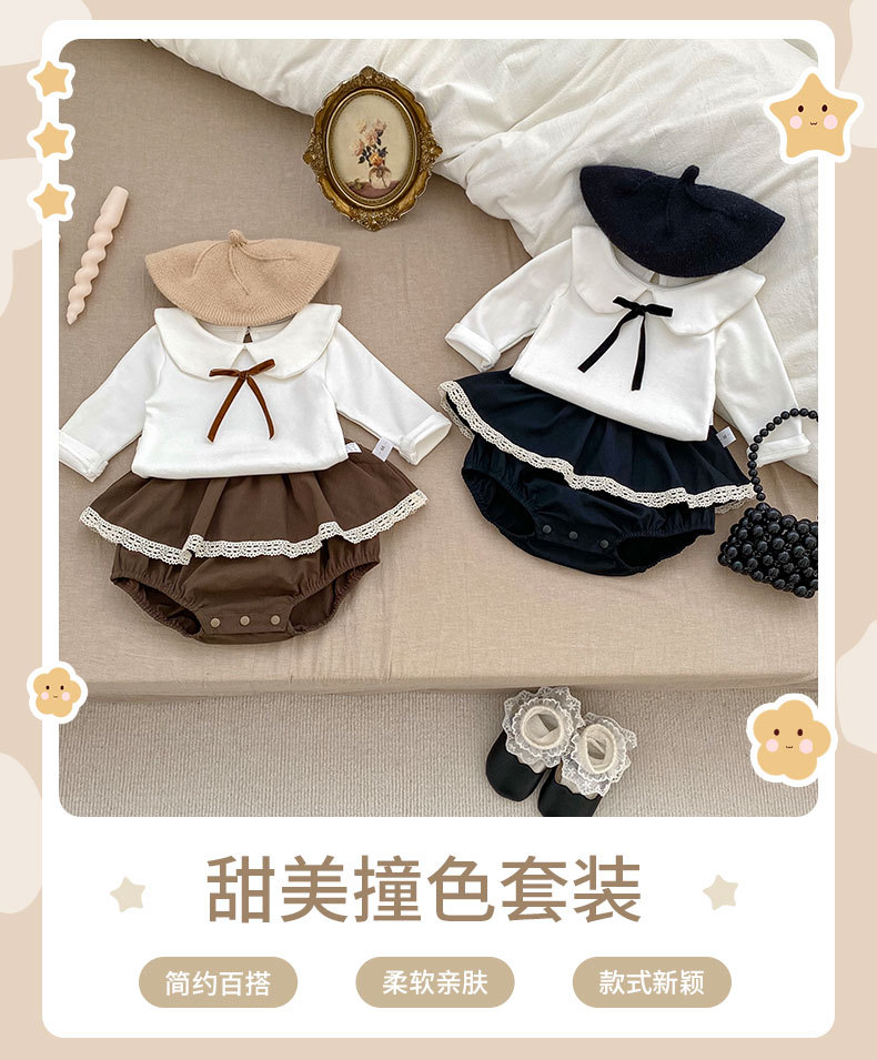 한국식 아기 옷 가을 아기 소녀 1-3 세 인형 목걸이 긴팔 탑 레이스 컬로 대조되는 투피스 세트스토어 가기
