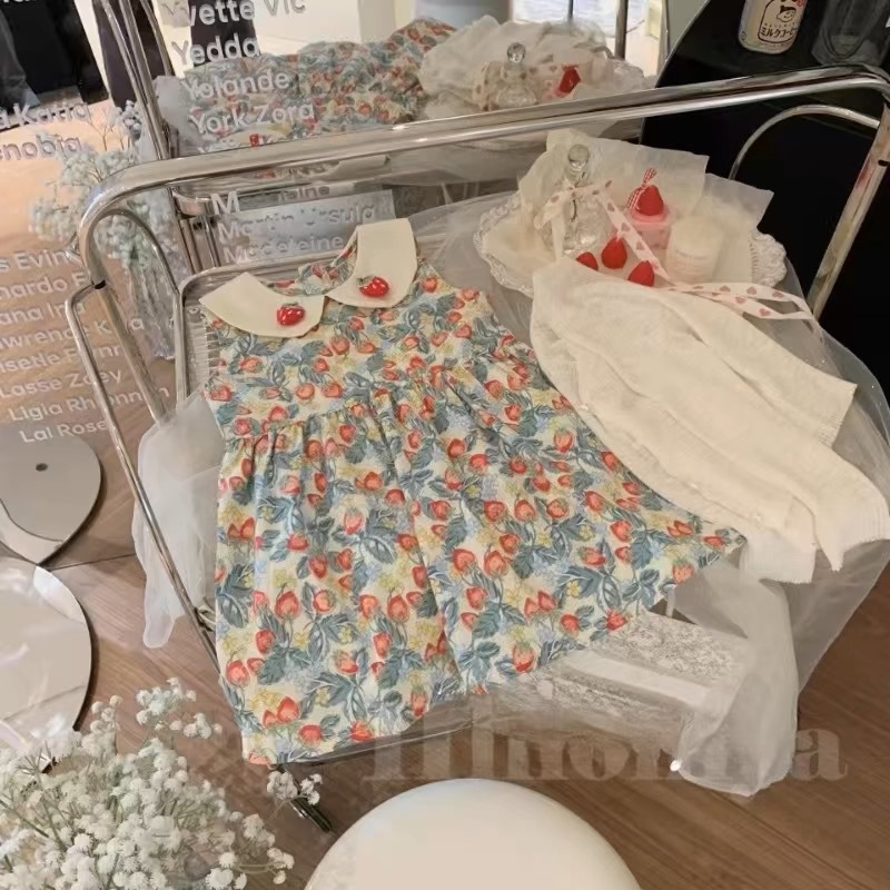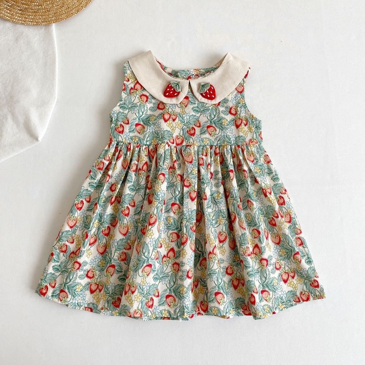 어린이 착용 소녀 딸기 수 놓은 원피스 2024 여름 새로운 어린이 달콤한 스타일 짧은 소매 공주 원피스스토어 가기