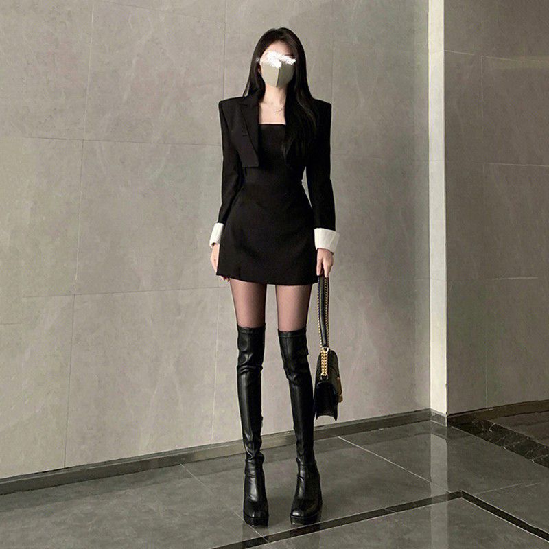 블랙 로얄 자매 스타일 작은 세트 원피스 여성의 봄 새로운 슬림 핏 타이트 허리 엉덩이 짧은 치마 패션 투피스 치스토어 가기