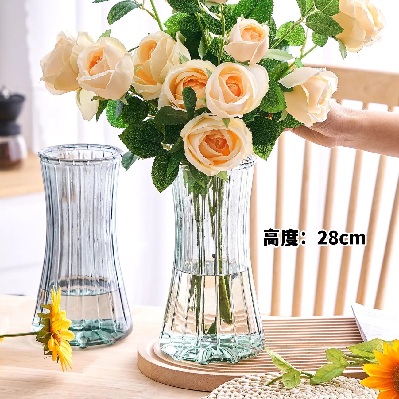유럽식 심플하고 창의적인 투명 유리 꽃병, 고급스러운 장미꽃, 가벼운 럭셔리 꽃꽂이, 거실 테이블 장식품