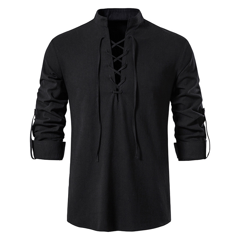 중세 남성면 및 리넨 헨리 셔츠 긴팔 히피 캐주얼 비치 칼라 셔츠 유럽 및 미국 국경 간 서랍 셔츠