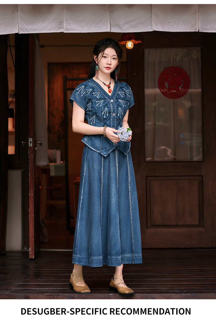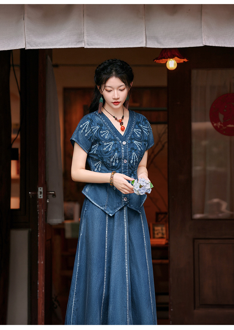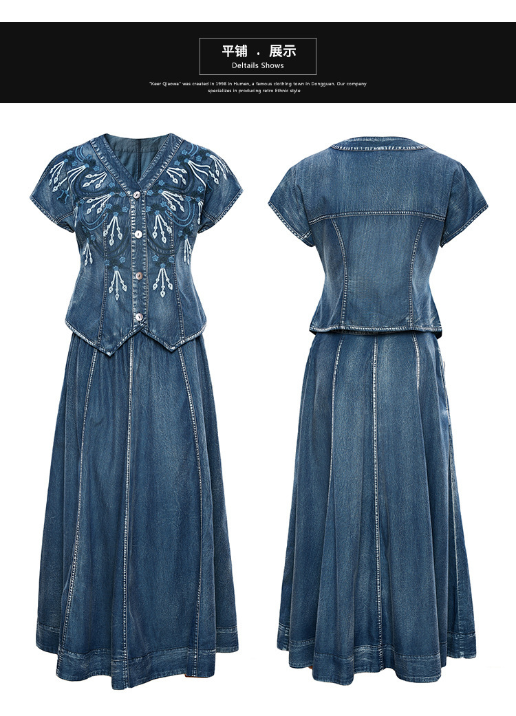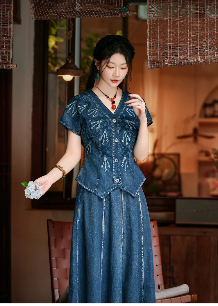 2024 여름 새로운 빈티지 국가 스타일 데님 세트 여성용 헤비 자수 셔츠 스커트 투피스 B9382