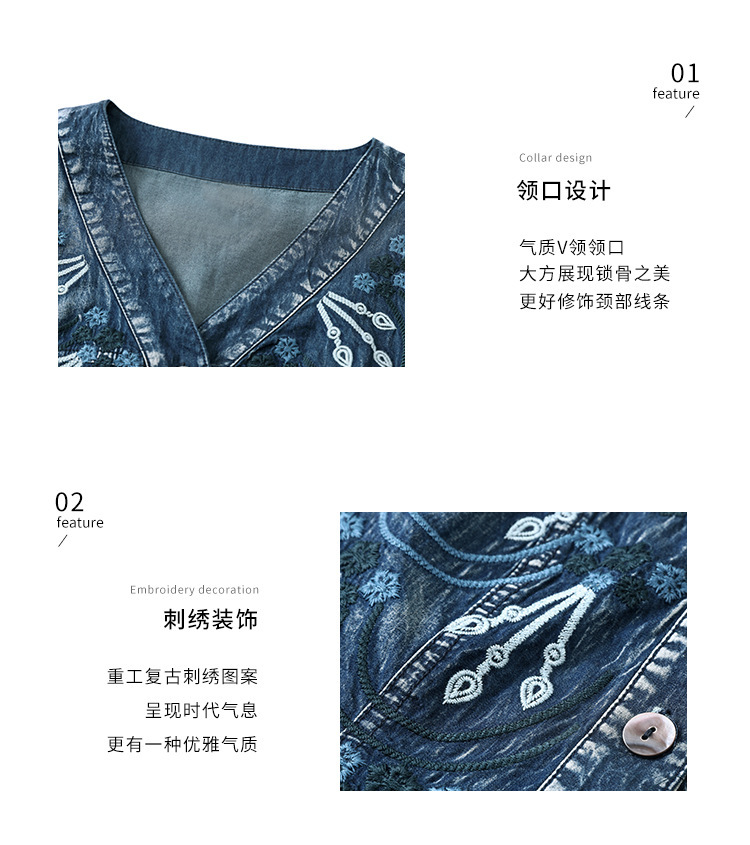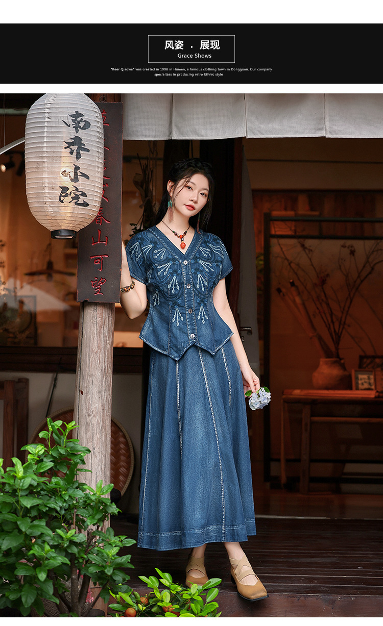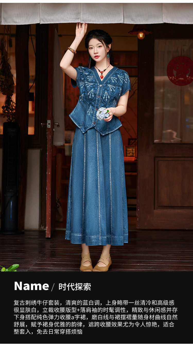 2024 여름 새로운 빈티지 국가 스타일 데님 세트 여성용 헤비 자수 셔츠 스커트 투피스 B9382스토어 가기