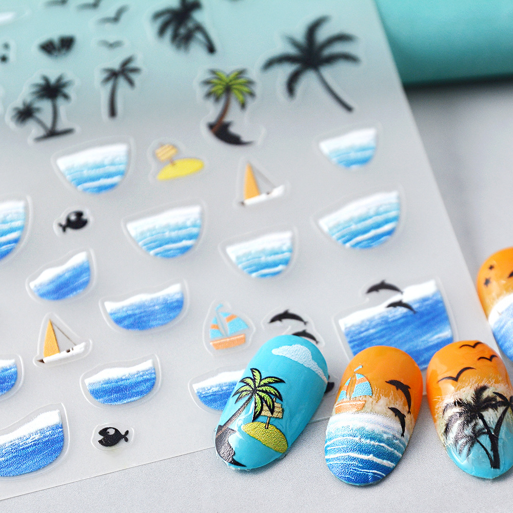 인터넷 유명한 네일 스티커 3 차원 해변 코코넛 세일링 손톱 자체 붙여 넣기 꽃 손 계정 복사 장식
