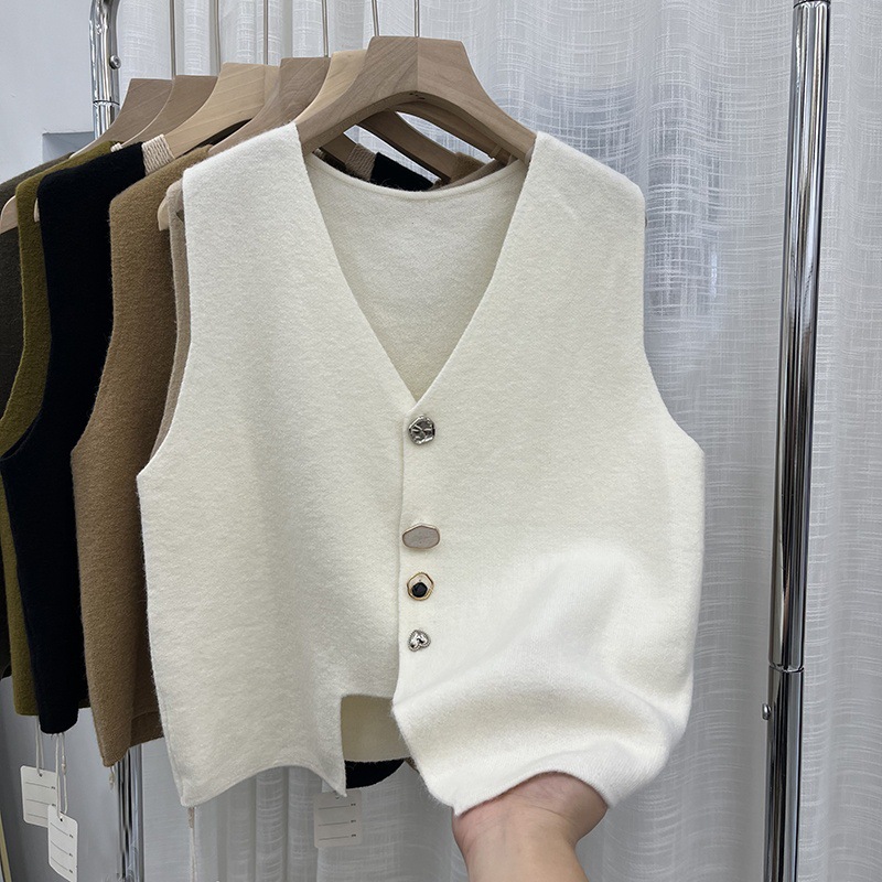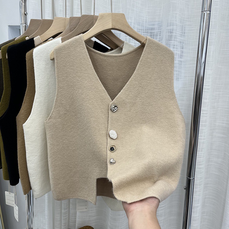디자인 센스 니쉬 버튼 불규칙한 조끼 니트 조끼 여성의 새로운 가을 2024 느슨한 외부 왁스 코트