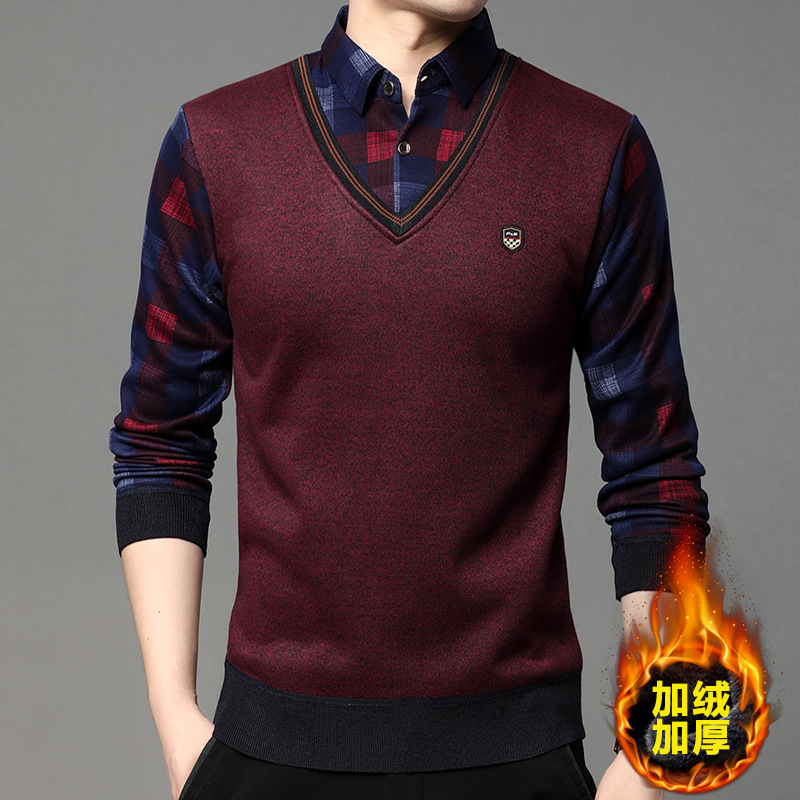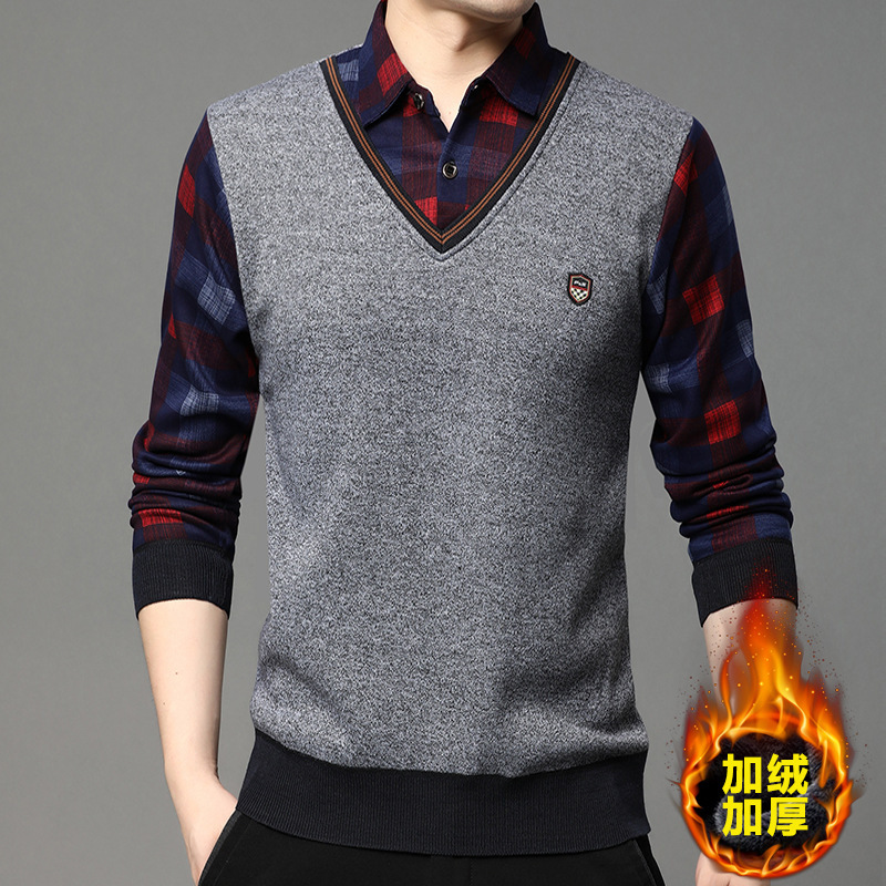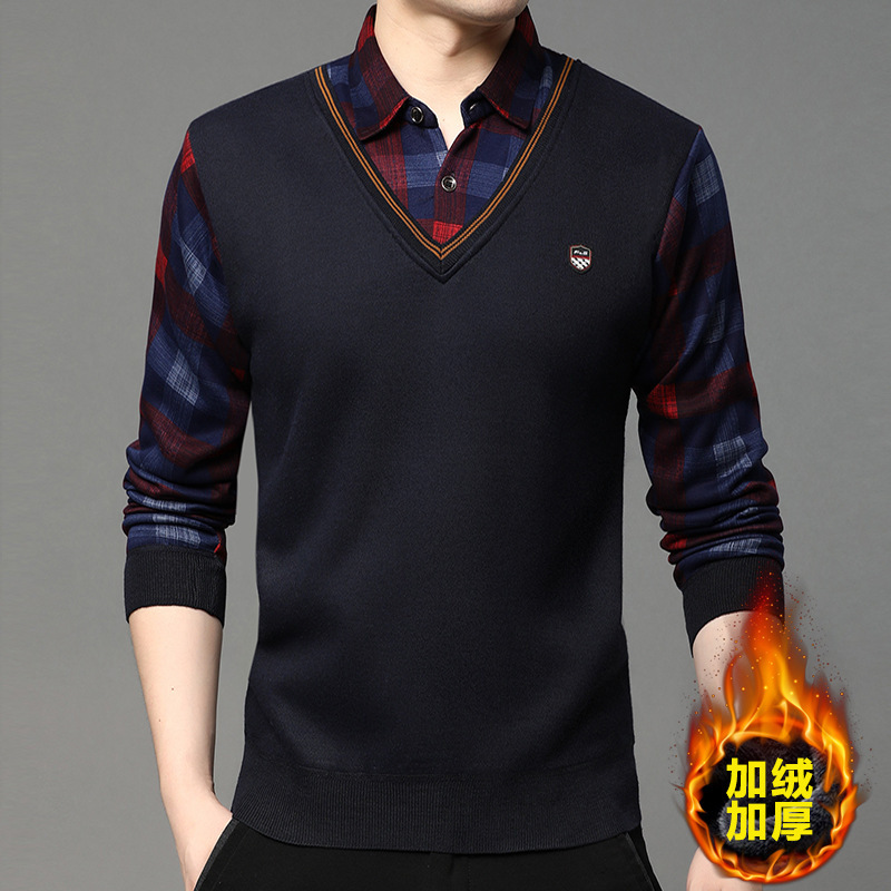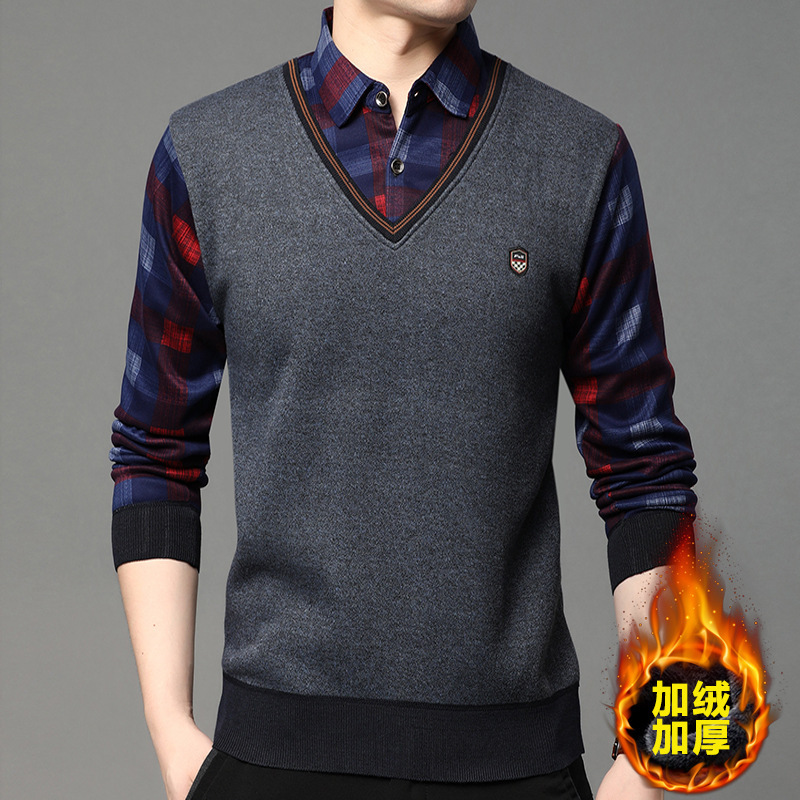 폭발 도매 새로운 가짜 투피스 스웨터 남성 기모 두꺼운 바닥 셔츠 가을과 겨울 젊고 중년 셔츠 칼라 뜨개질
