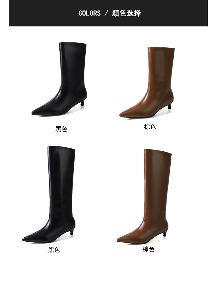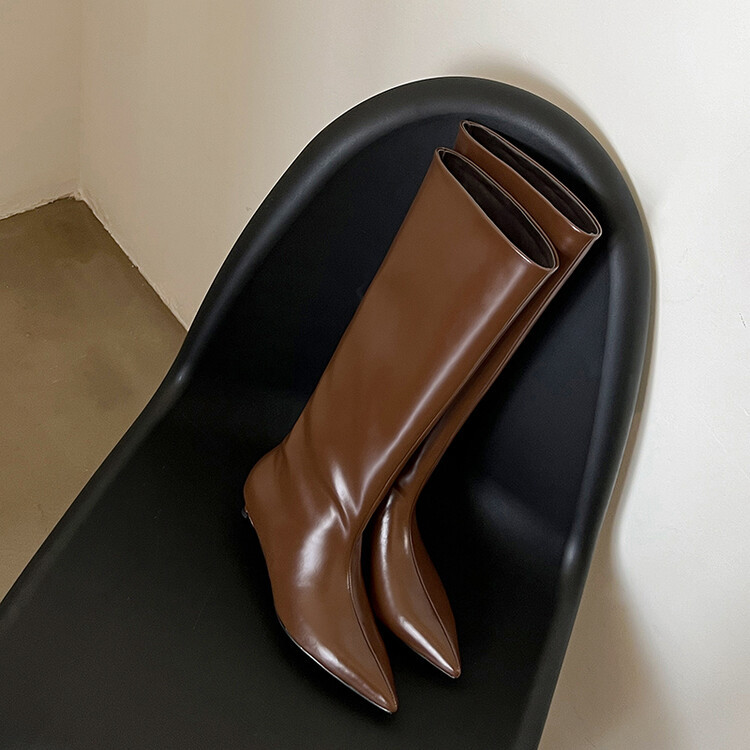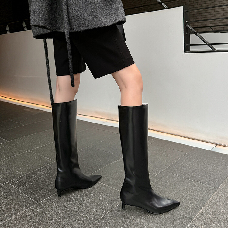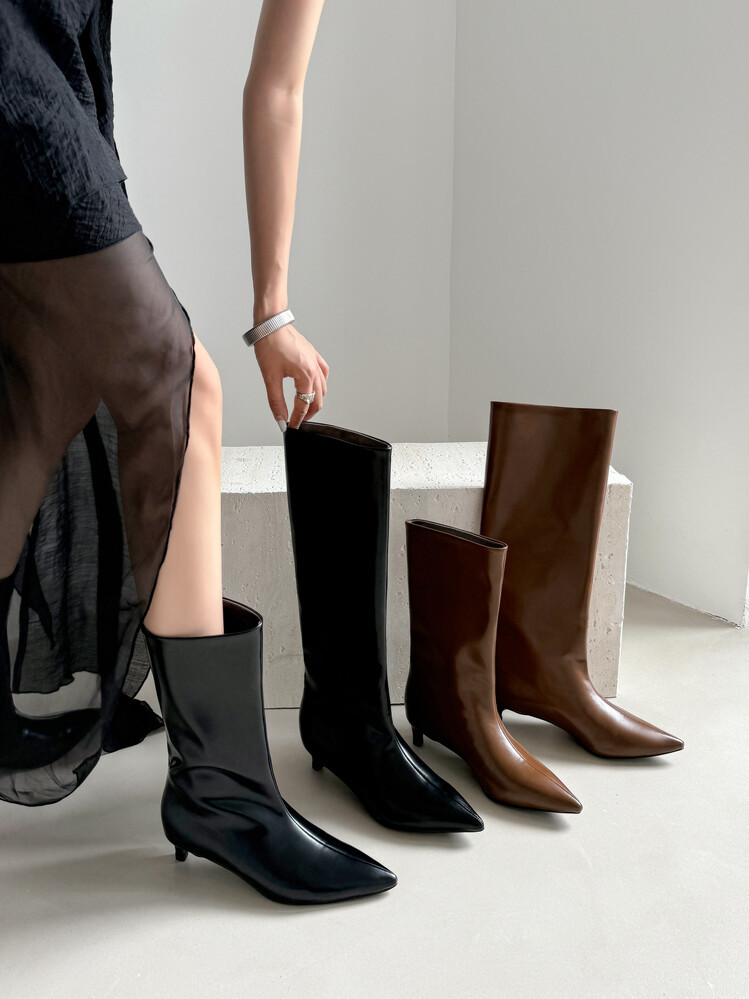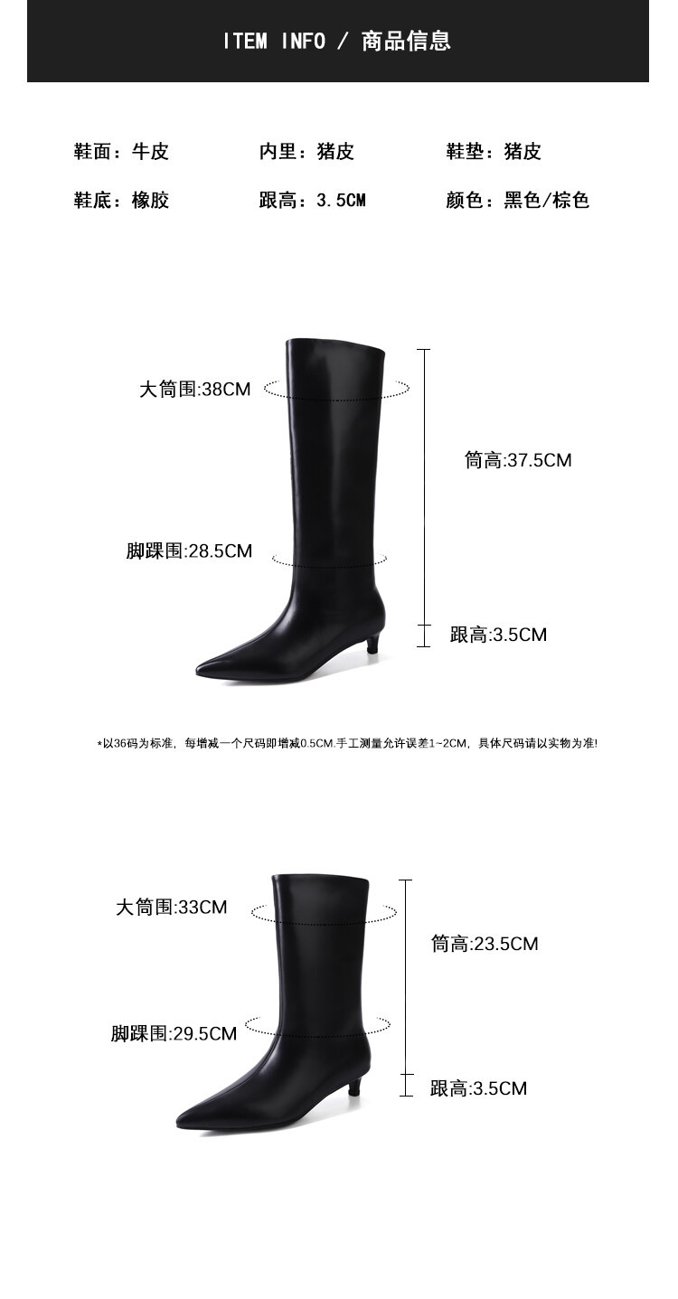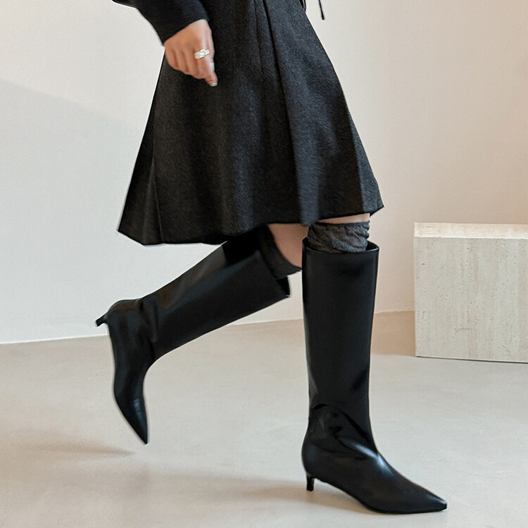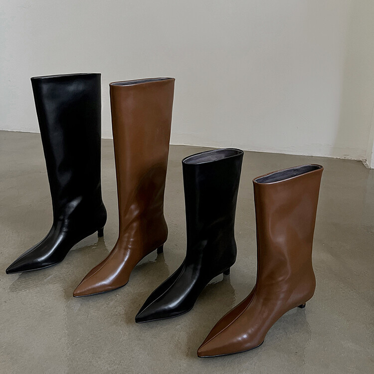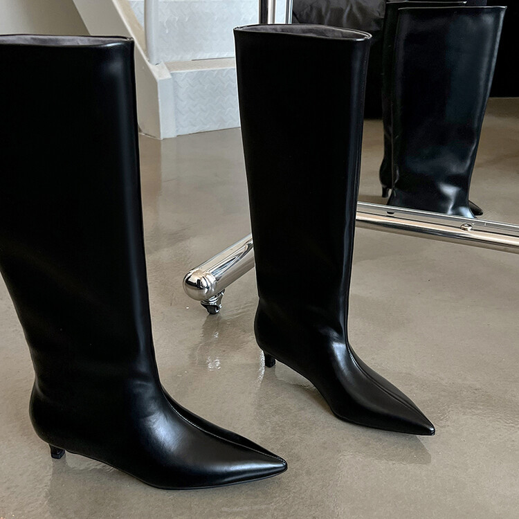 Puss-heel 슬리브 부츠 여성용 무릎 높이 부츠 가을 및 겨울 새로운 Cowhide 뾰족한 발가락 와이드 배럴 소매 미드 힐 무릎 높이 부츠스토어 가기
