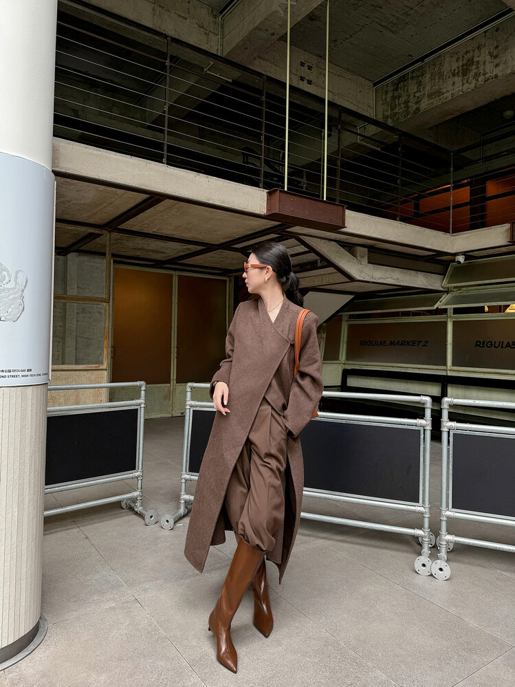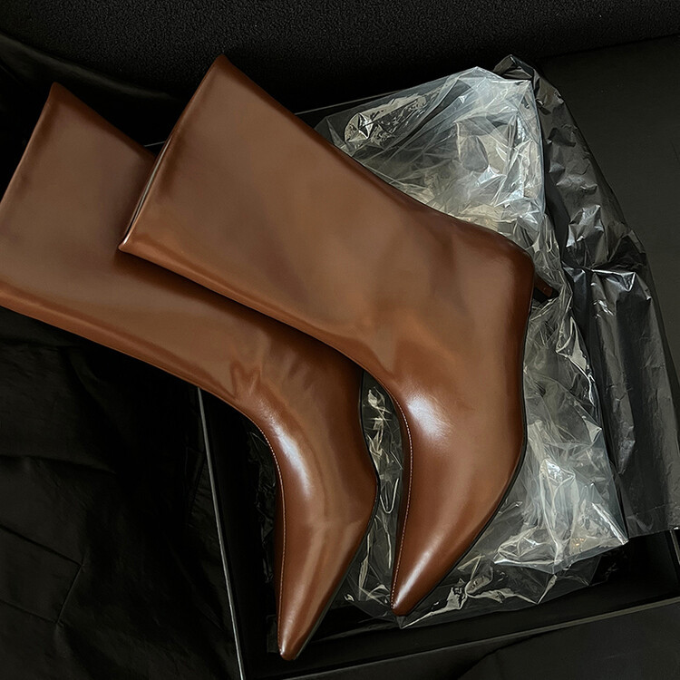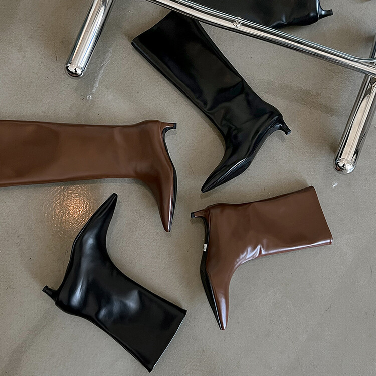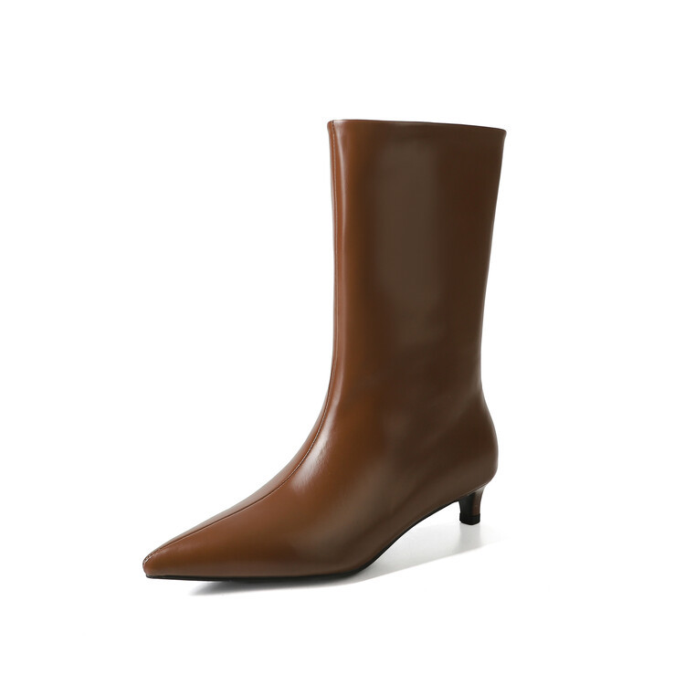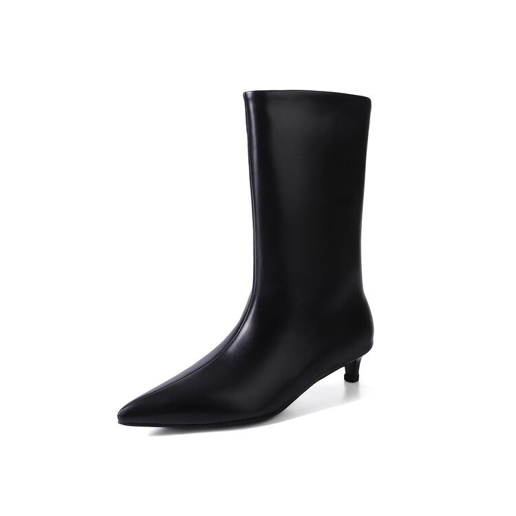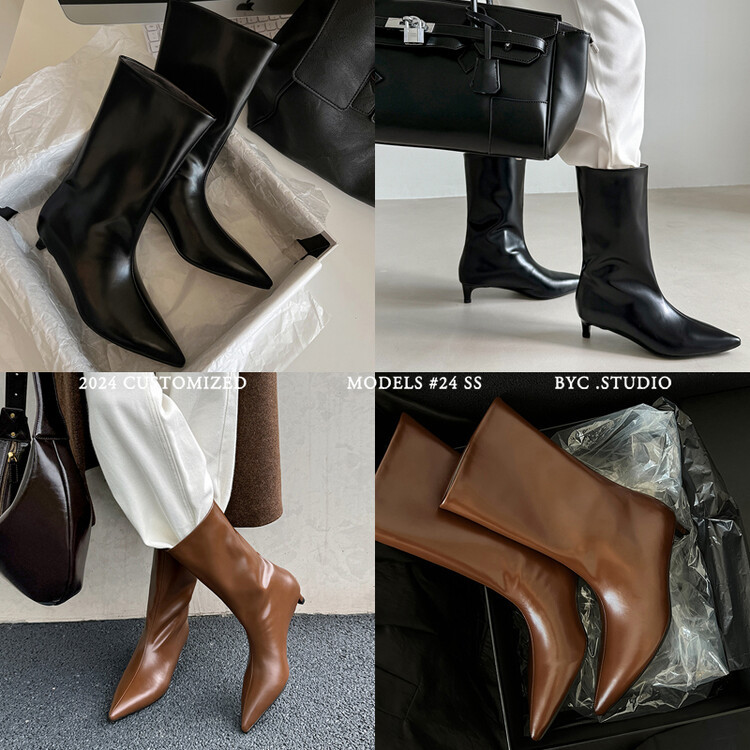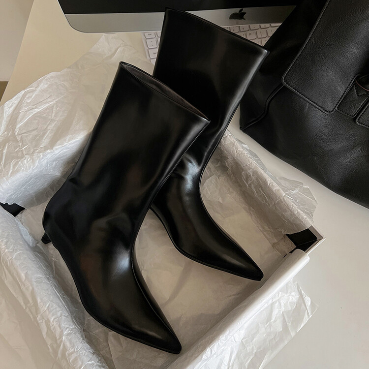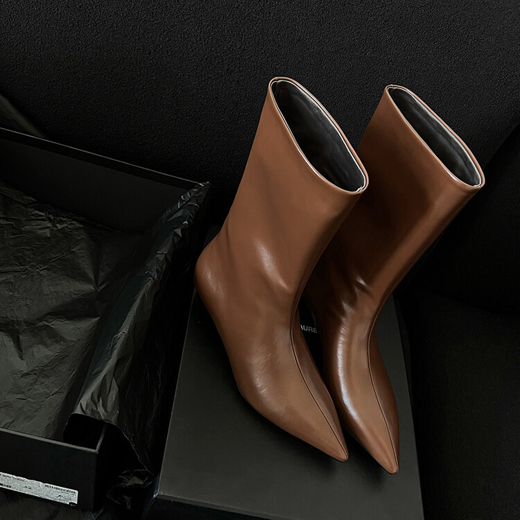 Puss-heel 슬리브 부츠 여성용 무릎 높이 부츠 가을 및 겨울 새로운 Cowhide 뾰족한 발가락 와이드 배럴 소매 미드 힐 무릎 높이 부츠스토어 가기