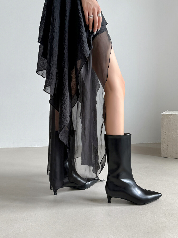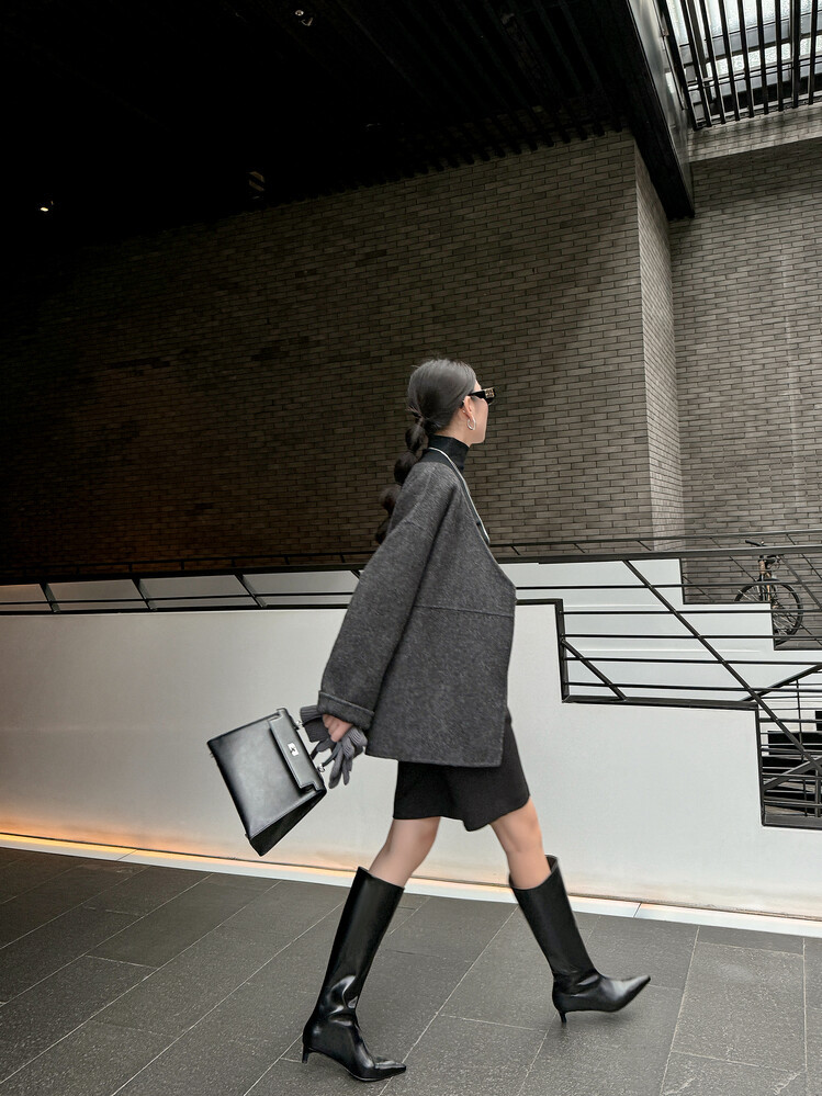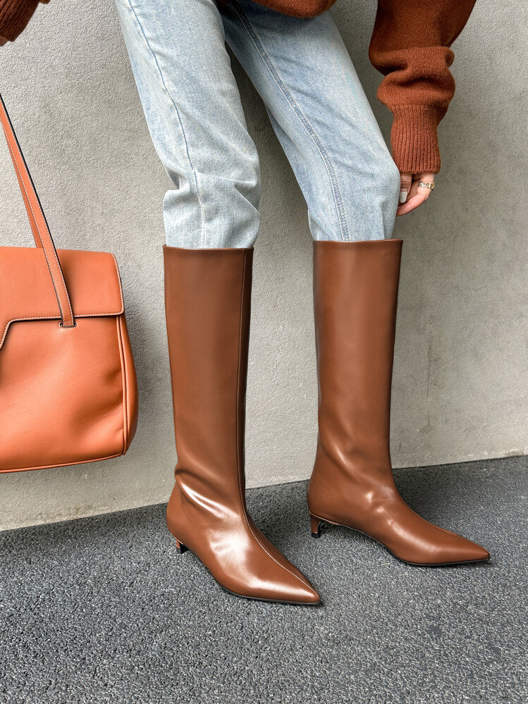 Puss-heel 슬리브 부츠 여성용 무릎 높이 부츠 가을 및 겨울 새로운 Cowhide 뾰족한 발가락 와이드 배럴 소매 미드 힐 무릎 높이 부츠