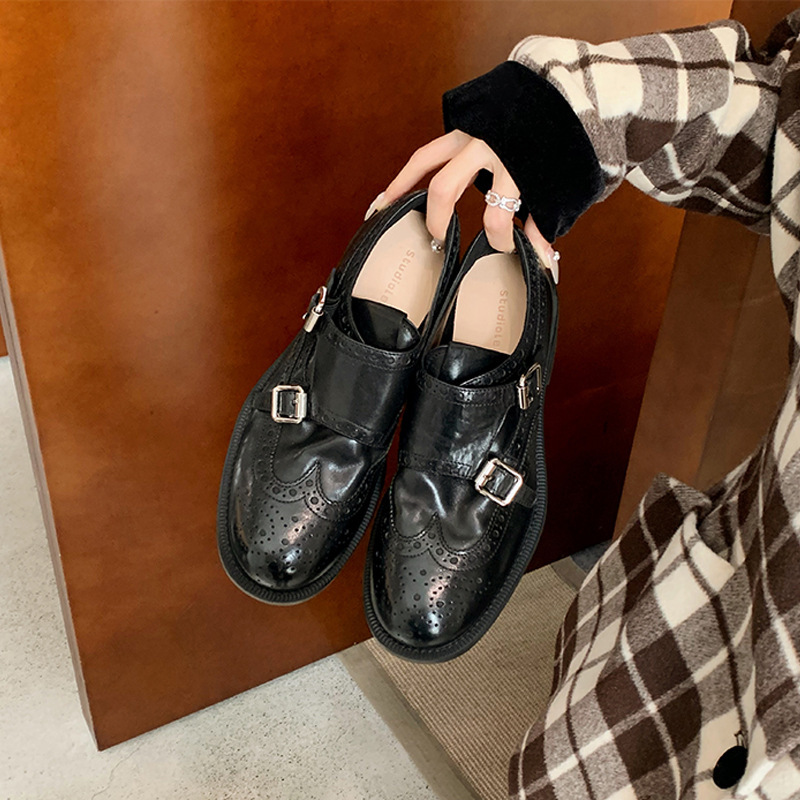 정품 가죽 포도 어머니 수축 더블 버클 영국 싱글 레이어 신발 둥근 발가락 두꺼운 굽 가죽 신발 여성용 말 가죽 브록 부드러운 바닥스토어 가기