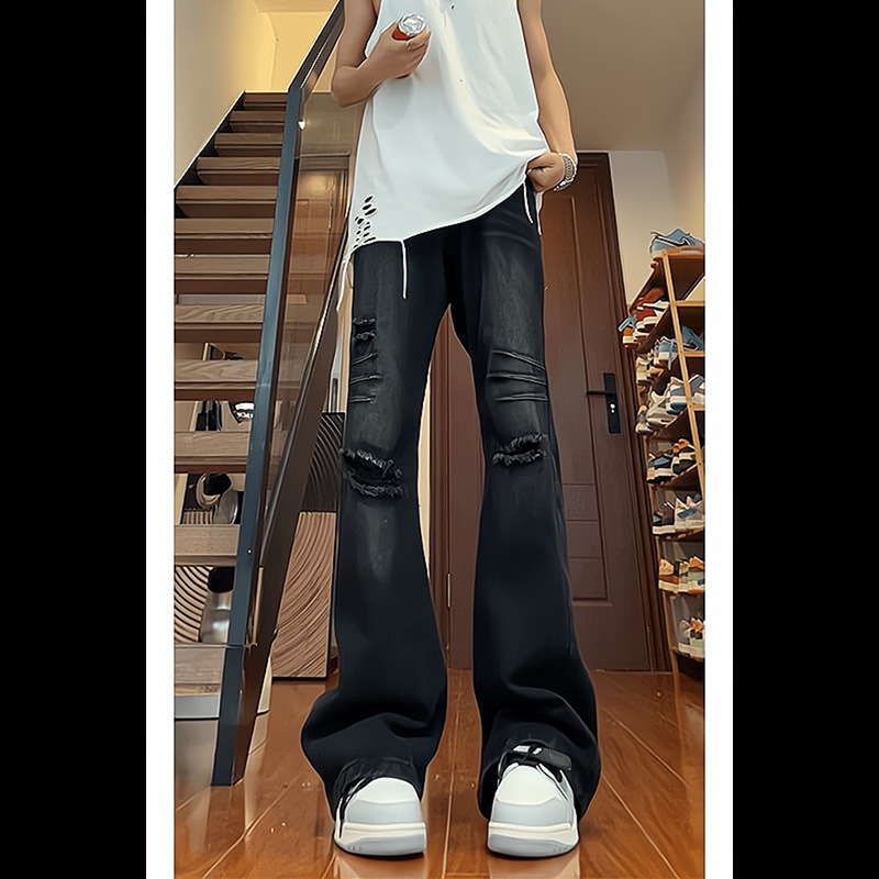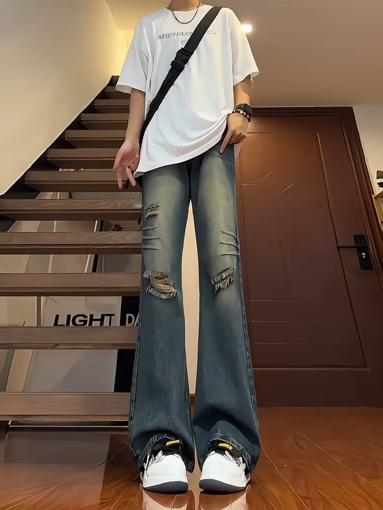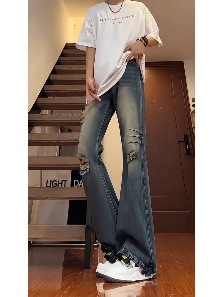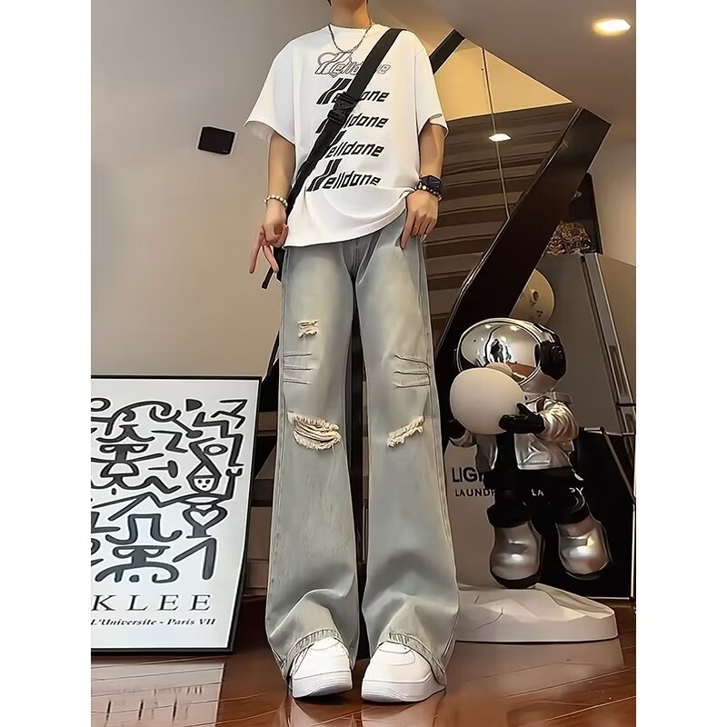반 탄성 청바지 남녀 여름 얇은 찢어진 바지 미국 스타일 하이 스트리트 바이브 스트레이트 바지 캐주얼 한국 스타일스토어 가기