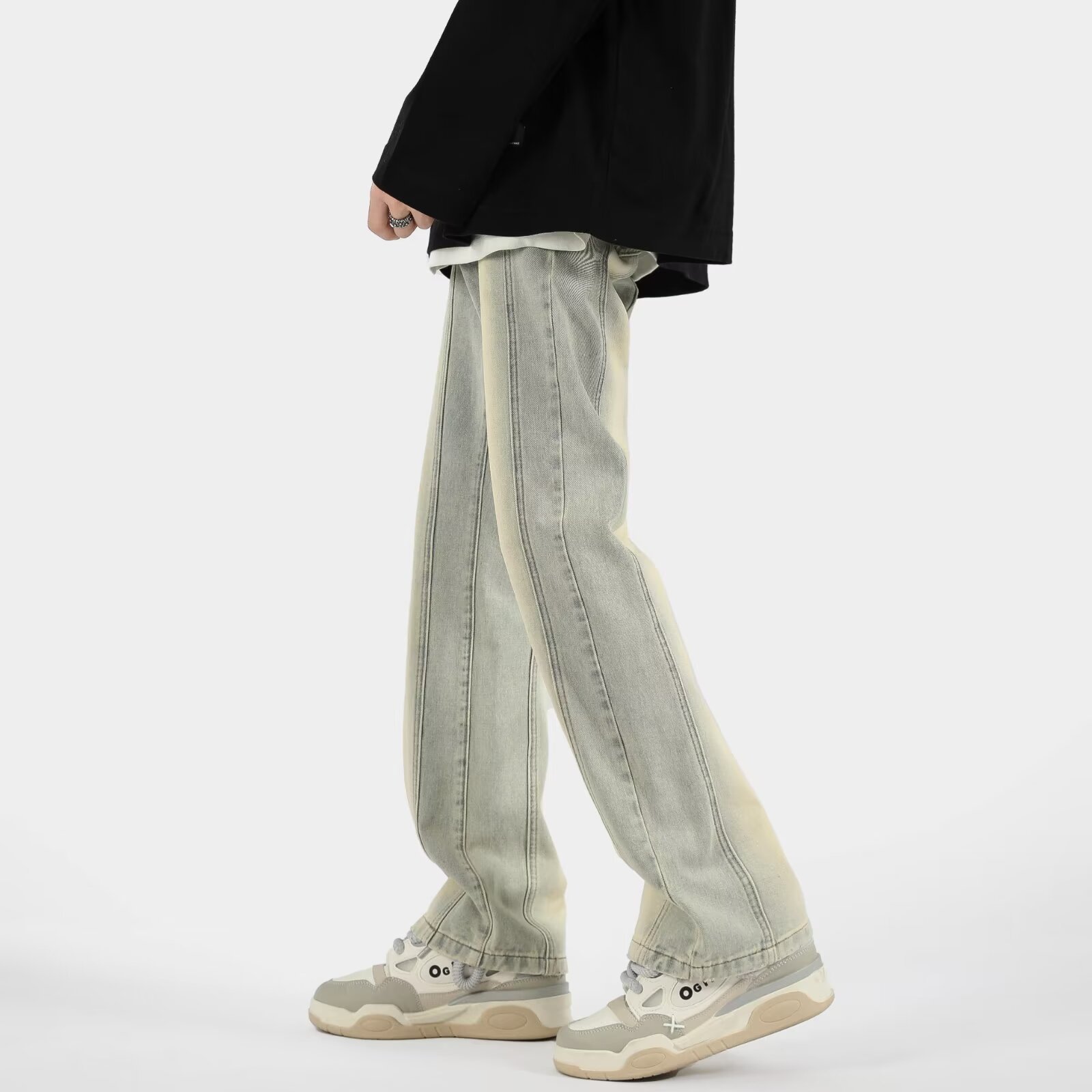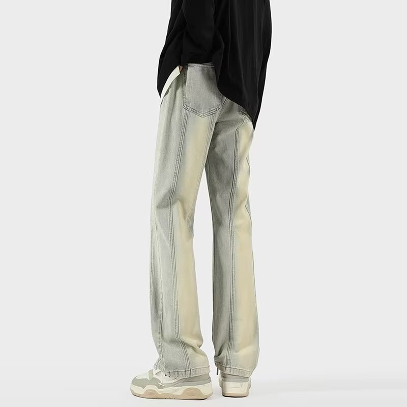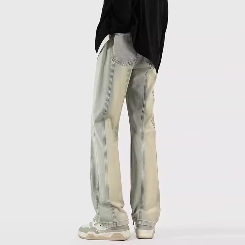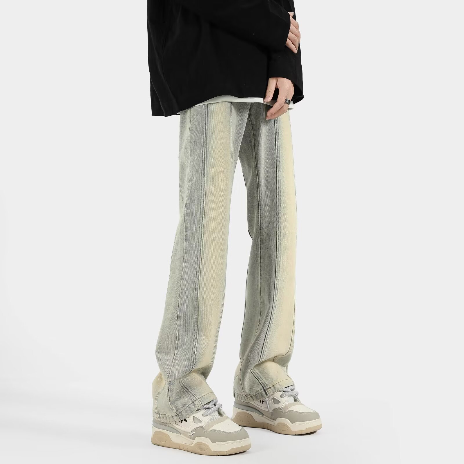 미국식 하이 스트리트 바이브 세탁 오래 된 노란색 머드 염료 청바지 남성용 트렌디 인 스트레이트 씬 슬림 스택 바지스토어 가기