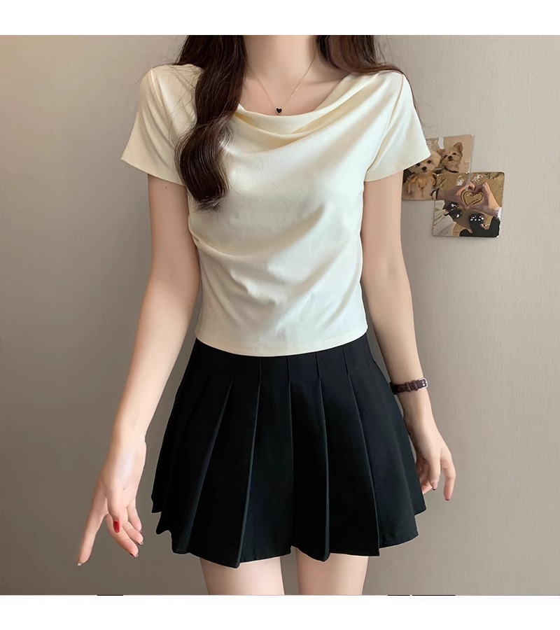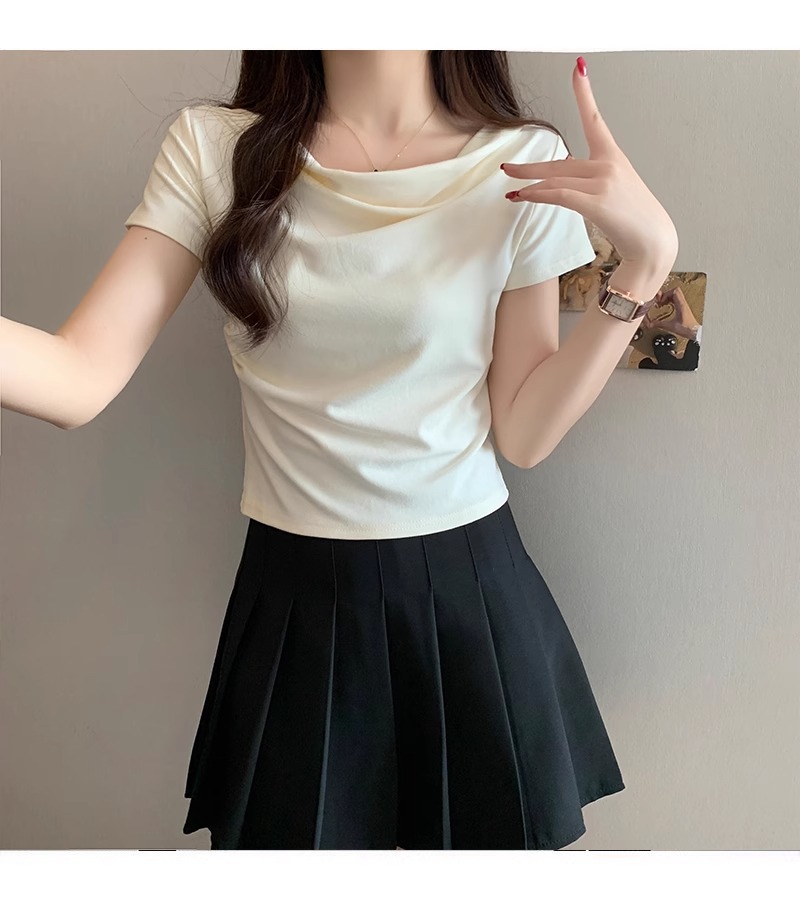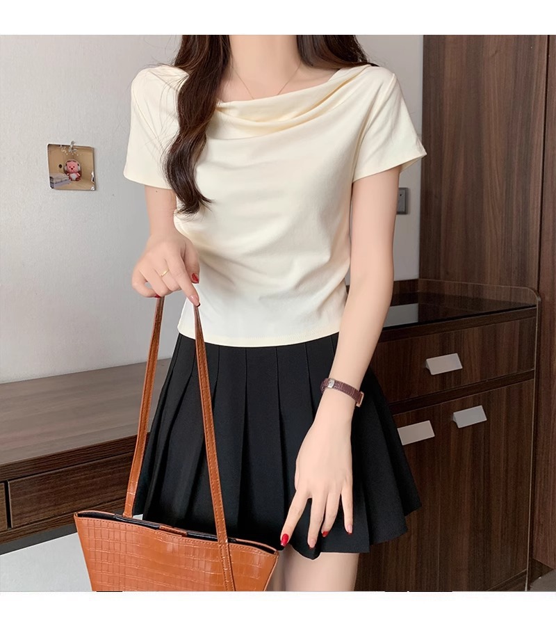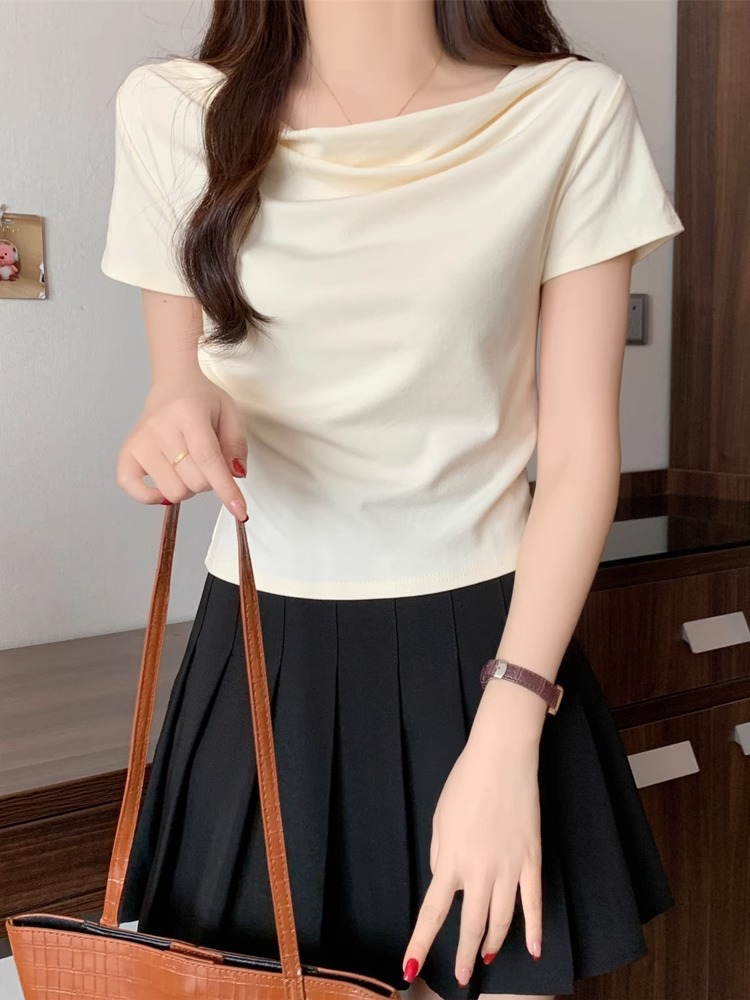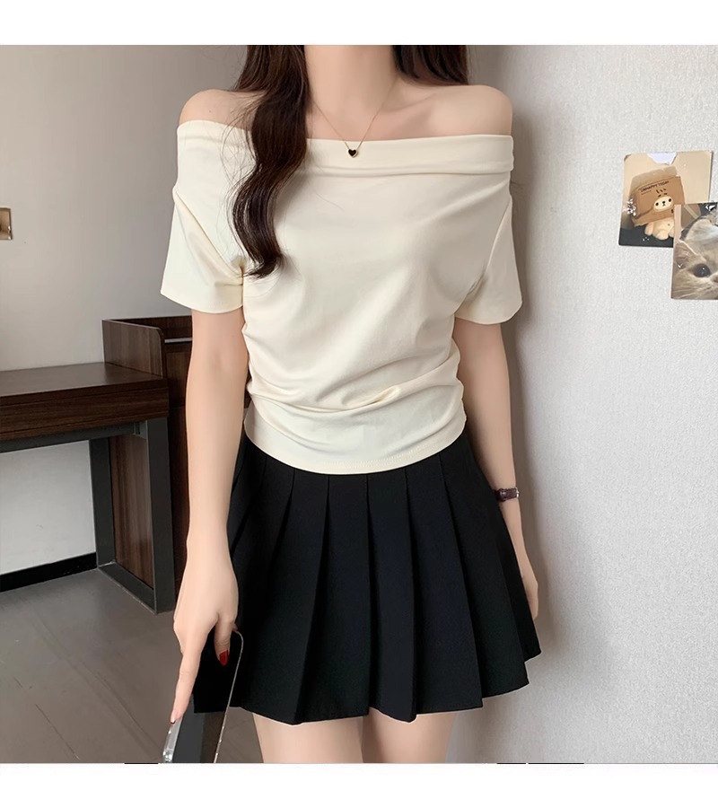 프랑스 스타일 디자인 스윙 칼라 오프 숄더 모달 반팔 티셔츠 여성용 여름 슬림핏 스파이스 걸 쇼트 탑스