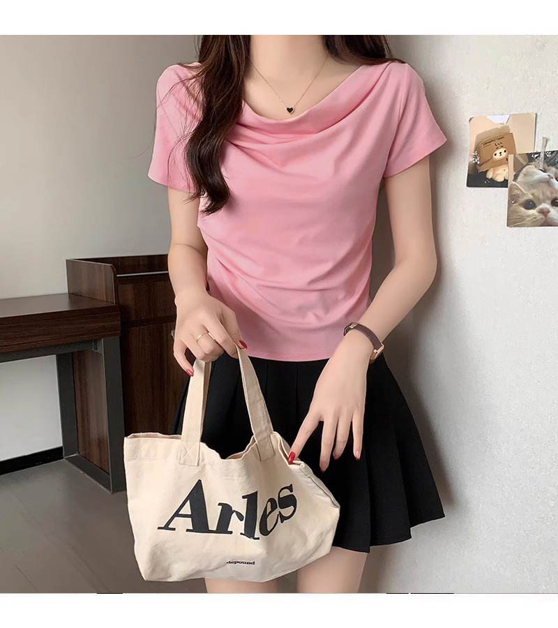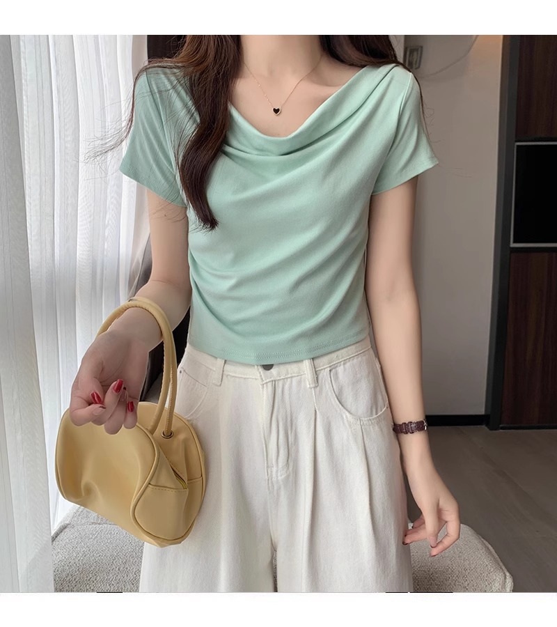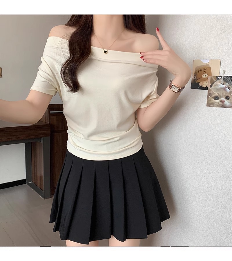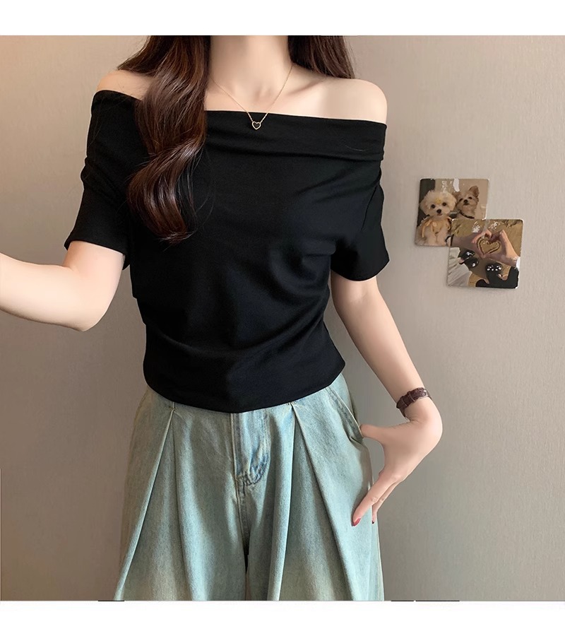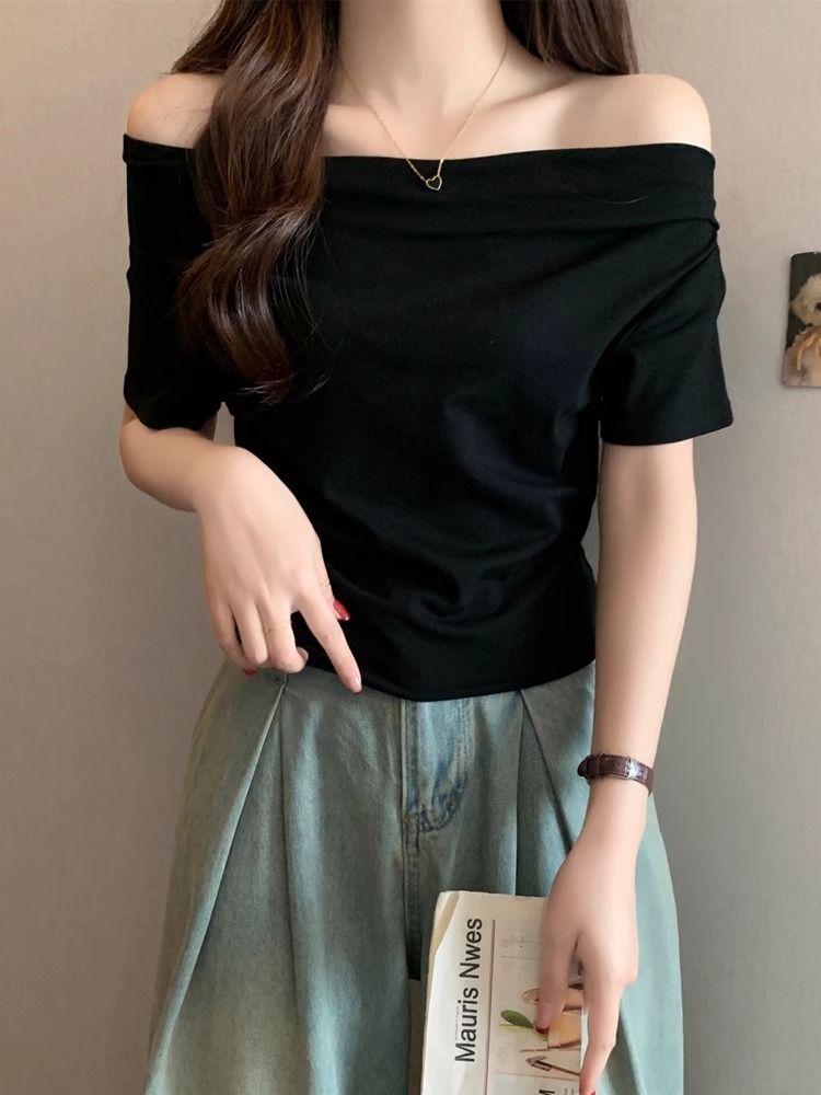 프랑스 스타일 디자인 스윙 칼라 오프 숄더 모달 반팔 티셔츠 여성용 여름 슬림핏 스파이스 걸 쇼트 탑스스토어 가기
