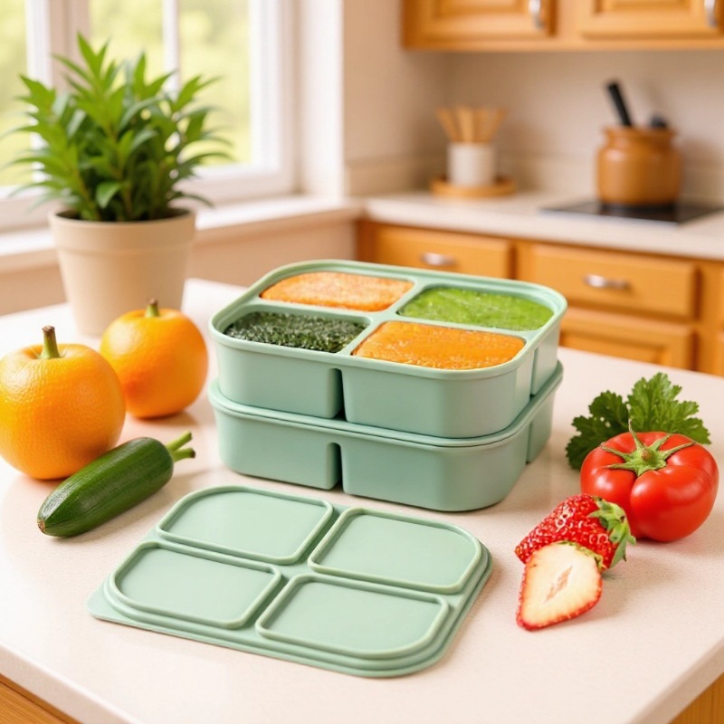 FDA 식품 등급 실리콘 4칸 이유식 냉동 상자 유아식 보관 상자 뚜껑이 있는 얼음틀
