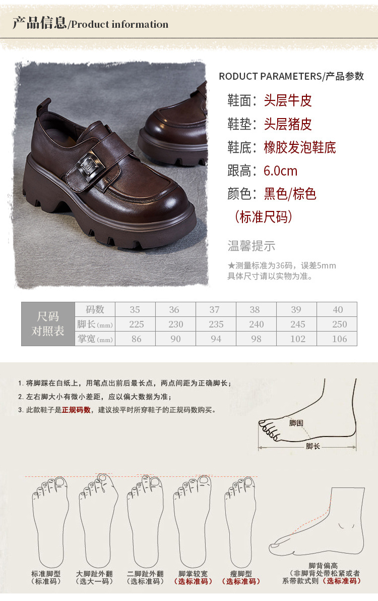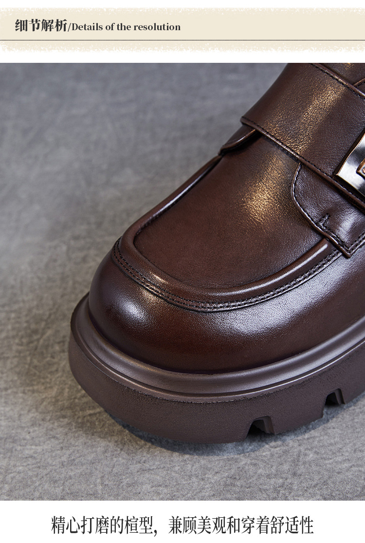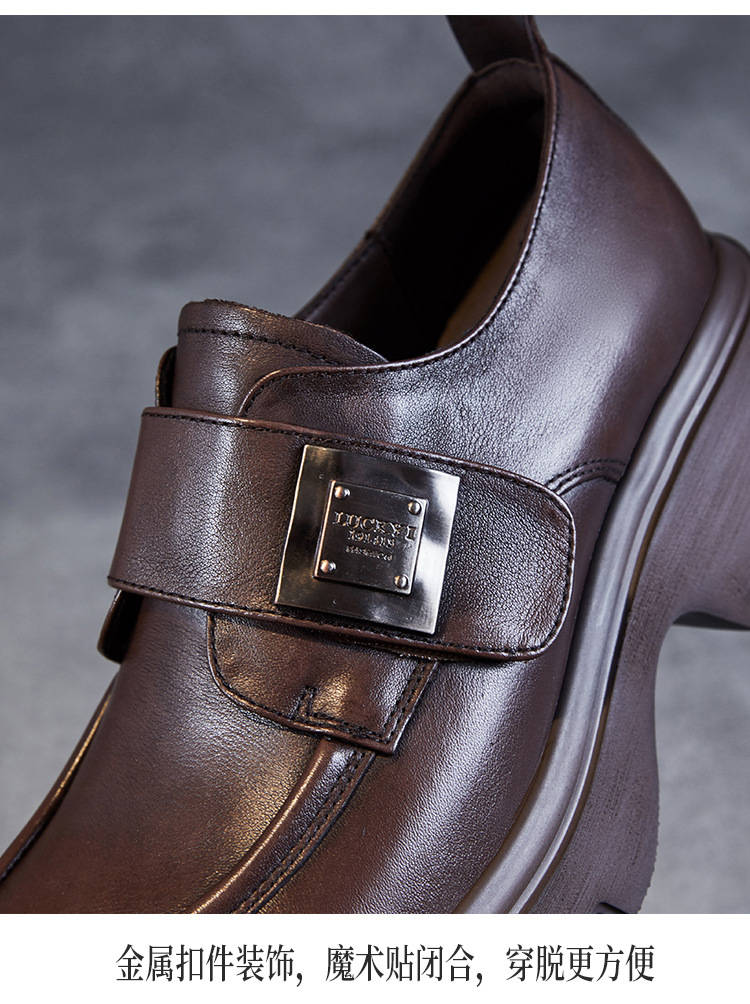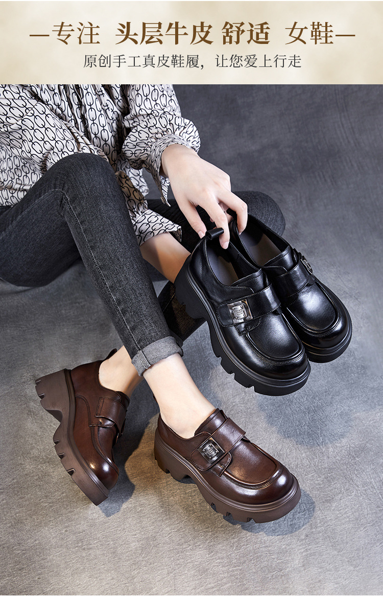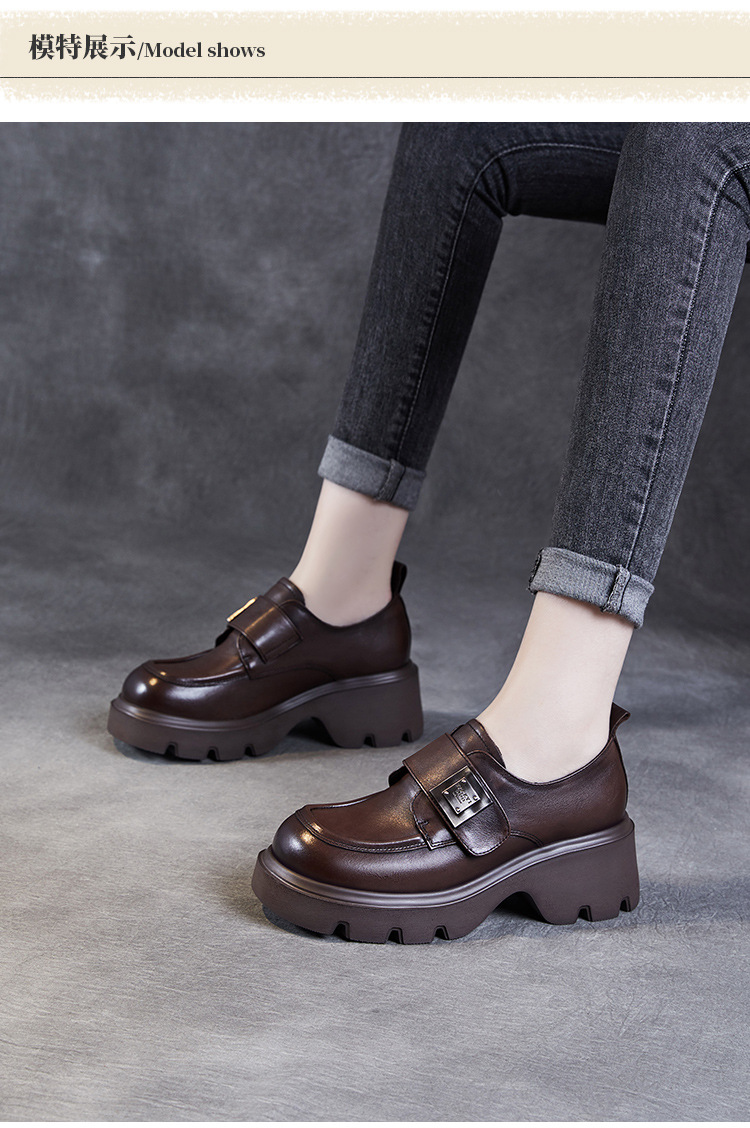 두꺼운 밑창 가죽 로퍼 여성의 2024 년 봄과 가을 새로운 두꺼운 뒤꿈치 작은 가죽 신발 금속 버클 벨크로 높은 다큐멘터리 신발스토어 가기