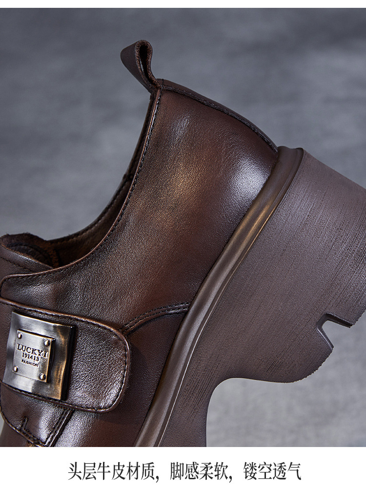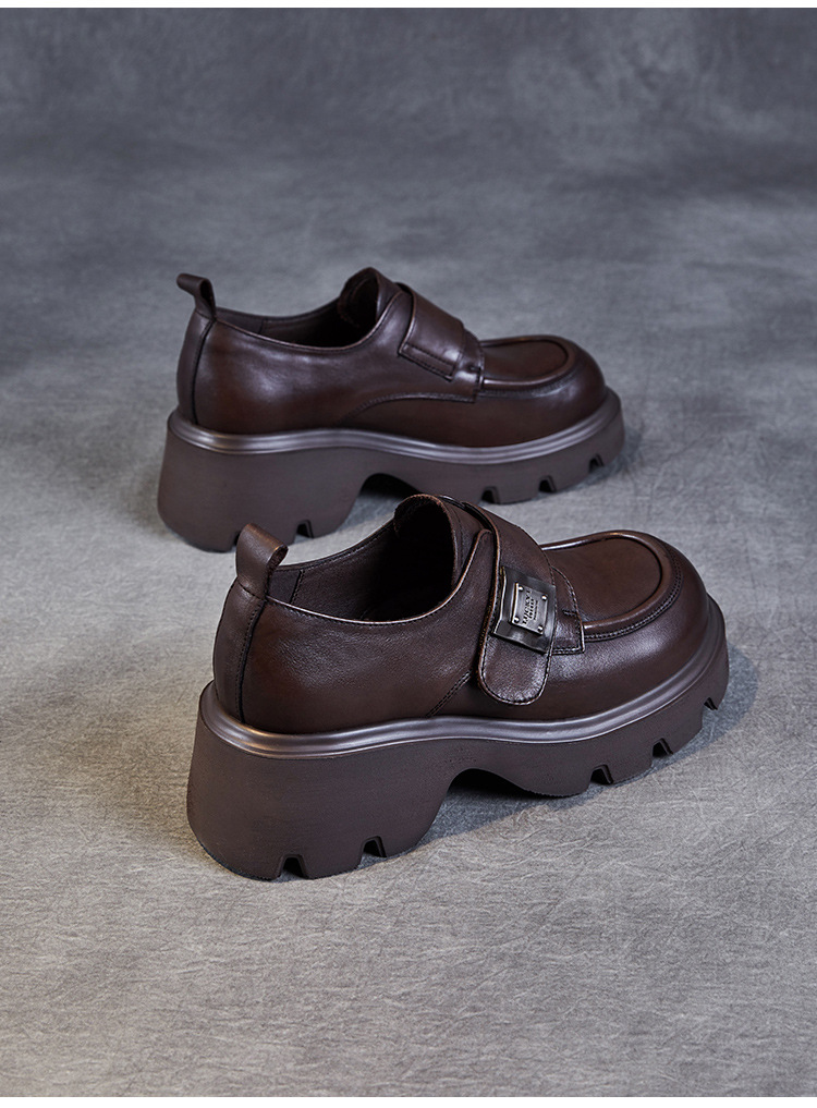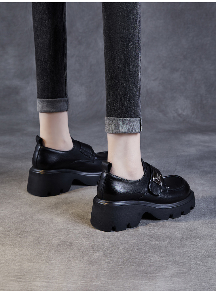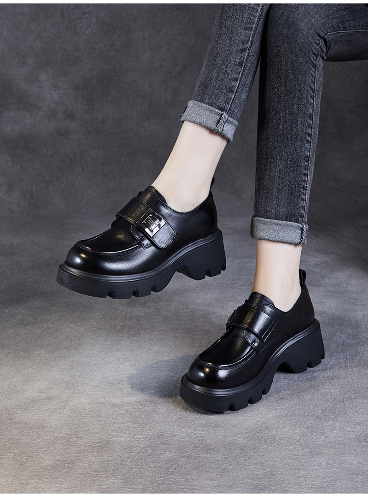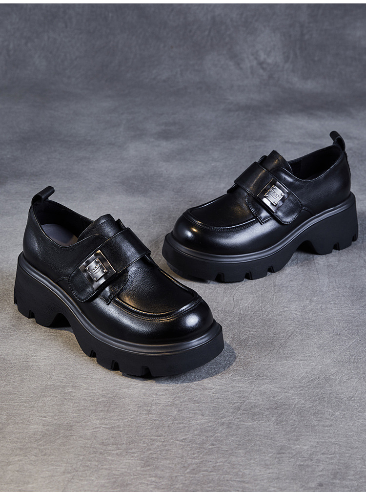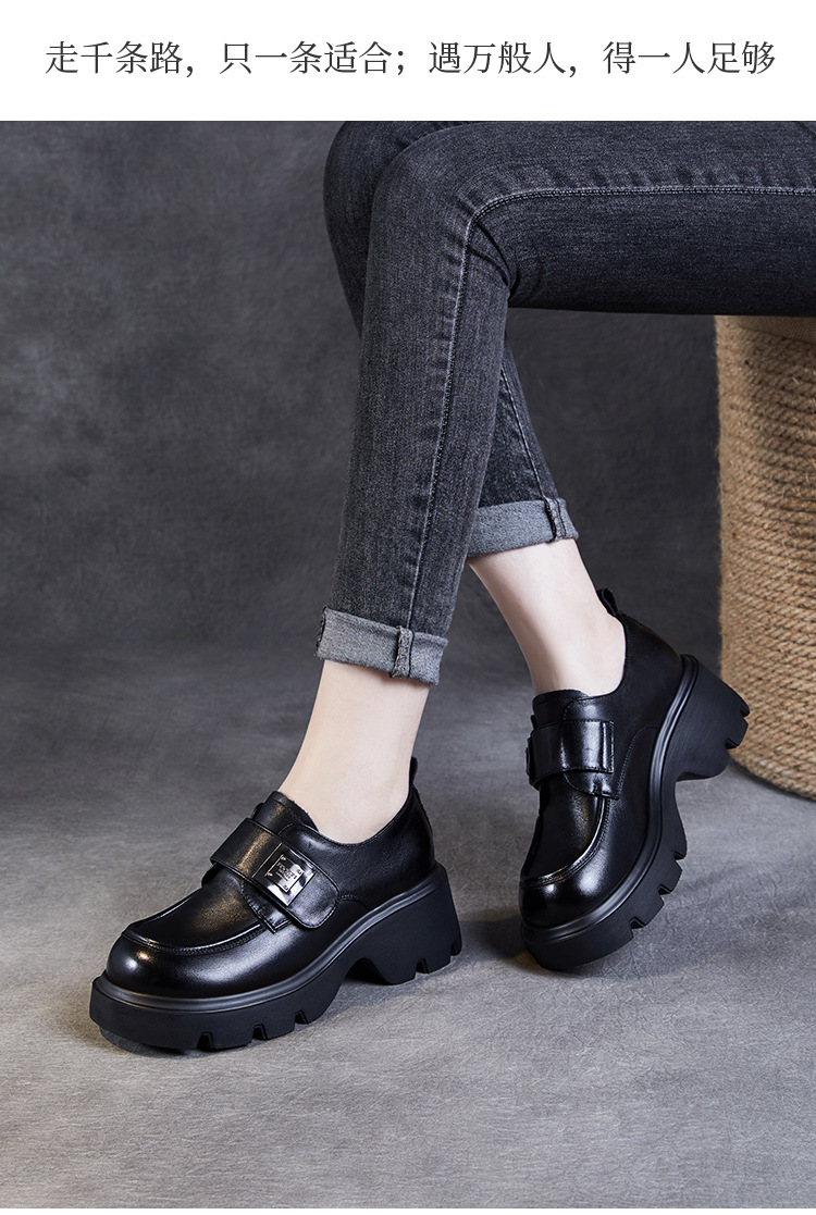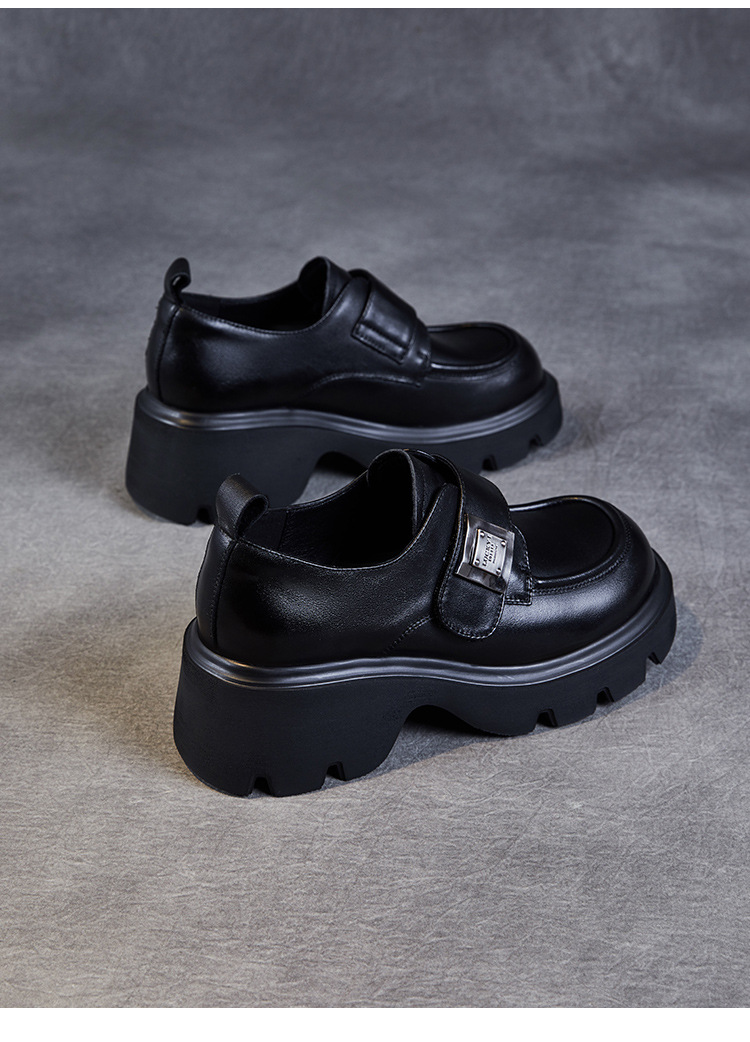 두꺼운 밑창 가죽 로퍼 여성의 2024 년 봄과 가을 새로운 두꺼운 뒤꿈치 작은 가죽 신발 금속 버클 벨크로 높은 다큐멘터리 신발
