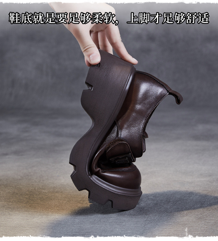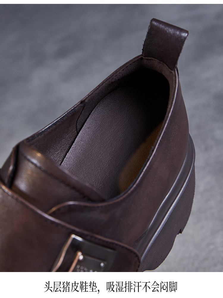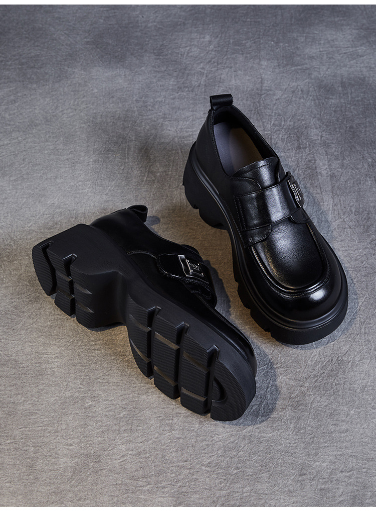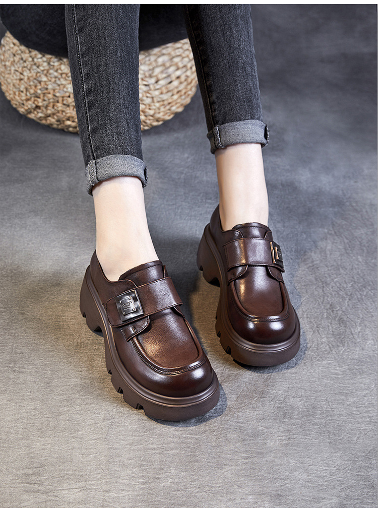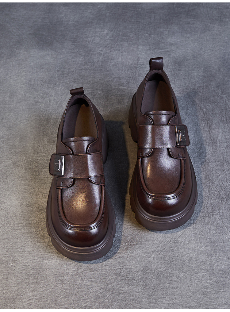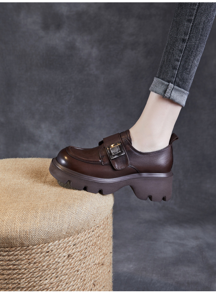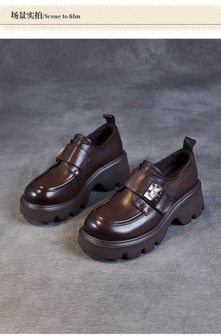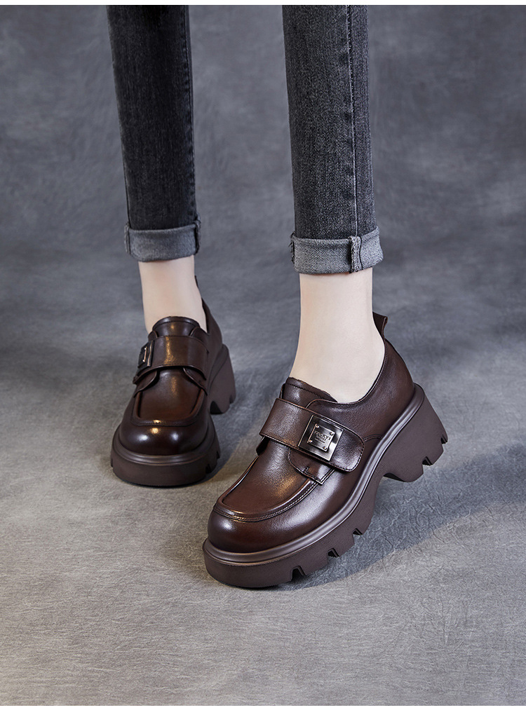 두꺼운 밑창 가죽 로퍼 여성의 2024 년 봄과 가을 새로운 두꺼운 뒤꿈치 작은 가죽 신발 금속 버클 벨크로 높은 다큐멘터리 신발