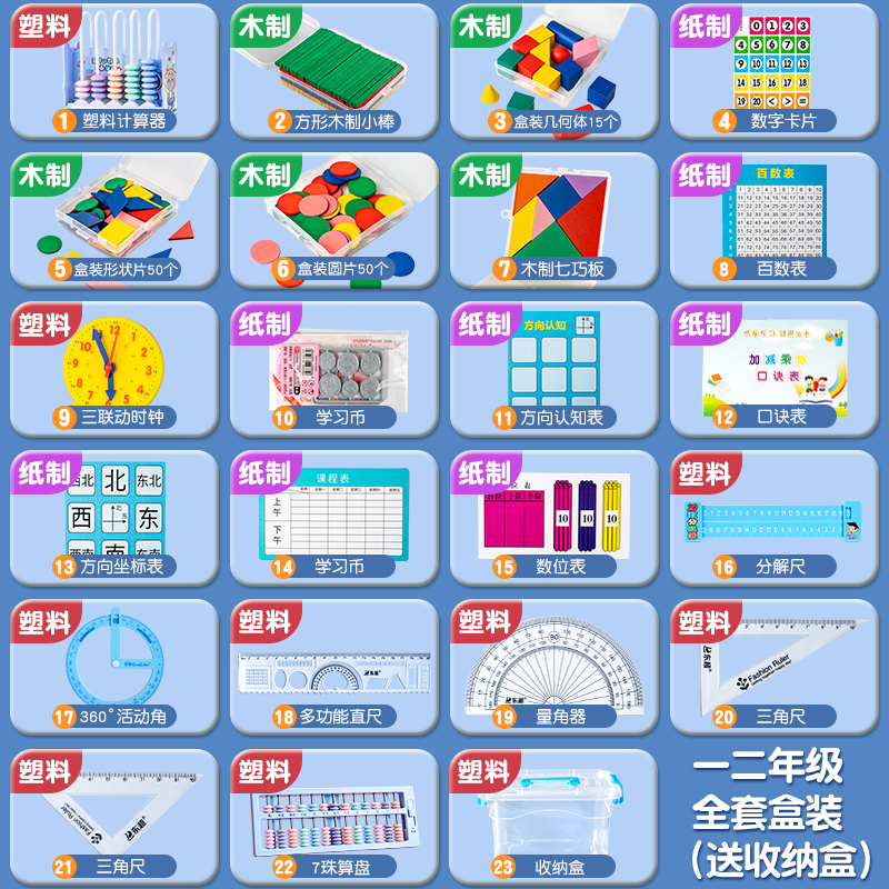 • 1학년 및 2학년용 상자에 담긴 완전한 세트(보관함 포함)