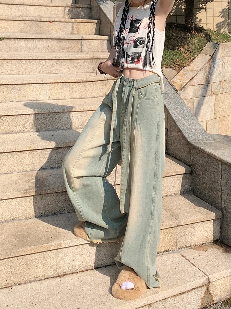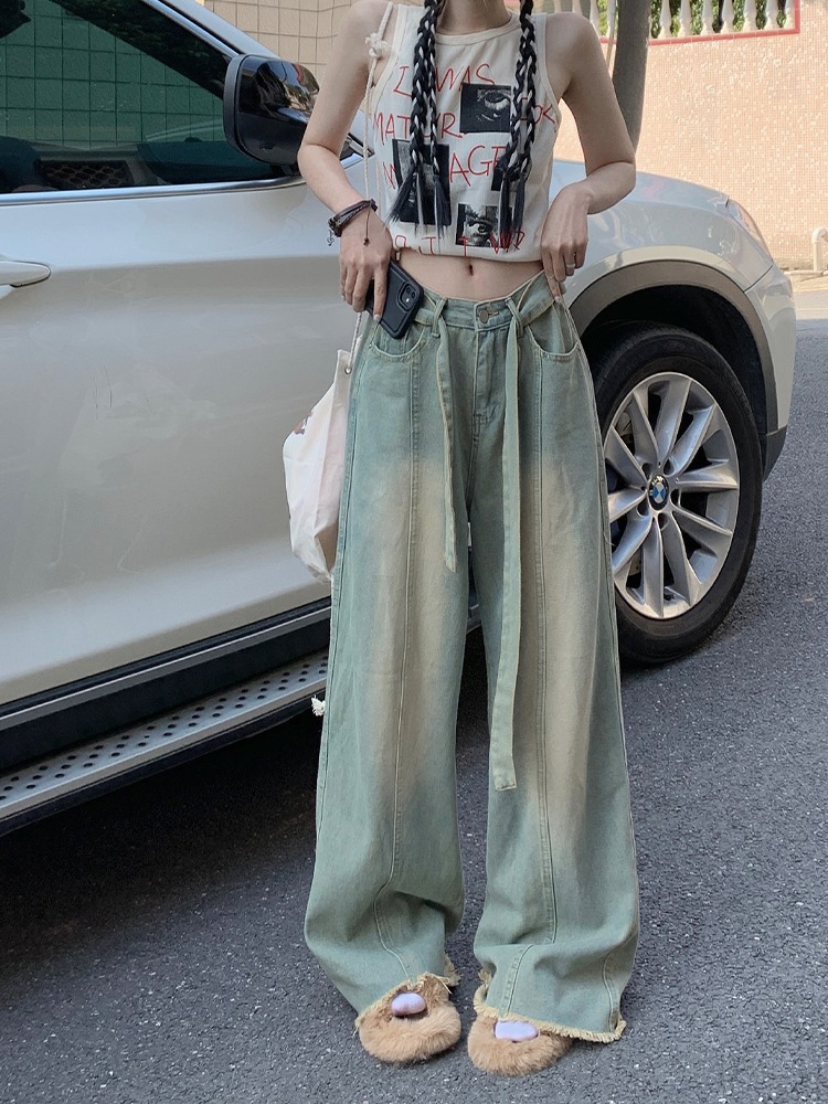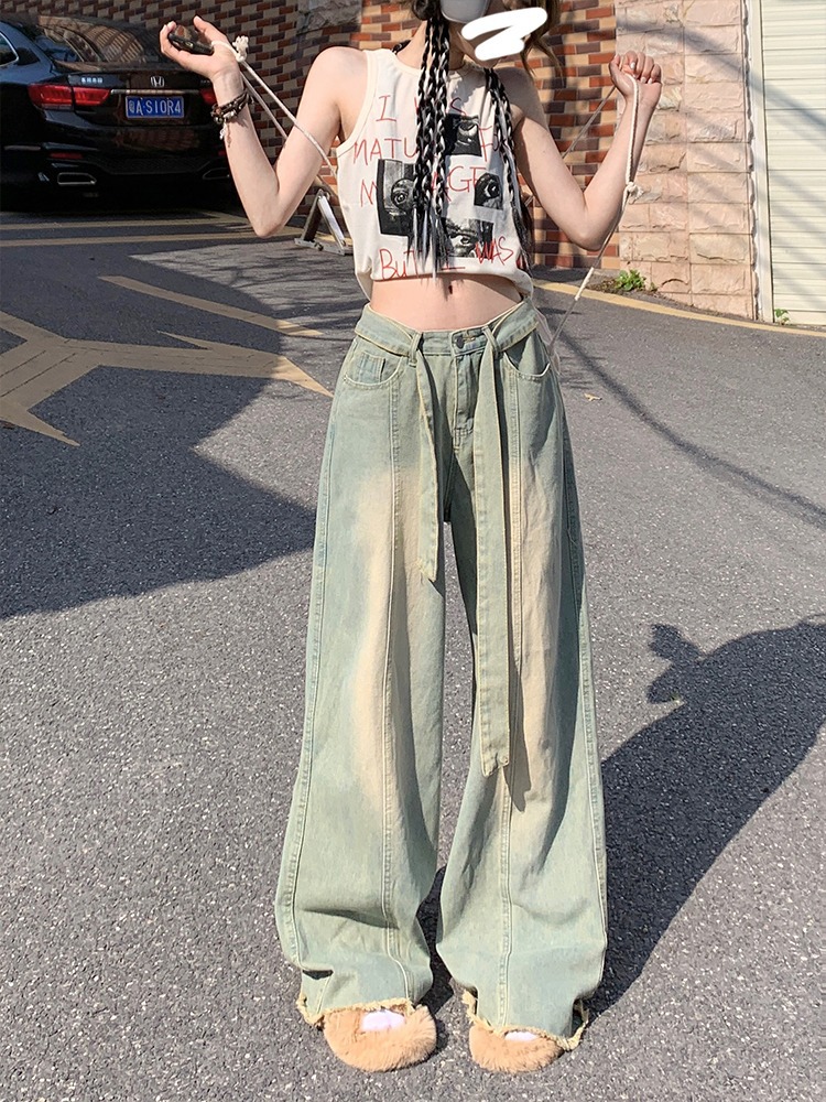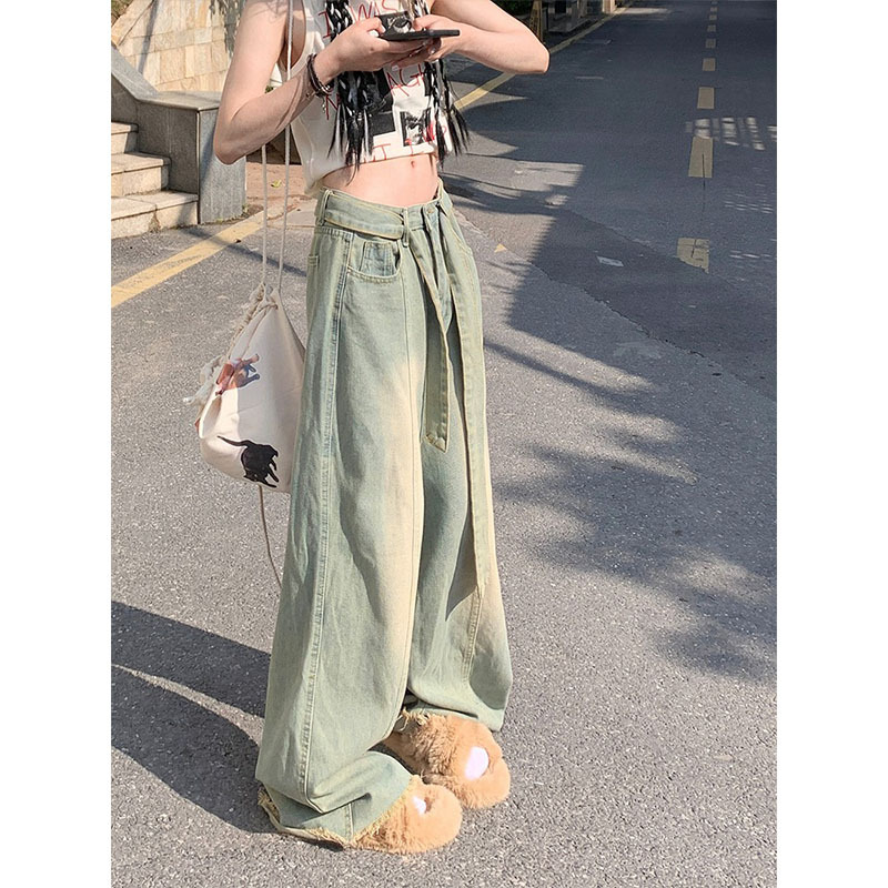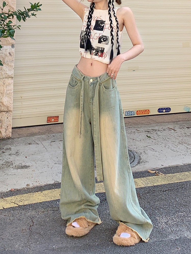 아메리칸 스타일 하이 스트리트 옐로우 머드 하이 웨이스트 와이드 레그 청바지 여성 여름 뉴 워시 올드 루즈 슬림 핏 롭 팬츠