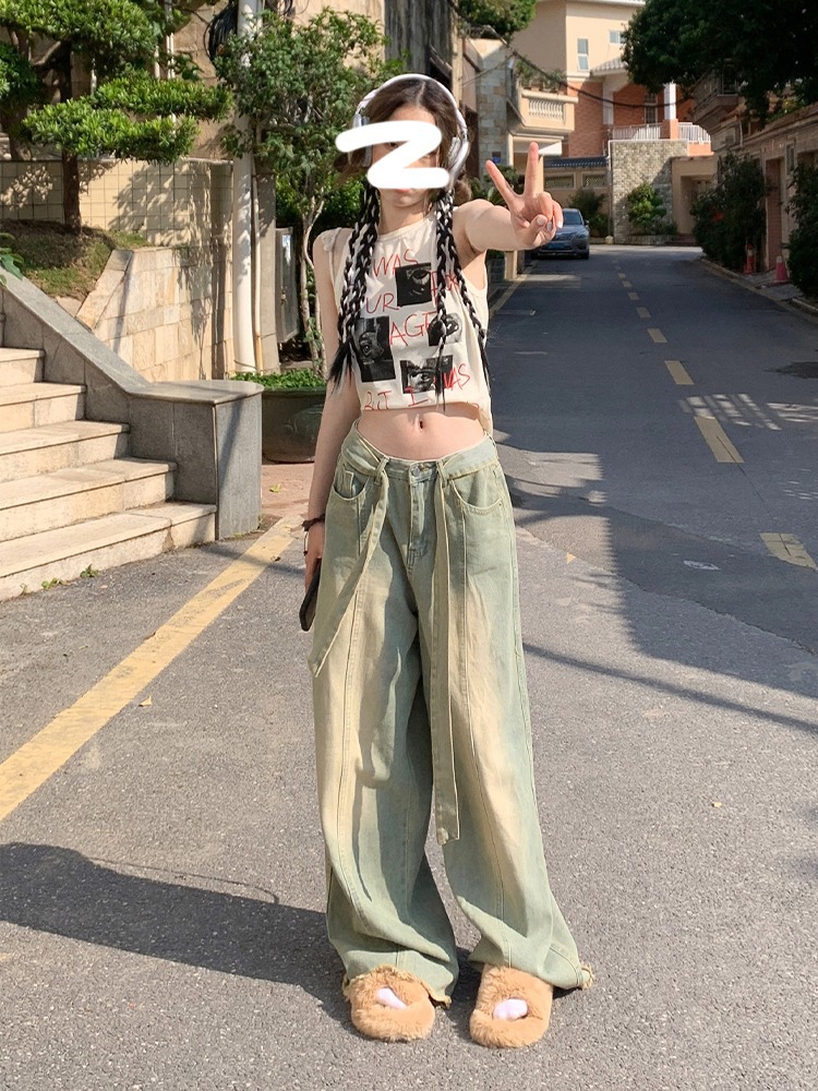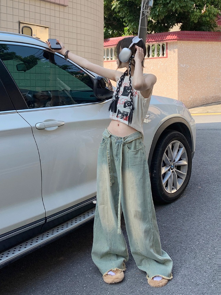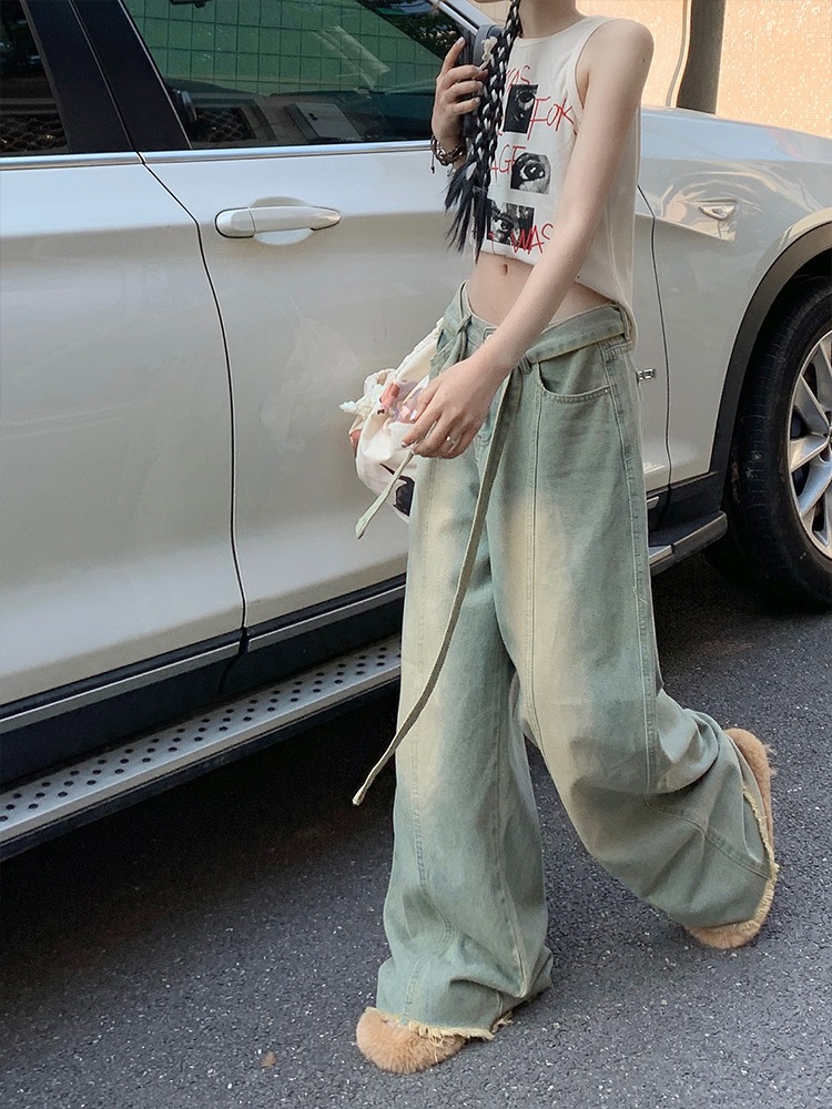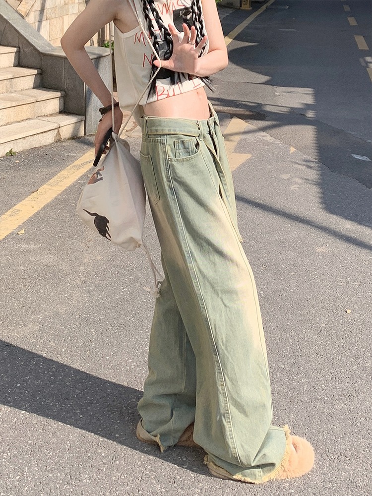 아메리칸 스타일 하이 스트리트 옐로우 머드 하이 웨이스트 와이드 레그 청바지 여성 여름 뉴 워시 올드 루즈 슬림 핏 롭 팬츠