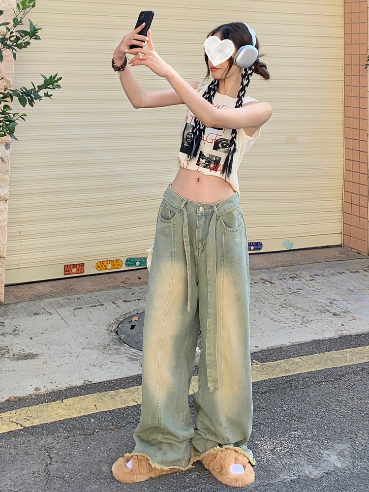 아메리칸 스타일 하이 스트리트 옐로우 머드 하이 웨이스트 와이드 레그 청바지 여성 여름 뉴 워시 올드 루즈 슬림 핏 롭 팬츠스토어 가기