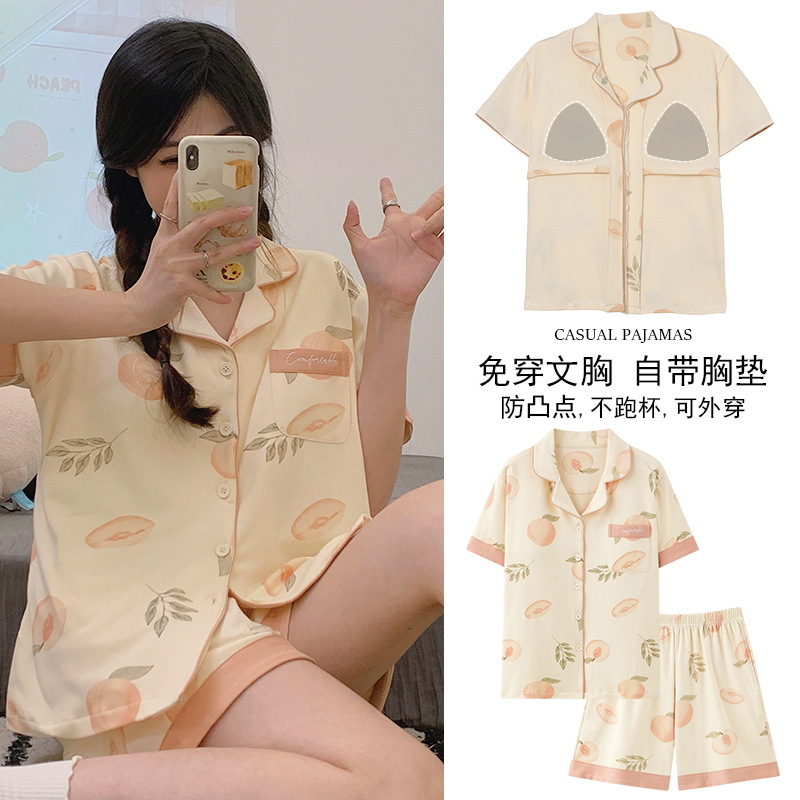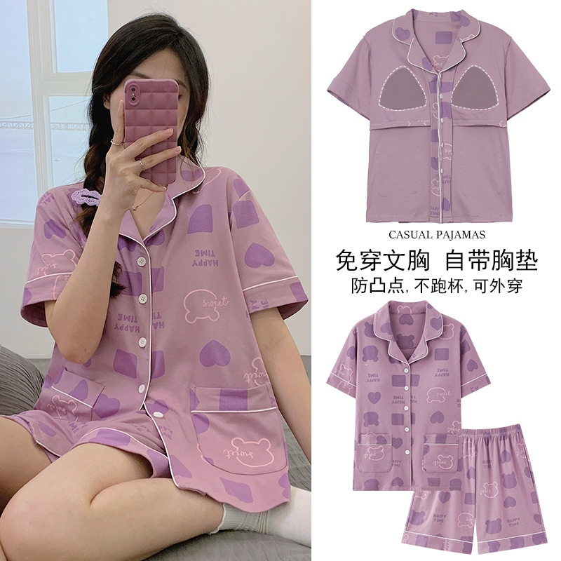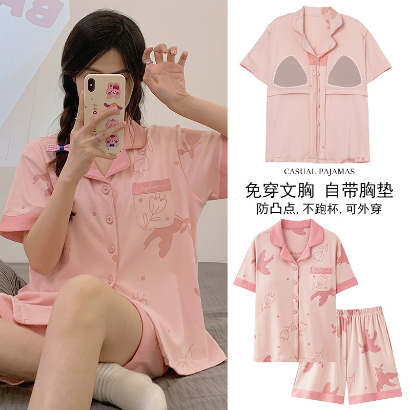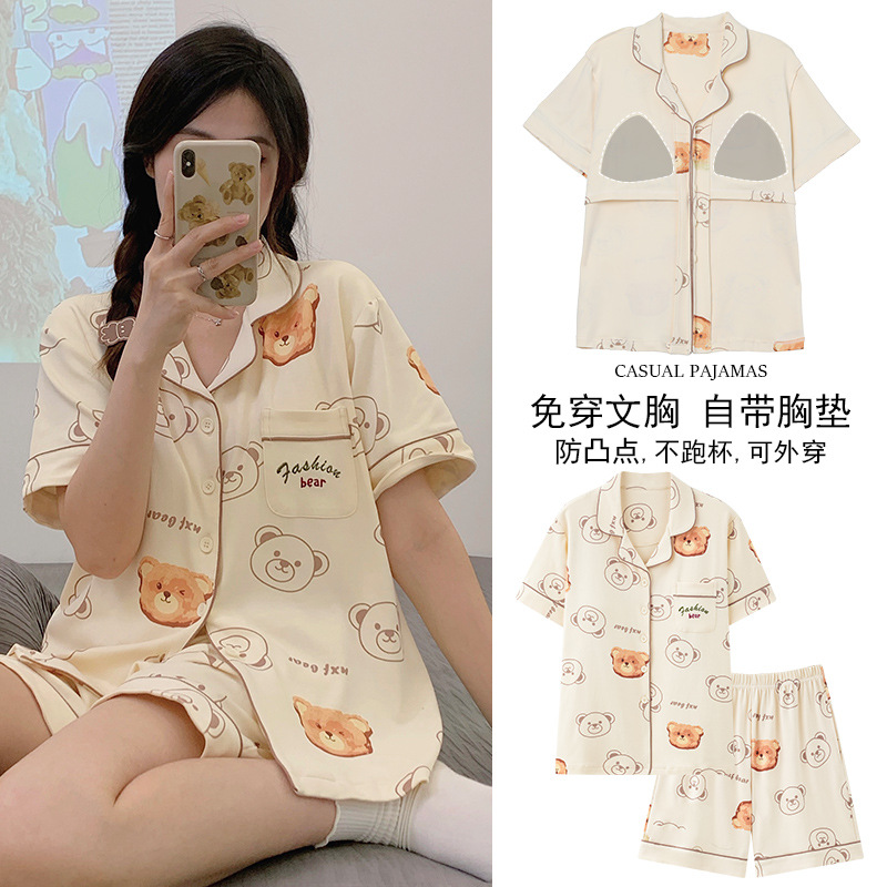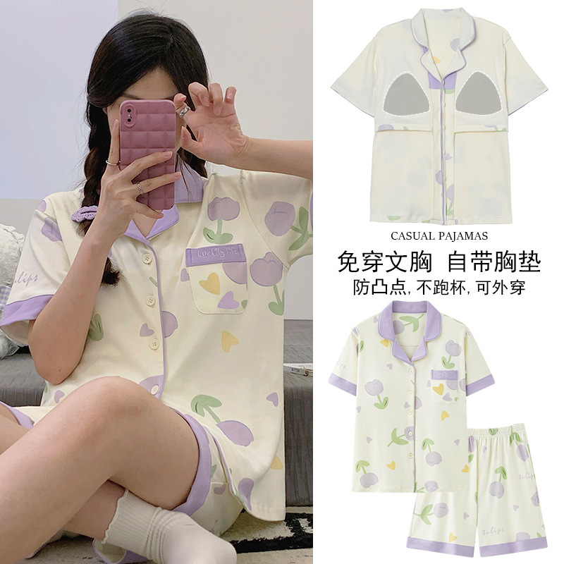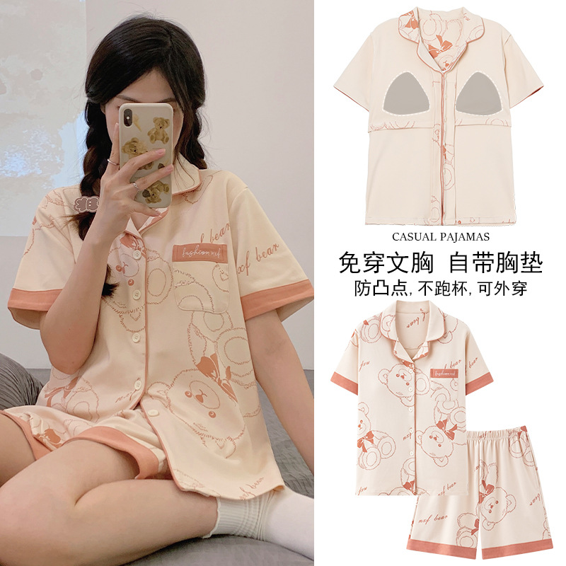 가슴 패드가 달린 코튼 파자마 여성 여름 반팔 반바지 달콤한 카디건 안티 범프 여름 캐주얼 홈 의류 세트스토어 가기