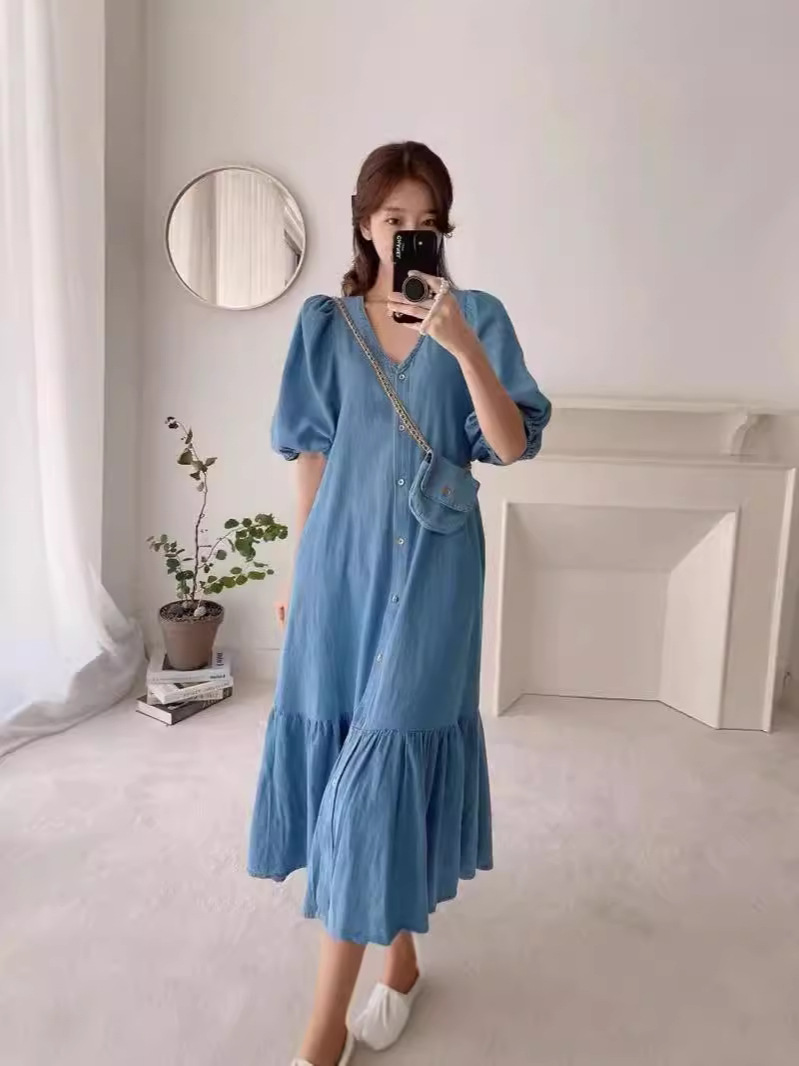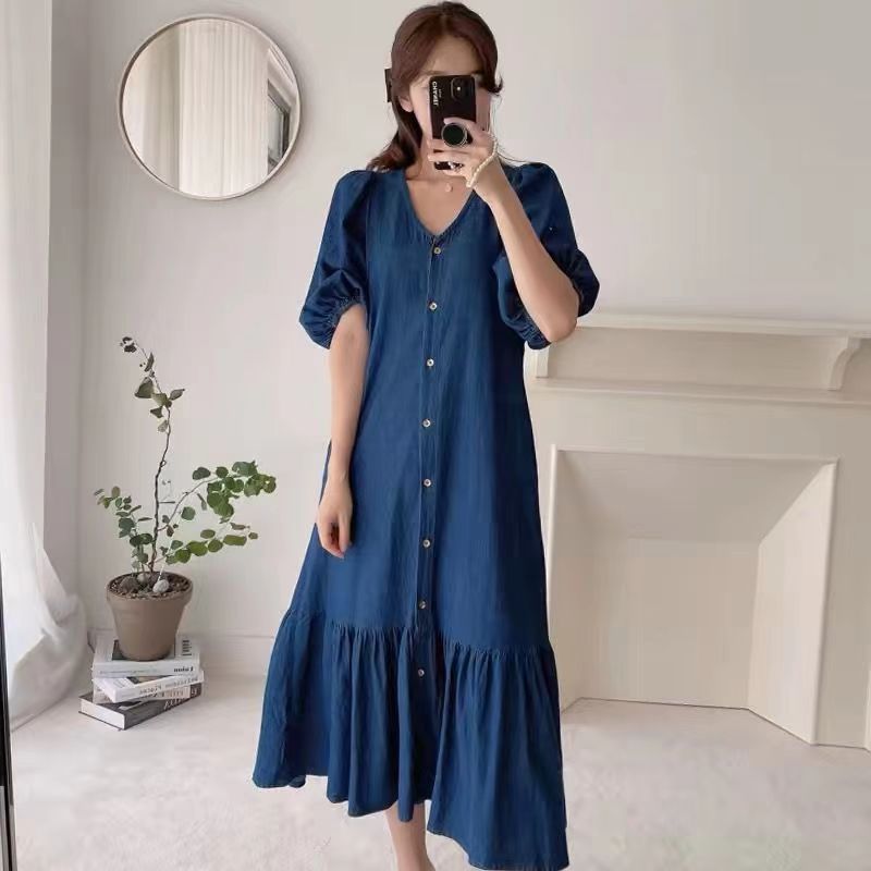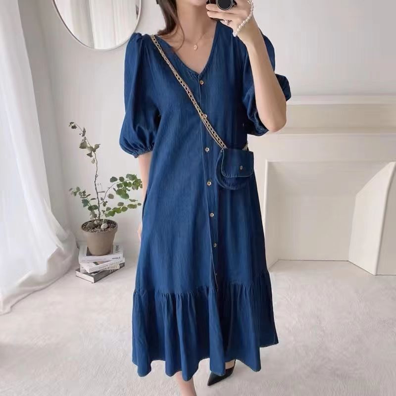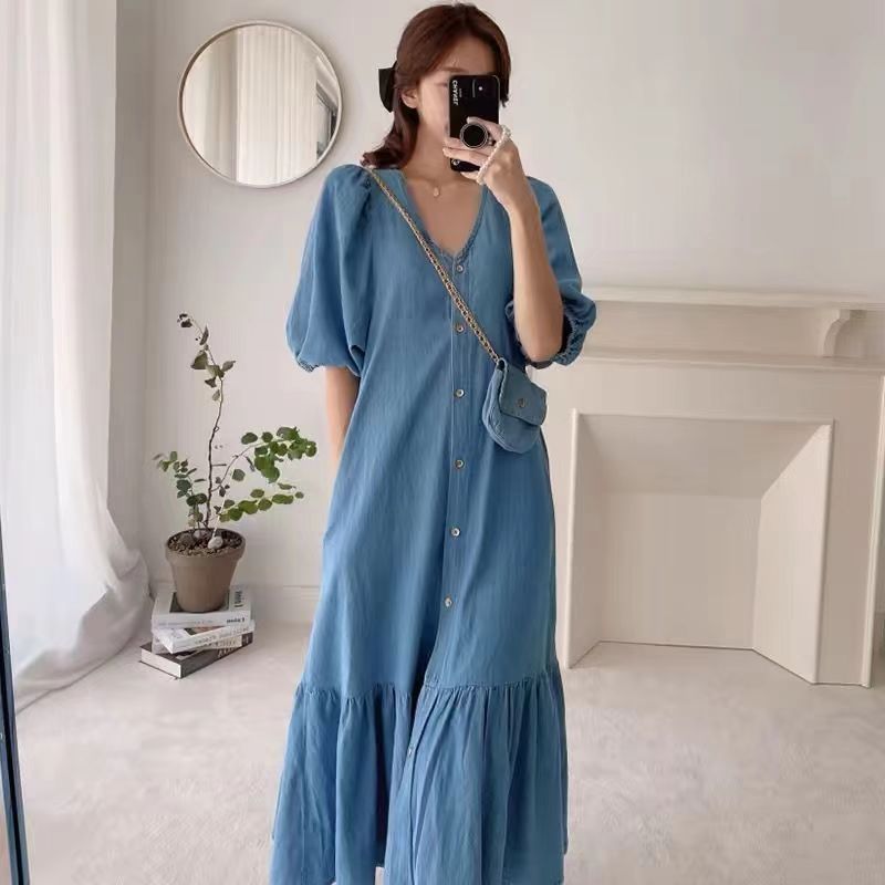 한국 세련된 여름 빈티지 틈새 V-넥 싱글 브레스트 느슨한 캐주얼 러플 반팔 모방 데님 원피스스토어 가기