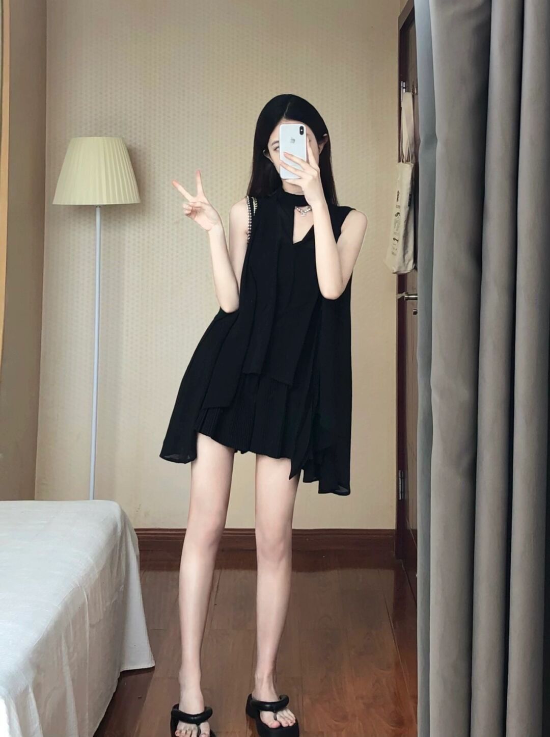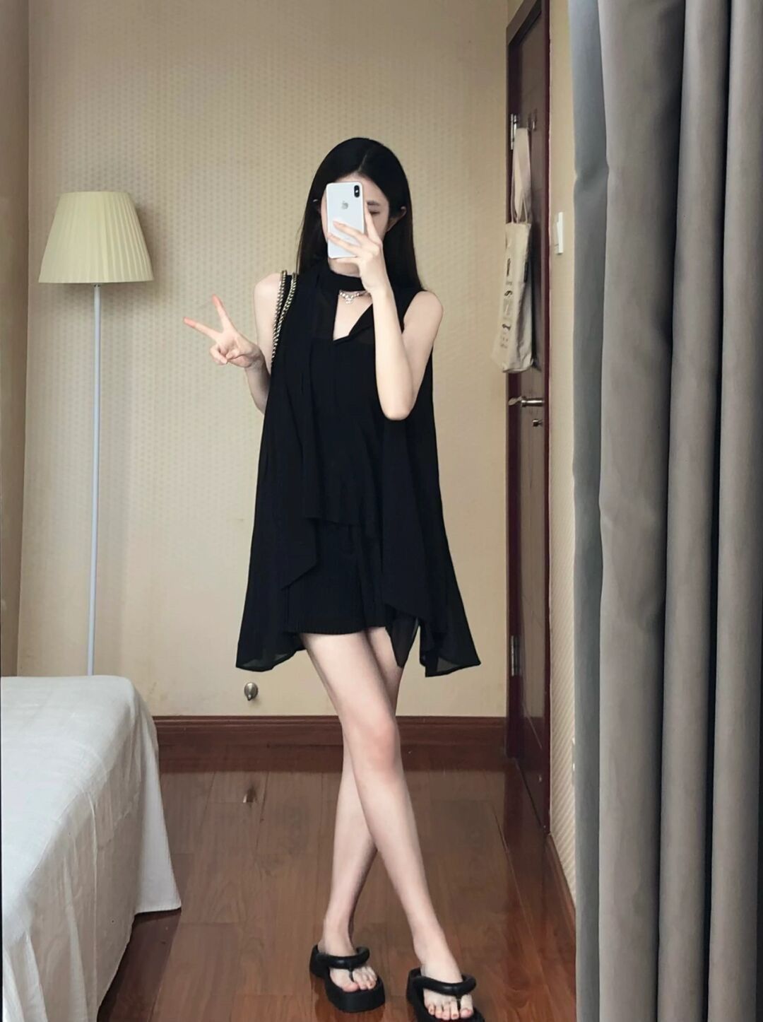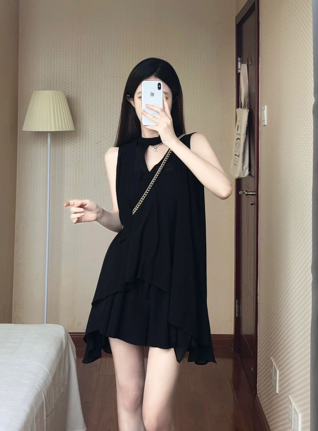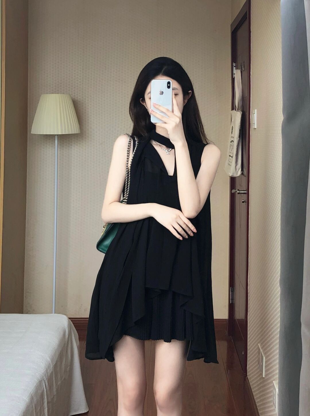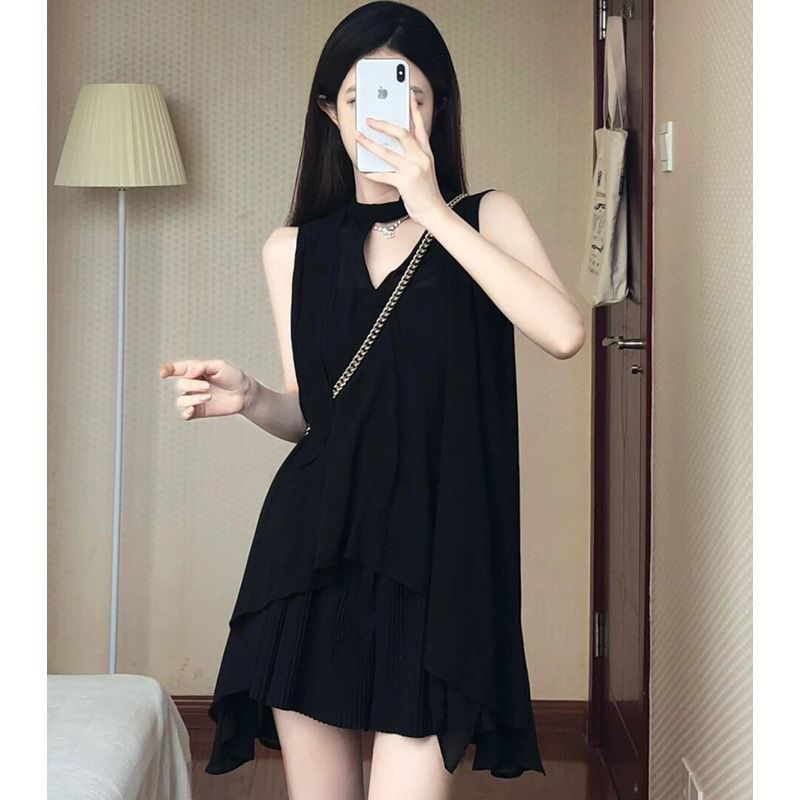프랑스 고급 기질 아름다운 슬리밍 로얄 자매 스타일 느슨한 쉬폰 홀터 스트랩 원피스 흑인 여성의 여름스토어 가기