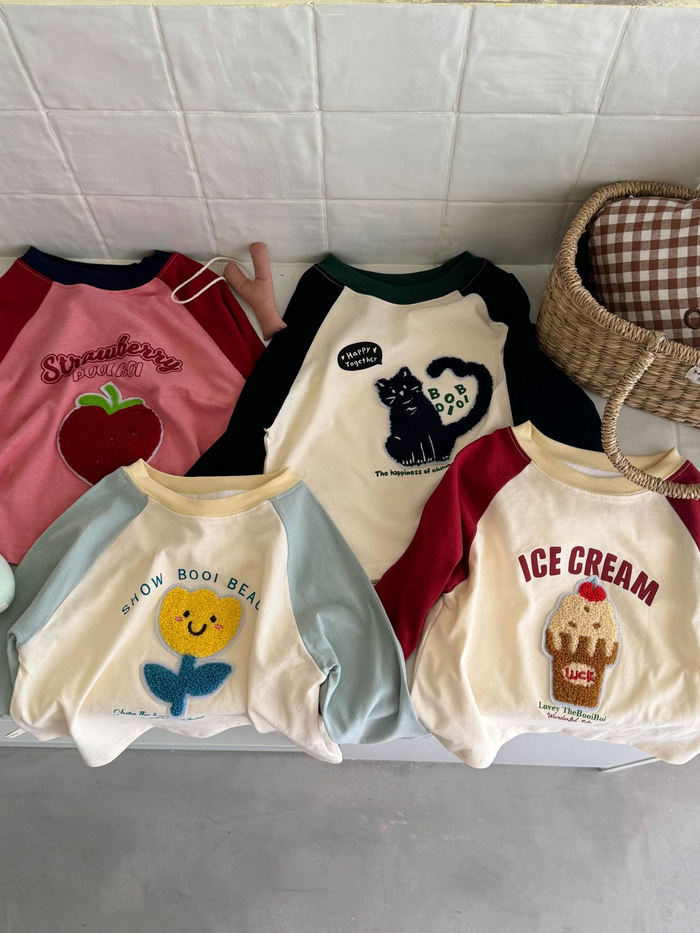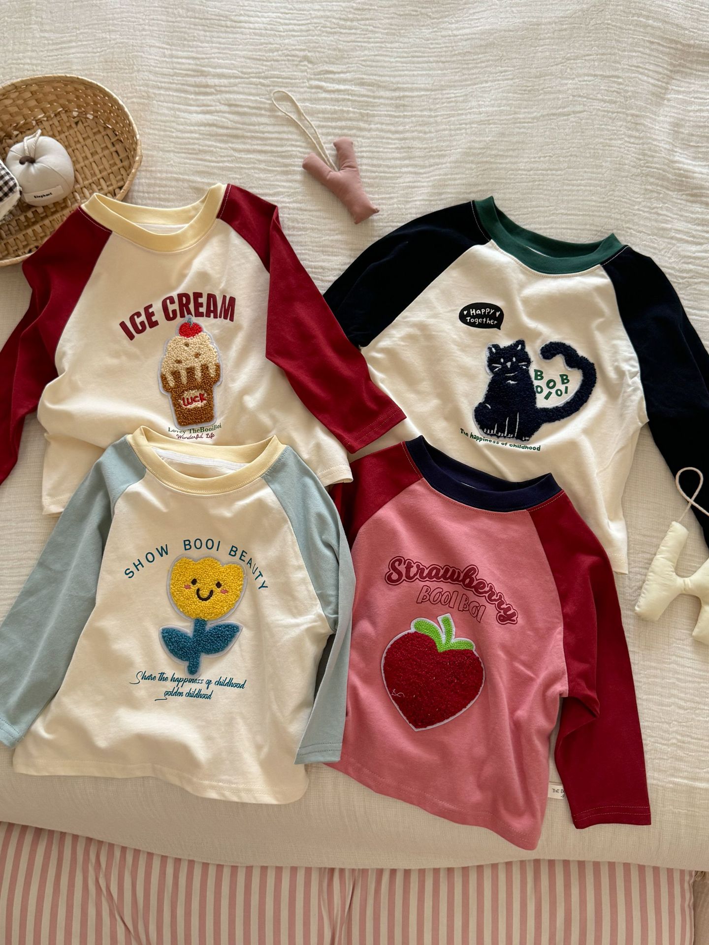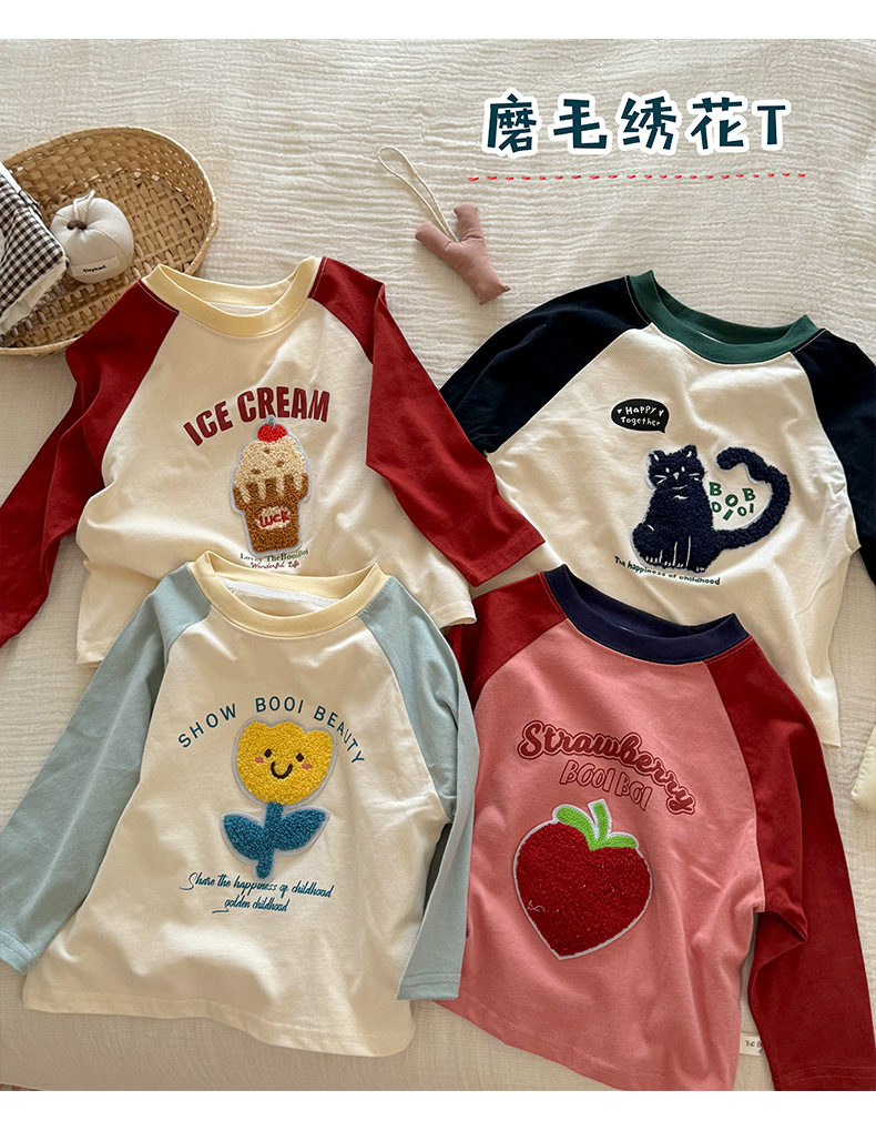 밀밭 시즌 어린이 라벨링 컬러 매칭 샌딩 베이스 셔츠 소년과 소녀 귀여운 라글란 소매 긴팔 티셔츠 탑스토어 가기