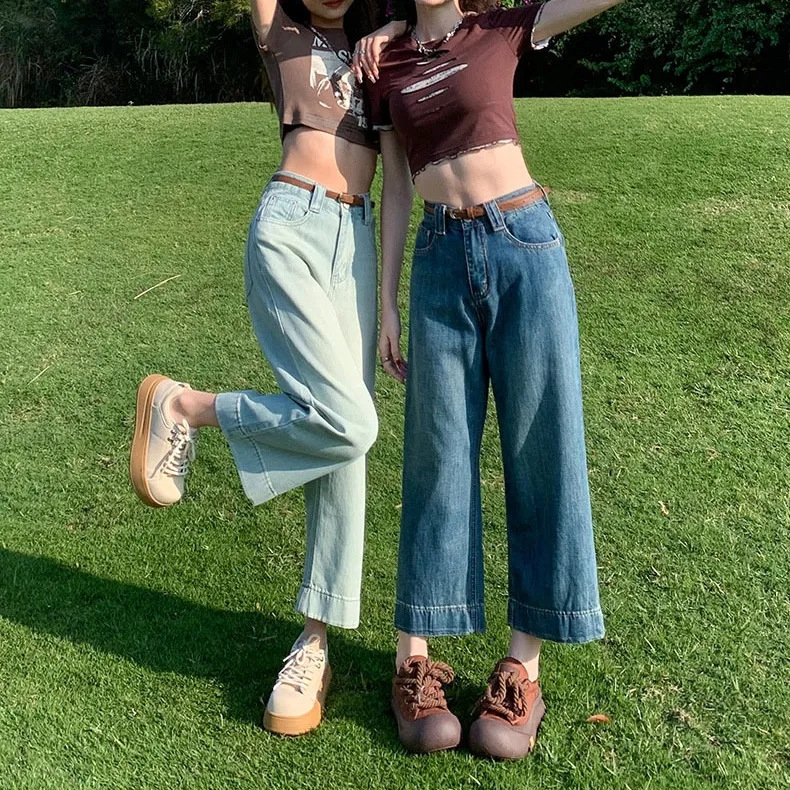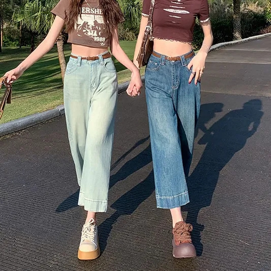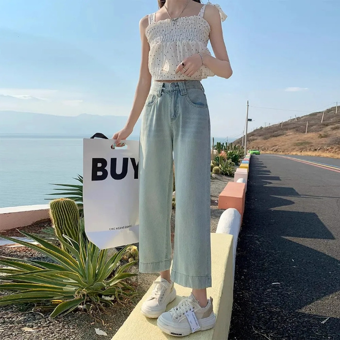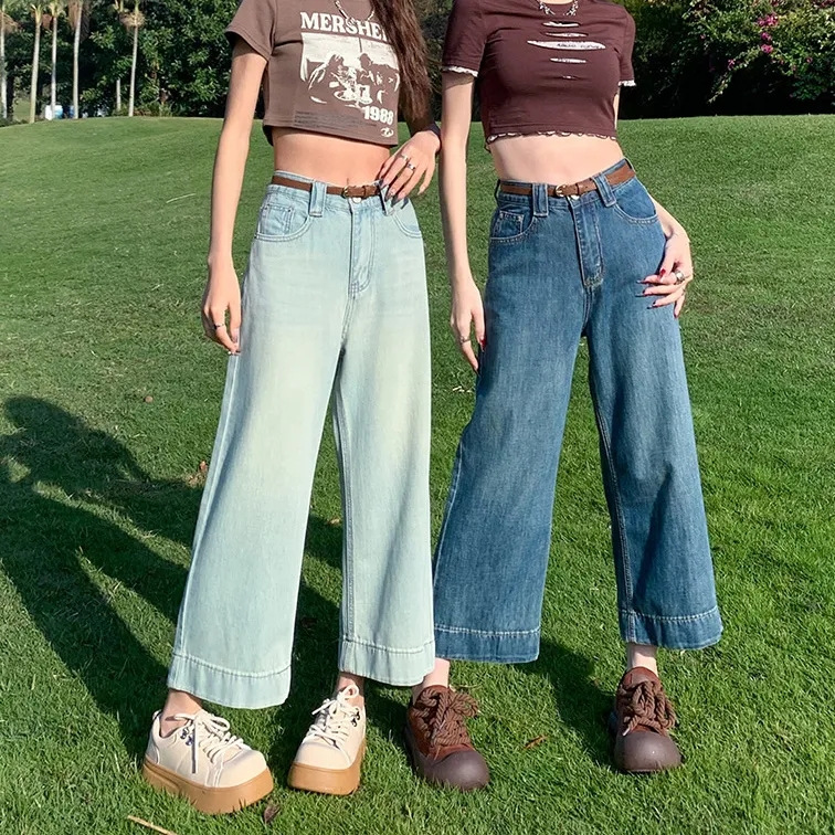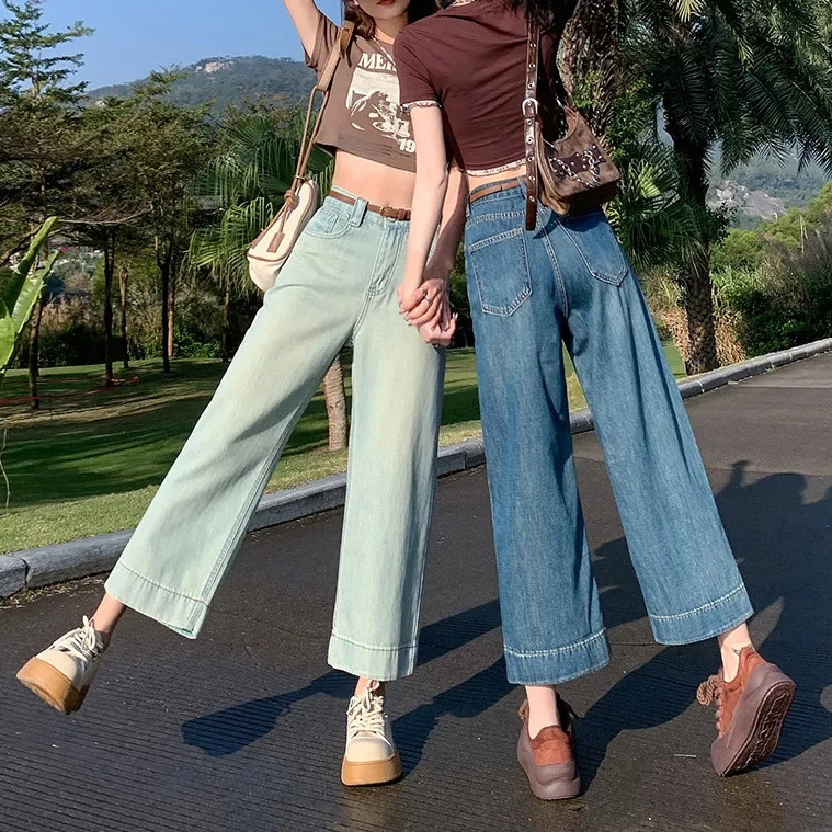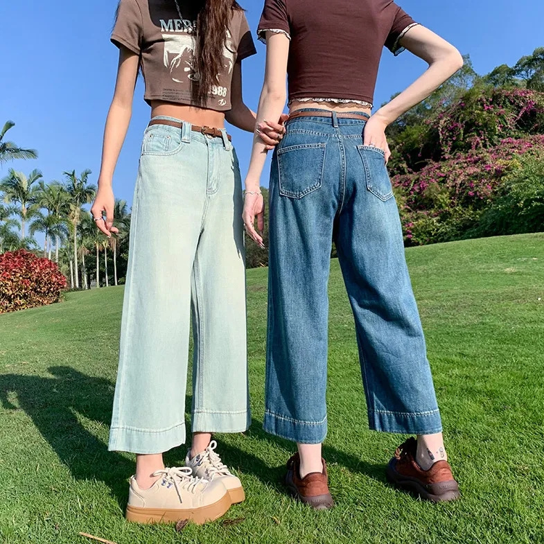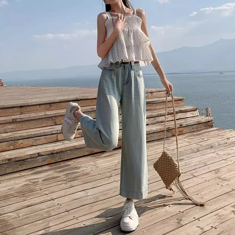 2024 여름 얇은 아이스 실크 넓은 다리 청바지 여성용 달빛 블루 할머니 바지 9 점 작은 스트레이트 바지 트렌디스토어 가기
