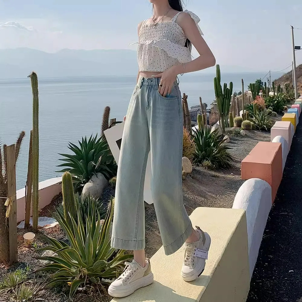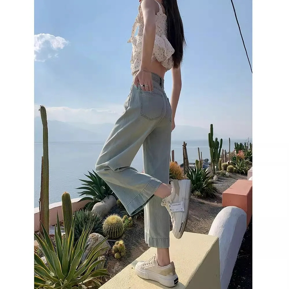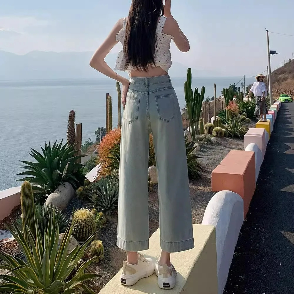 2024 여름 얇은 아이스 실크 넓은 다리 청바지 여성용 달빛 블루 할머니 바지 9 점 작은 스트레이트 바지 트렌디