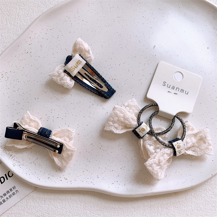 어린이 데님 명암 활 머리띠 옆 BB 클립 소녀 원단 할로우 자수 꽃 머리 밧줄