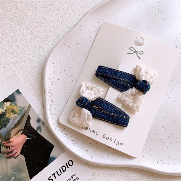 어린이 데님 명암 활 머리띠 옆 BB 클립 소녀 원단 할로우 자수 꽃 머리 밧줄스토어 가기
