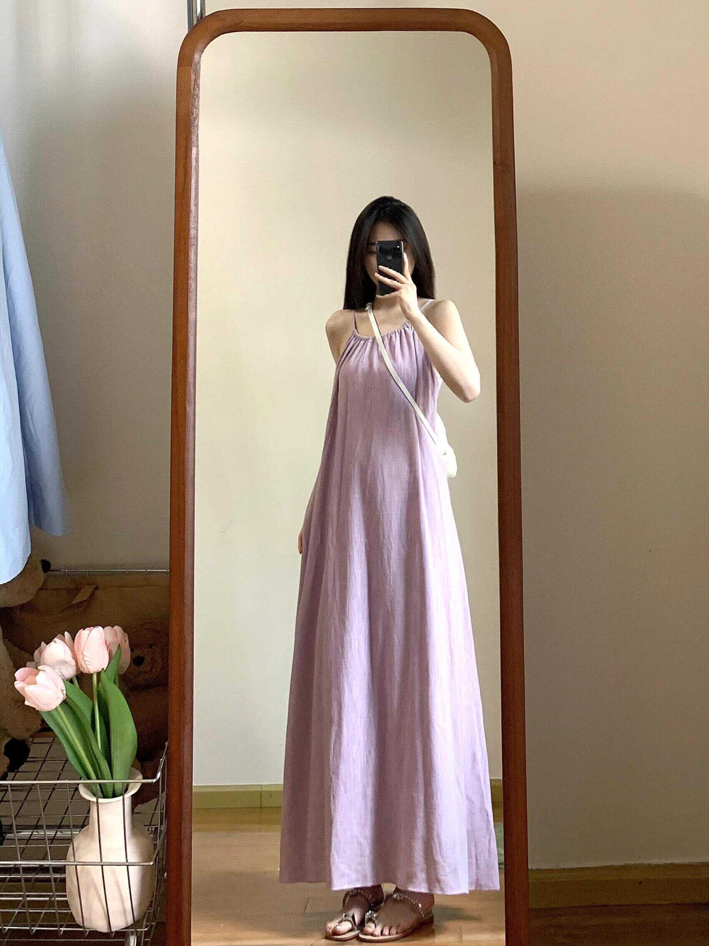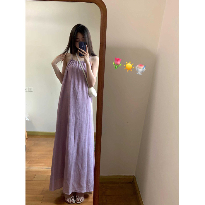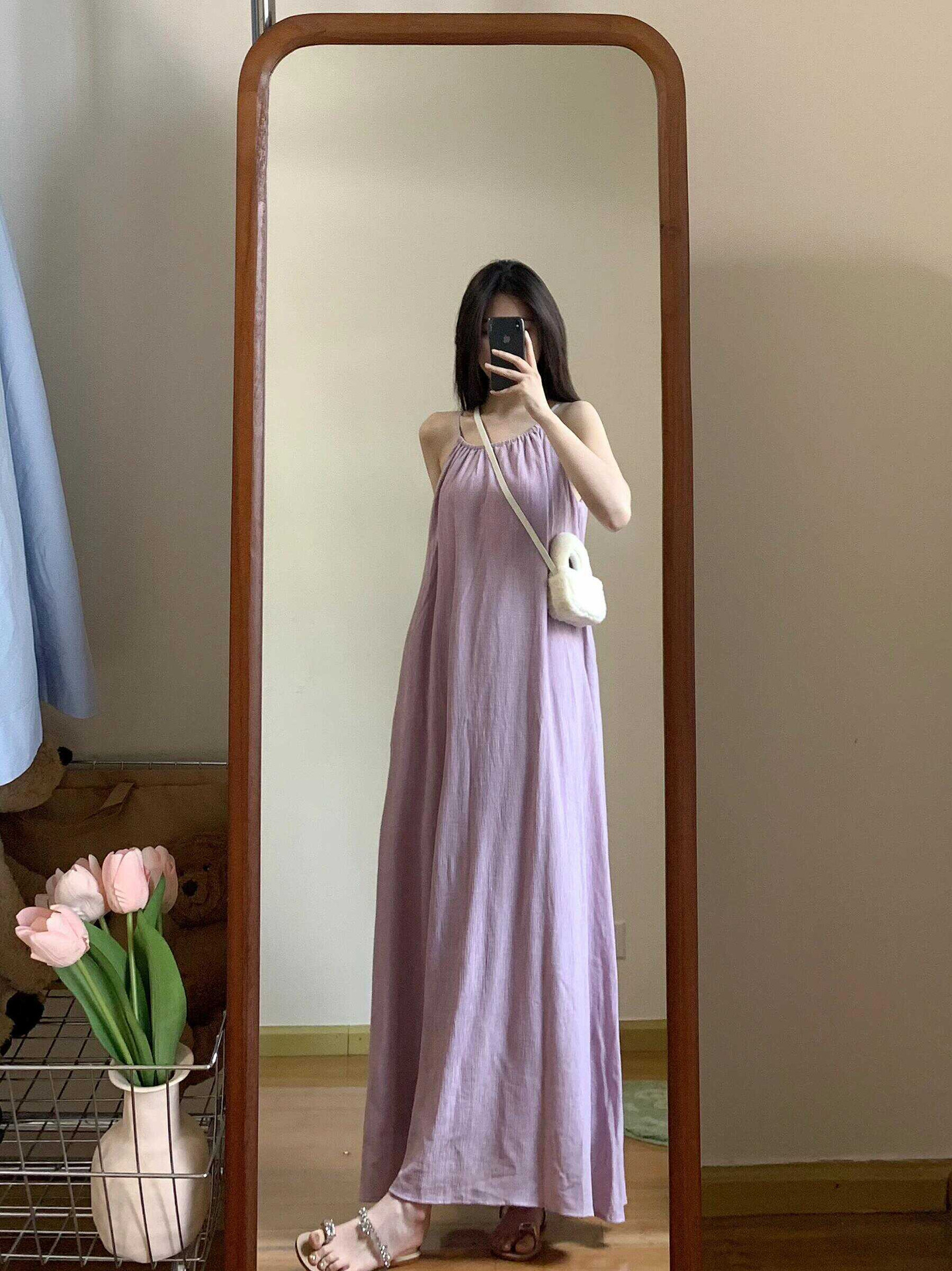 보라색 느슨한 스트랩 원피스 여성 여름 2024 새로운 휴가 젠틀 롱 원피스 세련된 민소매 A 라인 원피스스토어 가기