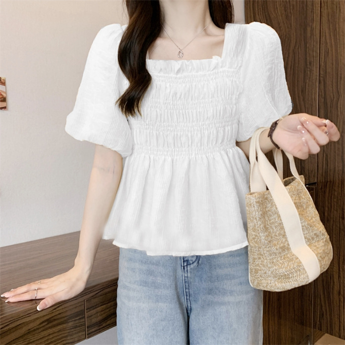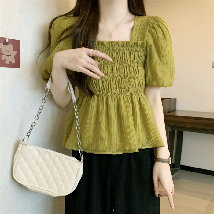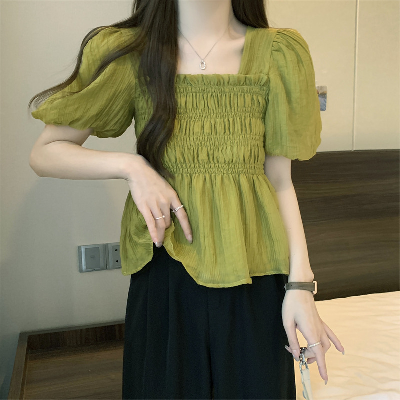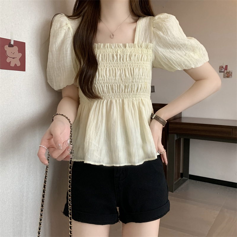 프랑스 스타일 스퀘어 칼라 반팔 쉬폰 셔츠 여성의 여름 새로운 디자인 센스 니쉬 쇼트 탑 벨리 커버 셔츠