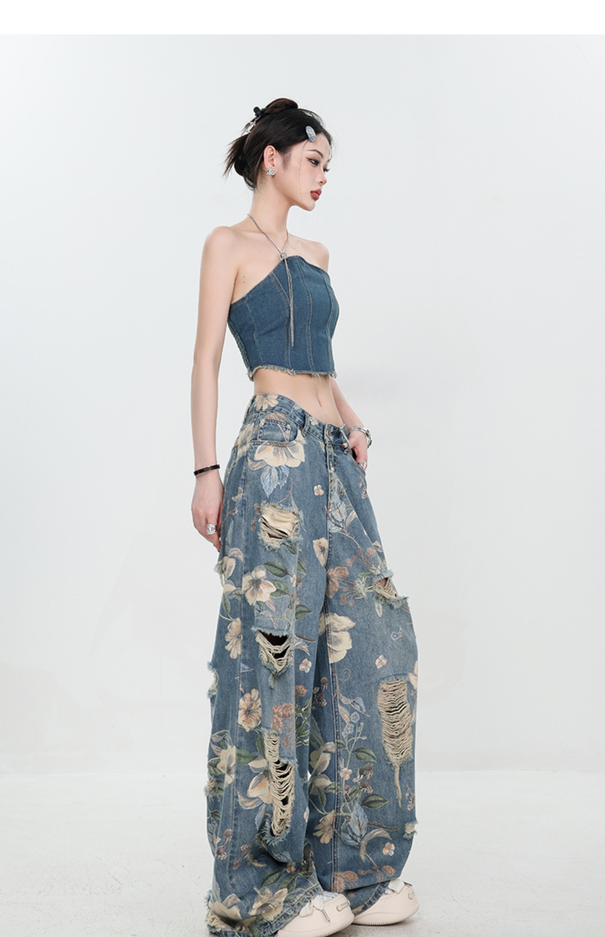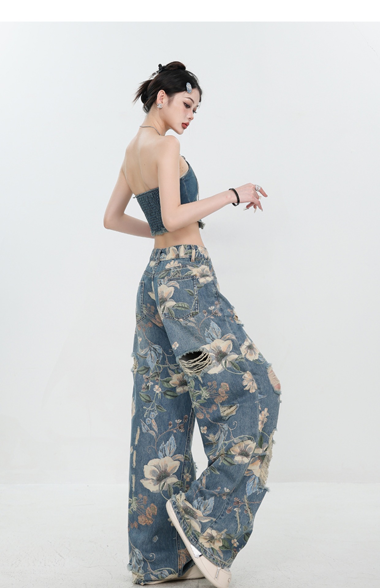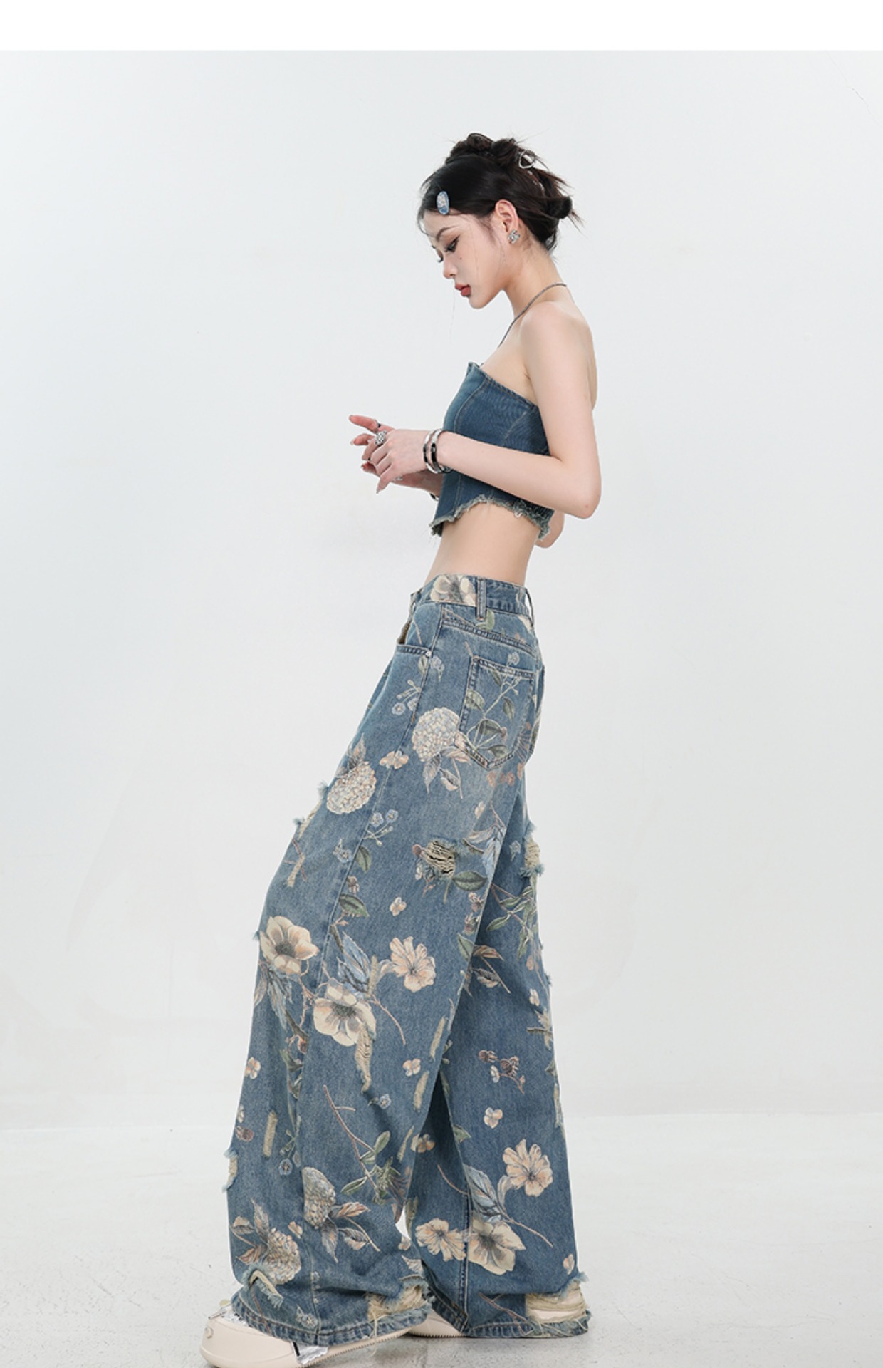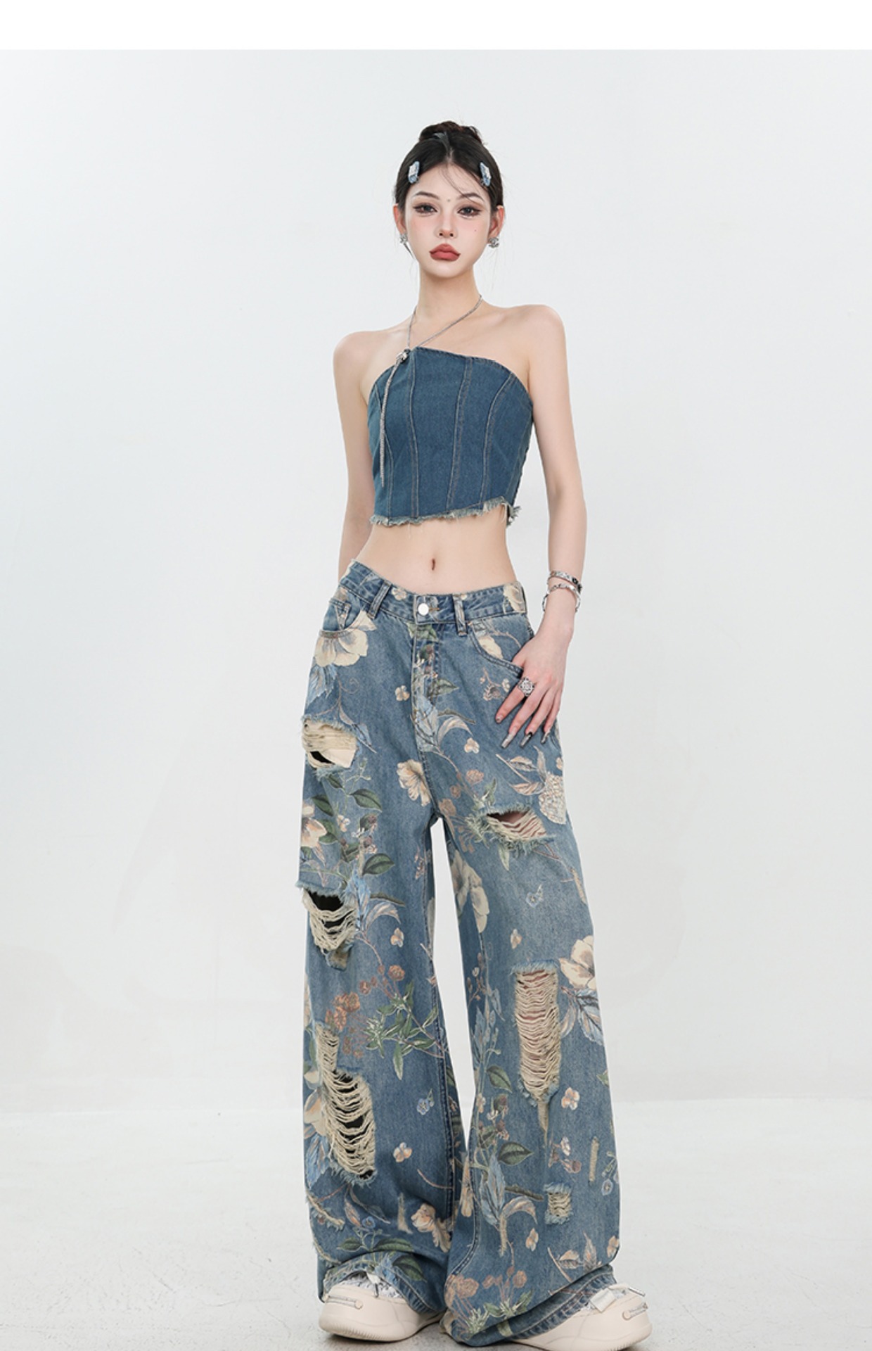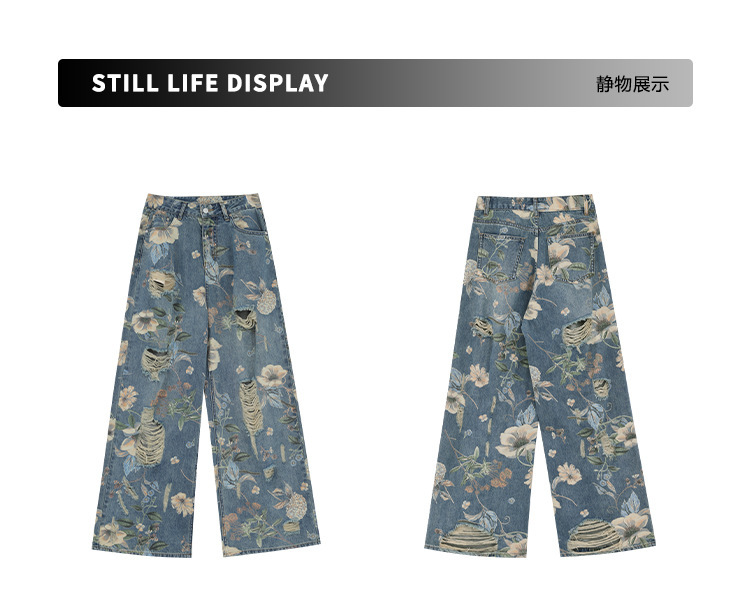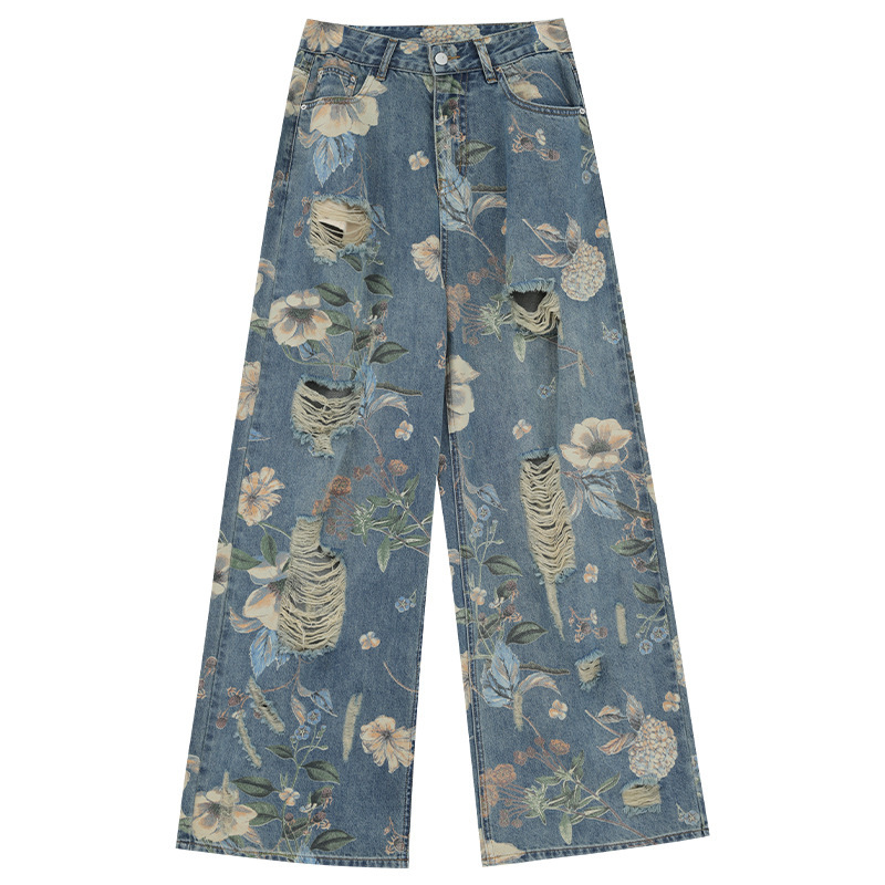 아메리칸 스타일 레트로 인쇄 된 찢어진 청바지 여성의 2024 여름 새로운 느슨한 스트레이트 긴 바지 넓은 다리스토어 가기