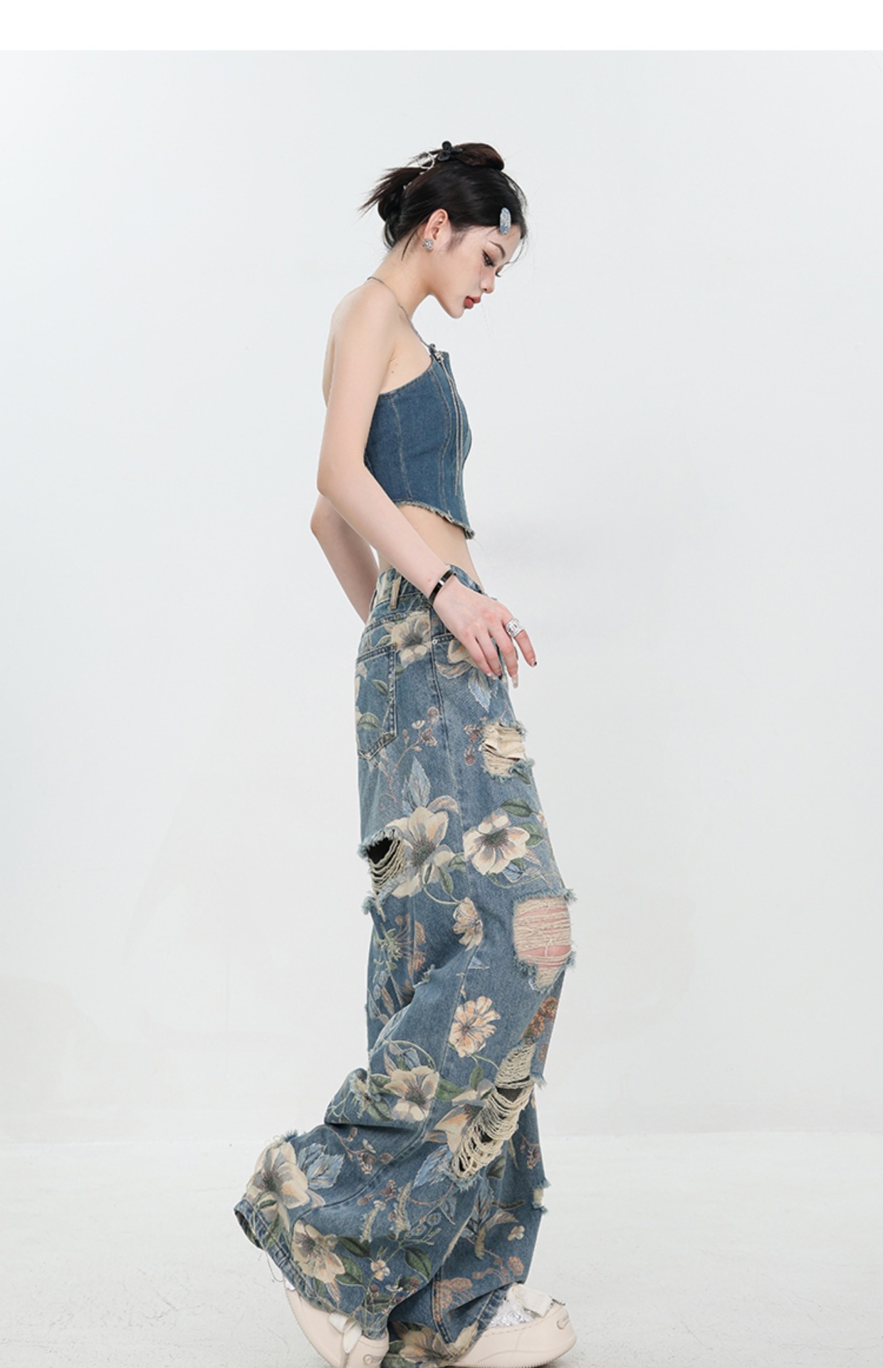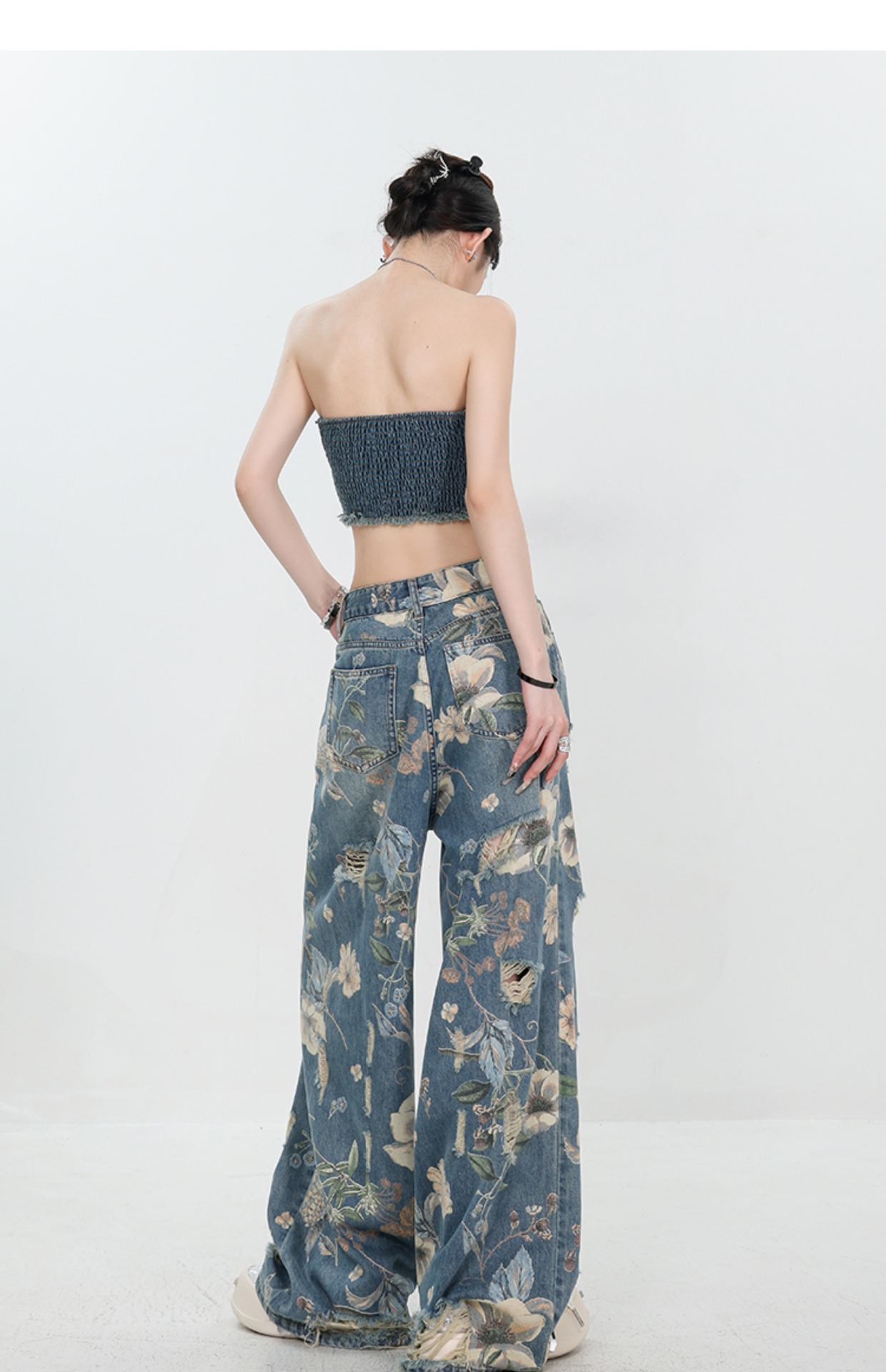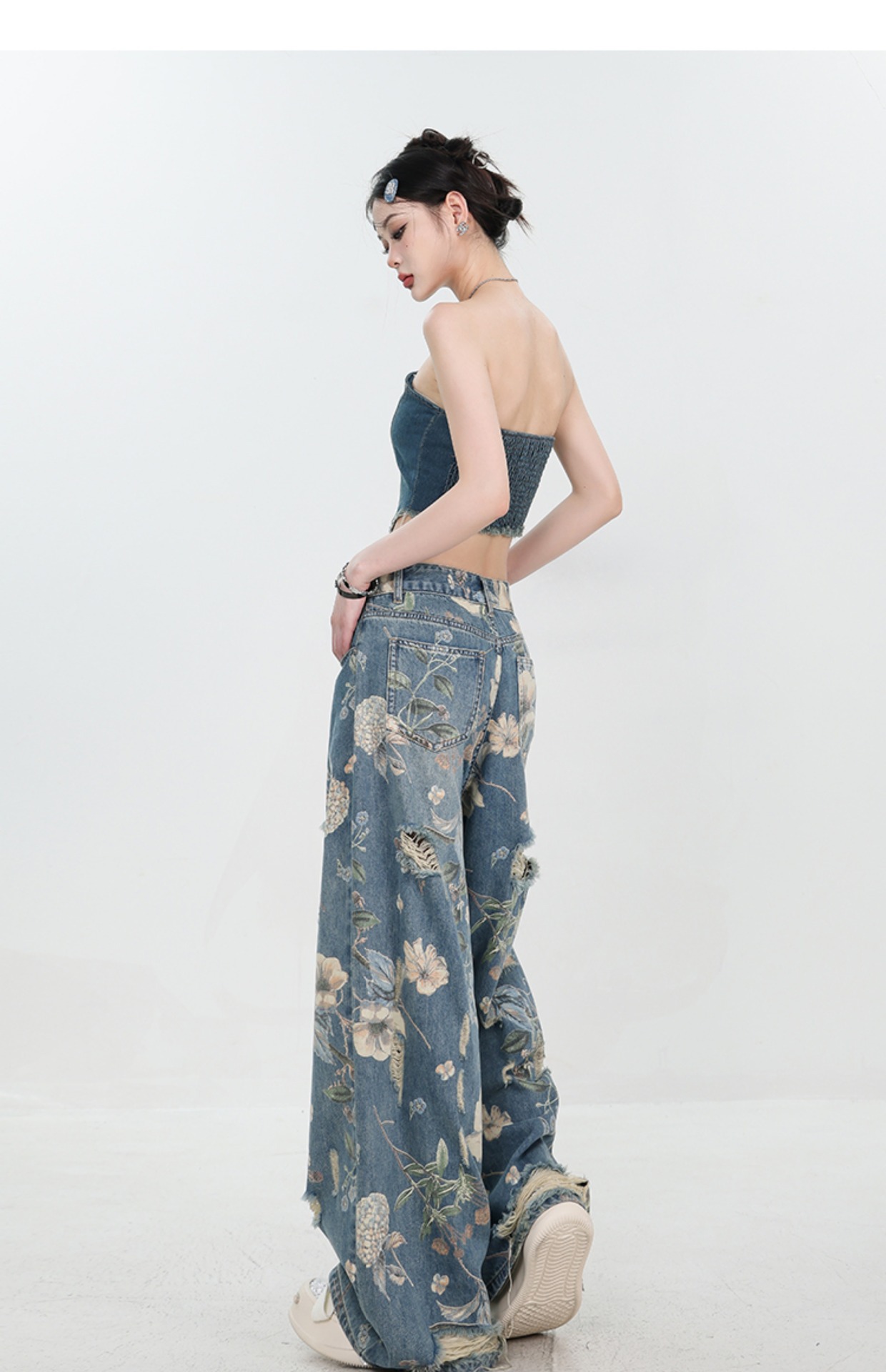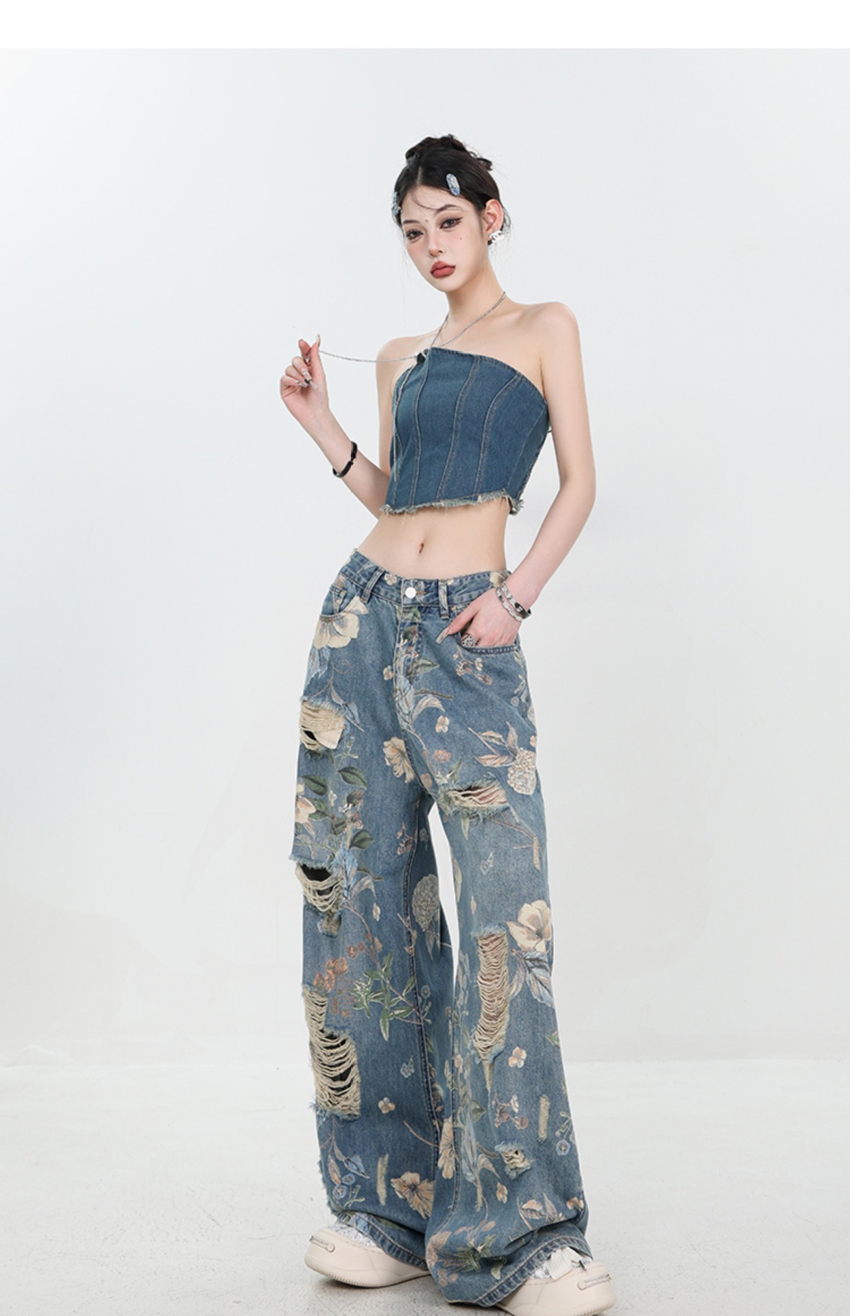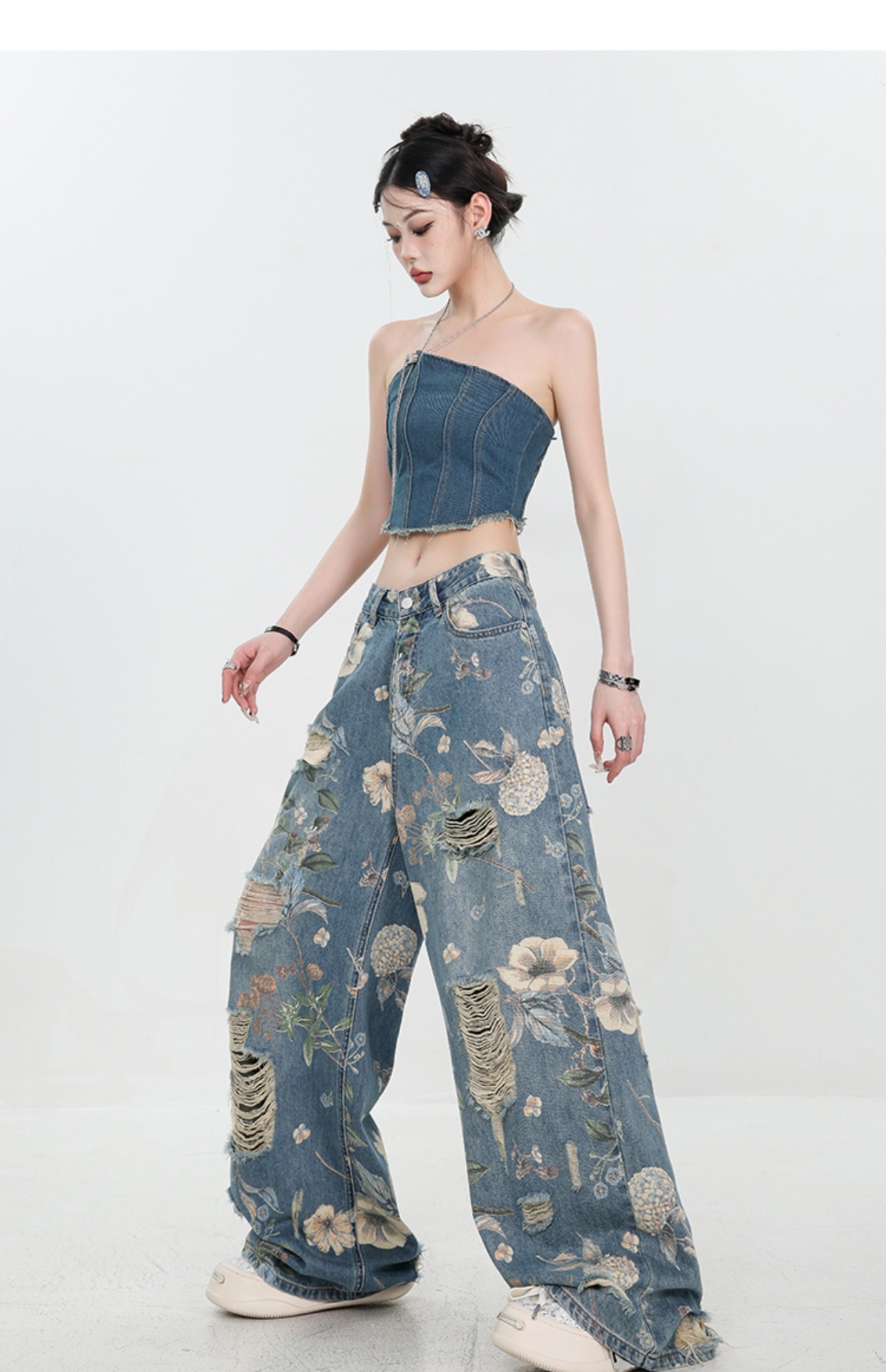 아메리칸 스타일 레트로 인쇄 된 찢어진 청바지 여성의 2024 여름 새로운 느슨한 스트레이트 긴 바지 넓은 다리스토어 가기