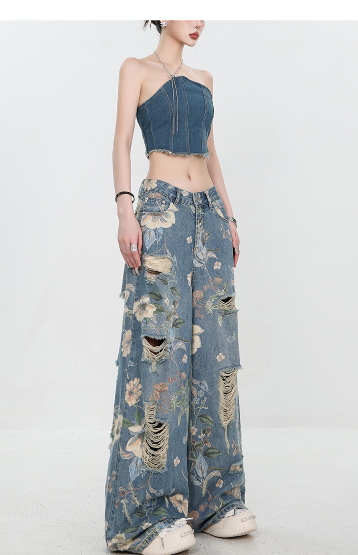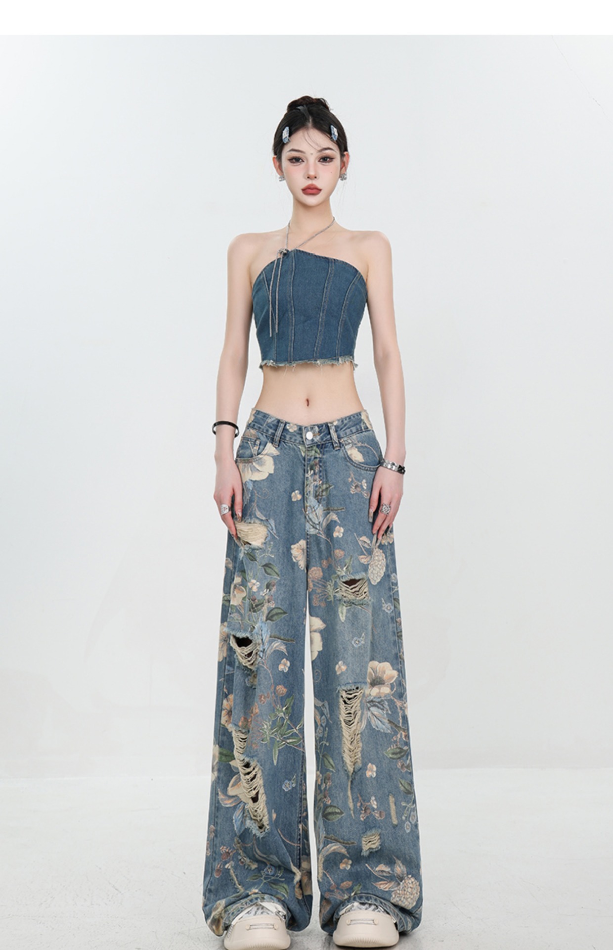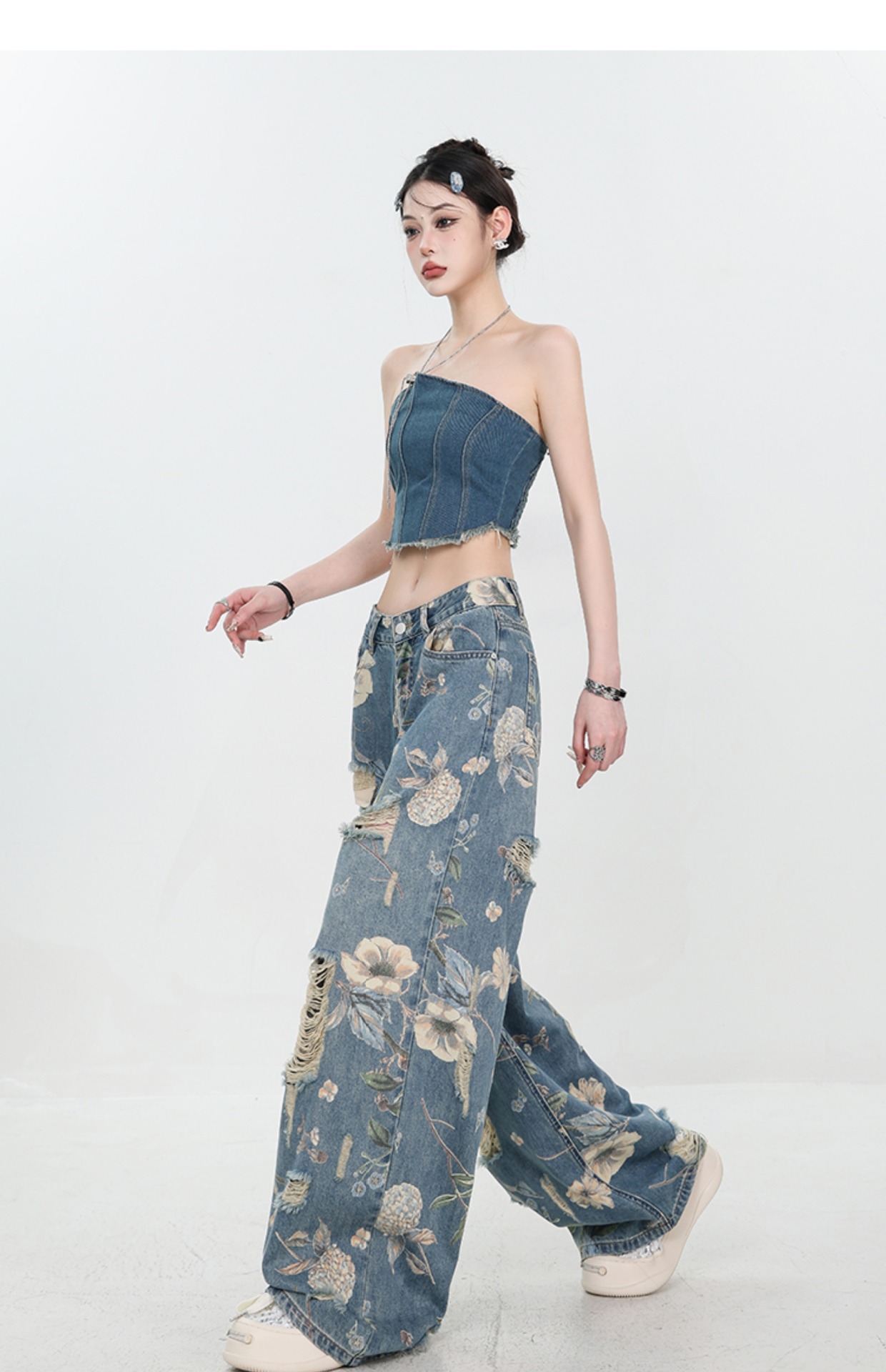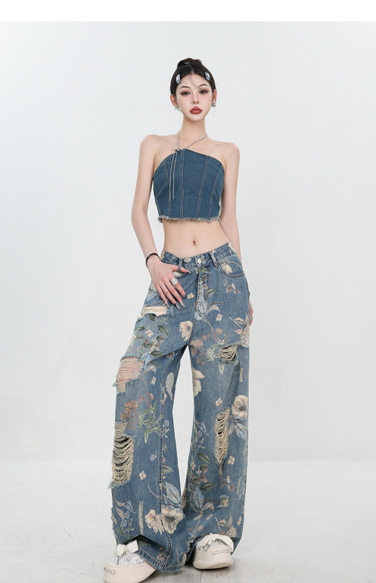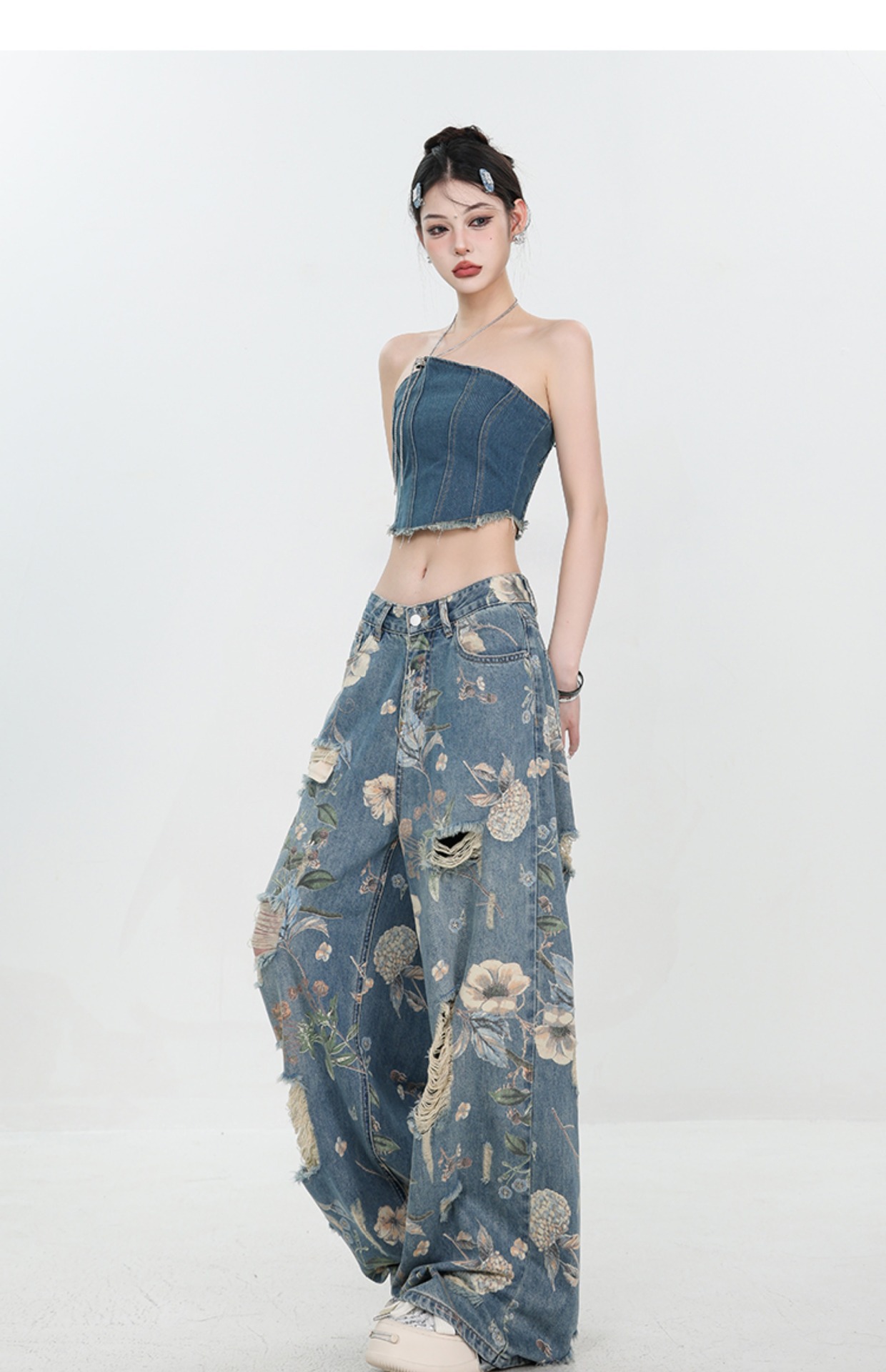 아메리칸 스타일 레트로 인쇄 된 찢어진 청바지 여성의 2024 여름 새로운 느슨한 스트레이트 긴 바지 넓은 다리스토어 가기