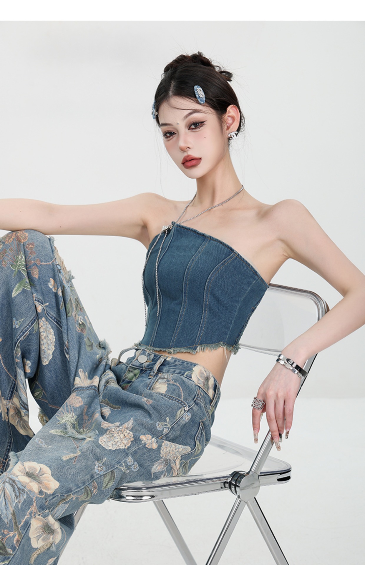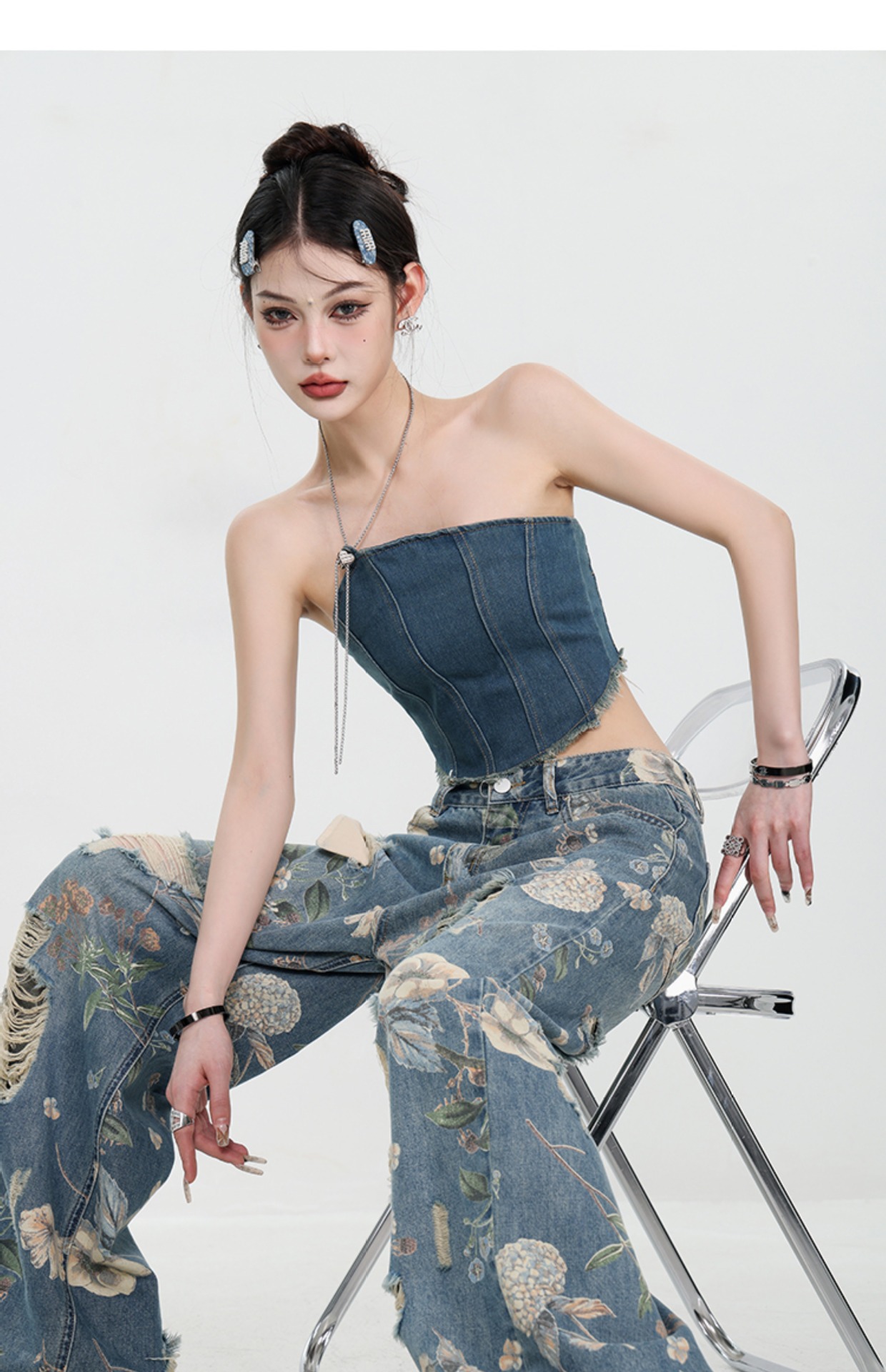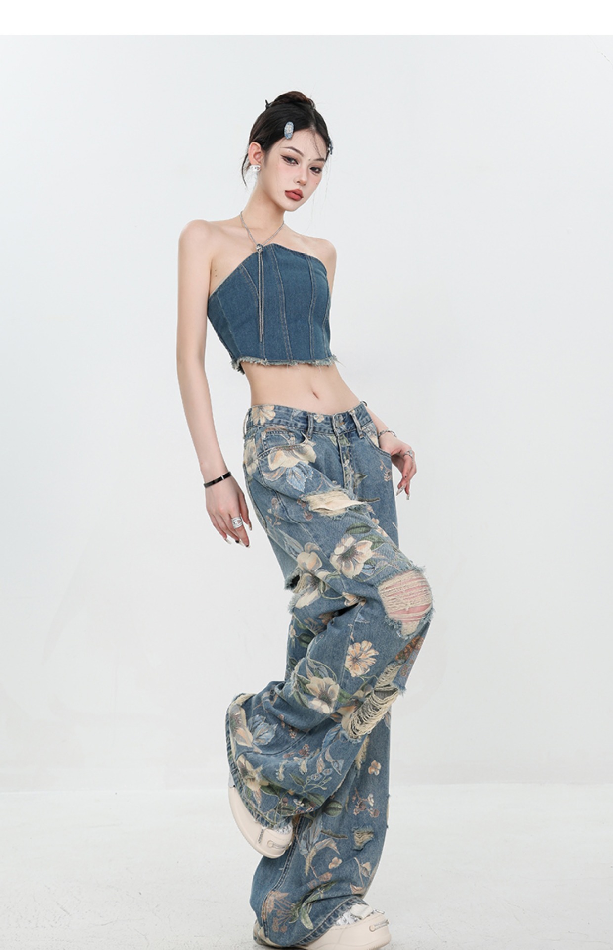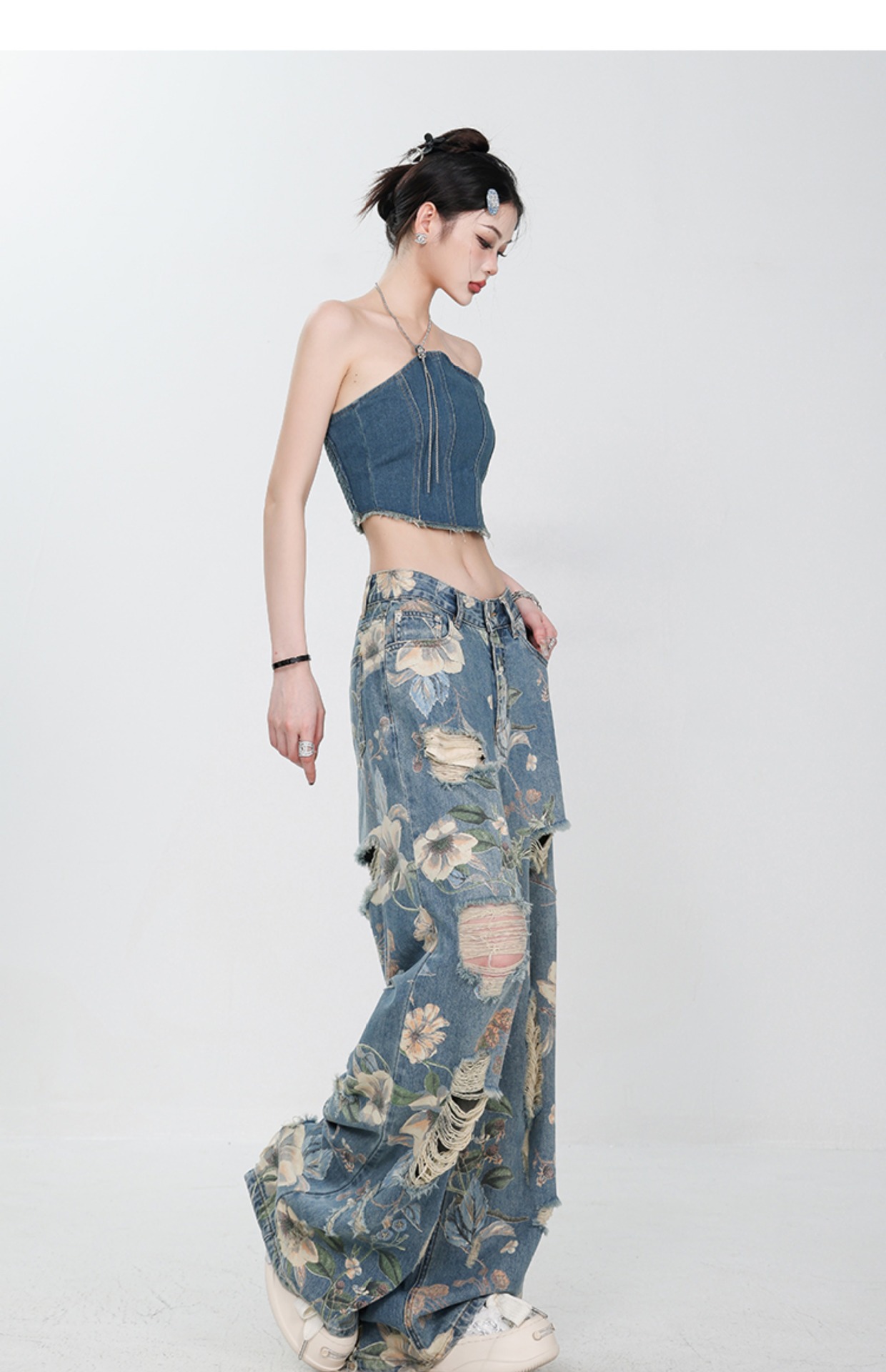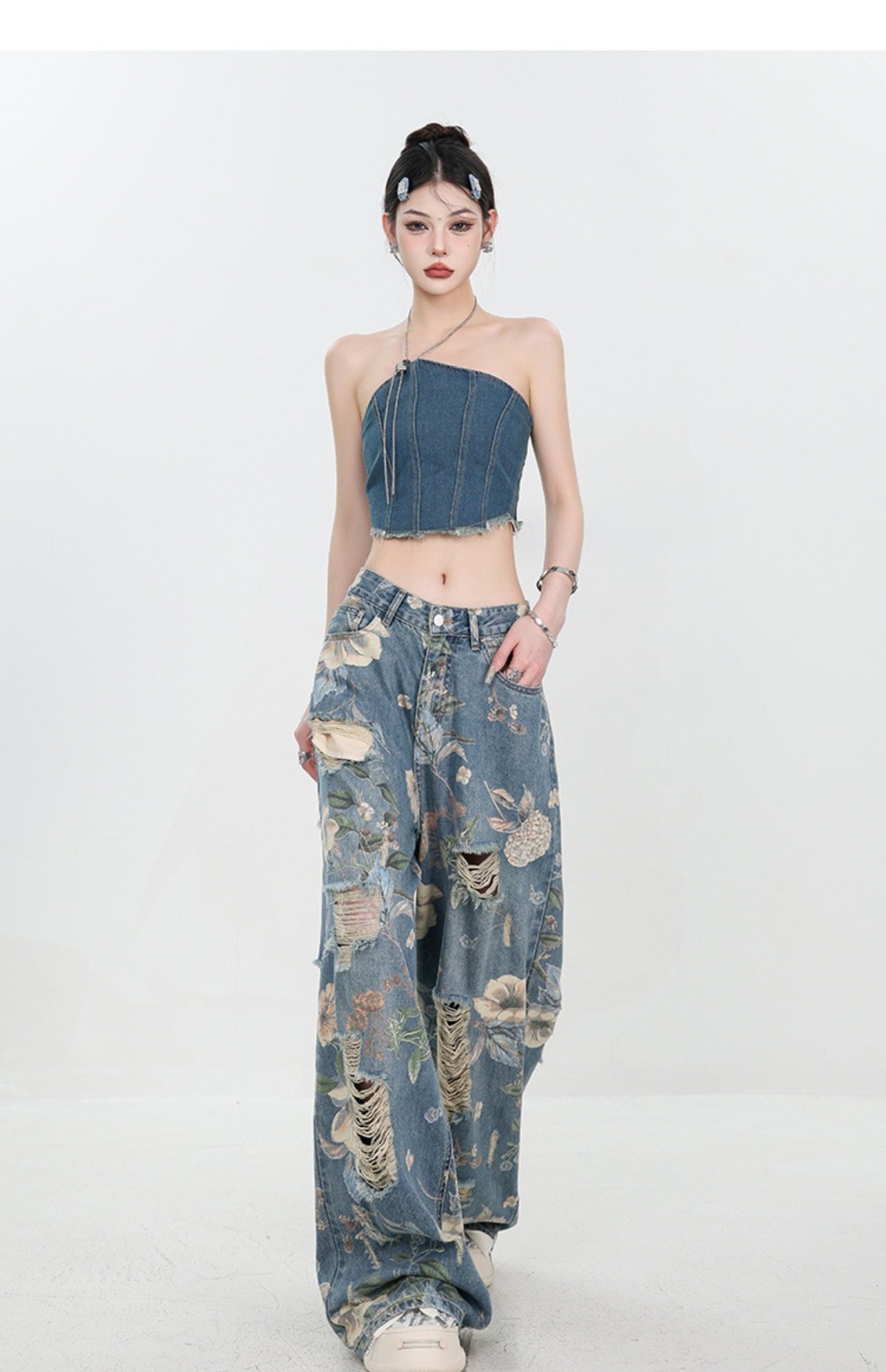 아메리칸 스타일 레트로 인쇄 된 찢어진 청바지 여성의 2024 여름 새로운 느슨한 스트레이트 긴 바지 넓은 다리스토어 가기