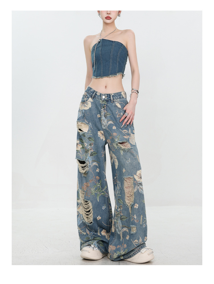 아메리칸 스타일 레트로 인쇄 된 찢어진 청바지 여성의 2024 여름 새로운 느슨한 스트레이트 긴 바지 넓은 다리